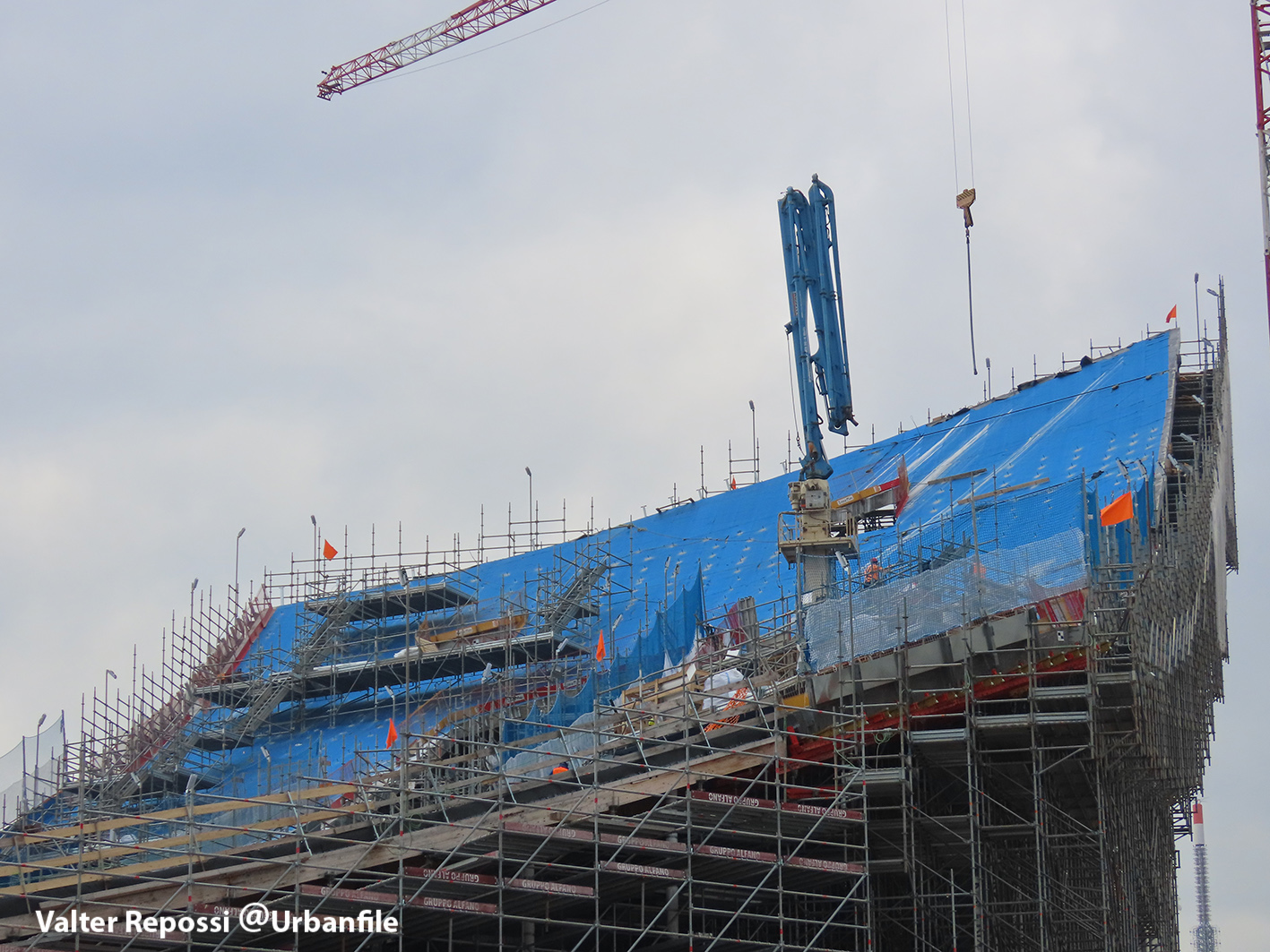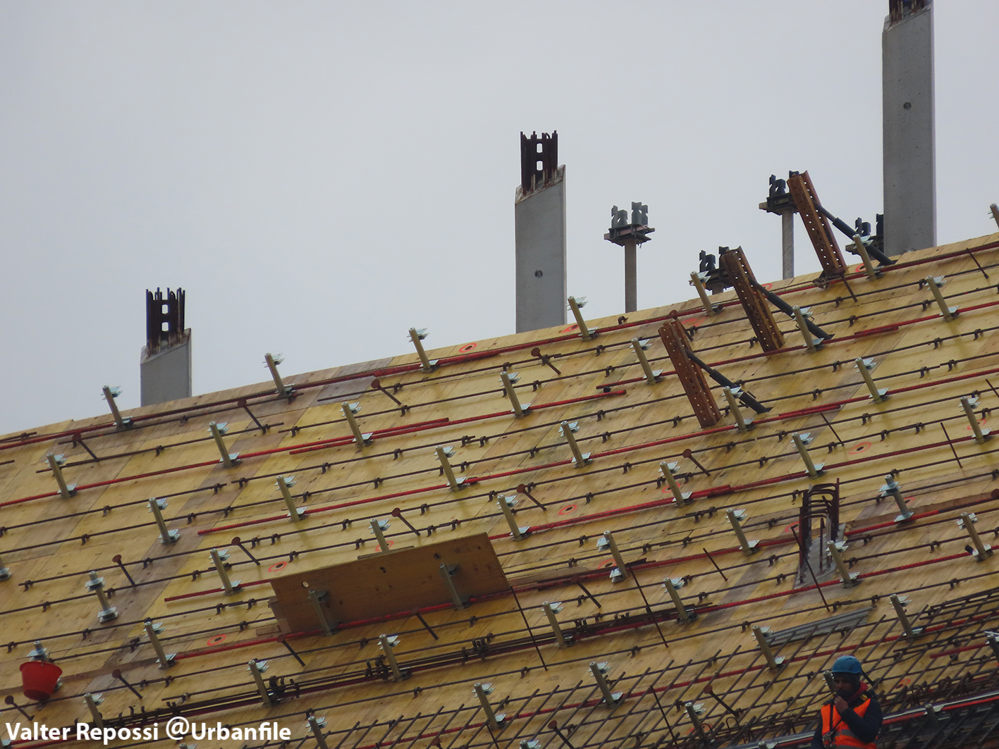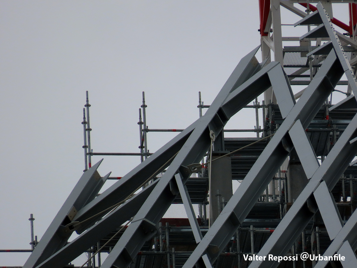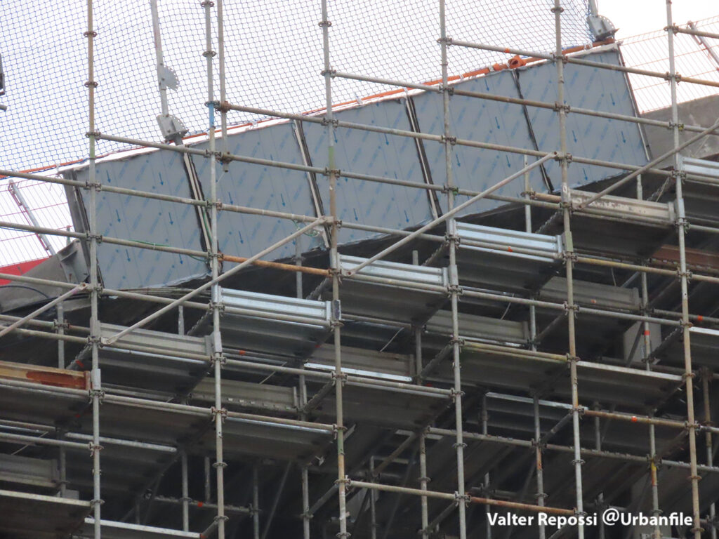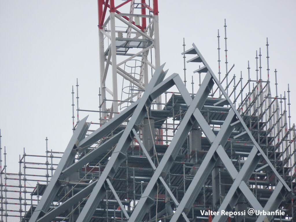 Proseguono i lavori alCityWave, oltre al montaggio delle vetrate delle facciate, anche quelli per completare la copertura del tetto e l’incredibile e complessa tettoia (canopy) che come un “telo” unirà le due torri del nuovo edificio per uffici in realizzazione nell’area verso largo Domodossola.