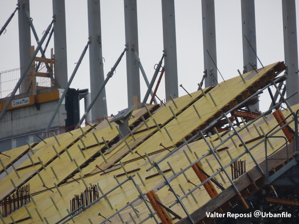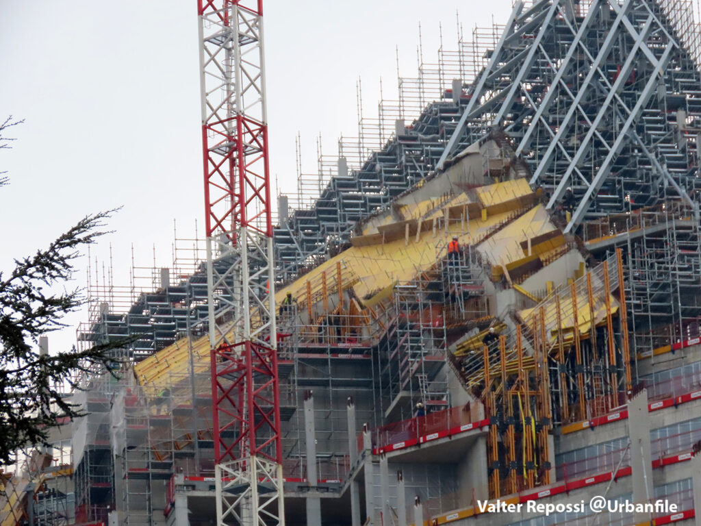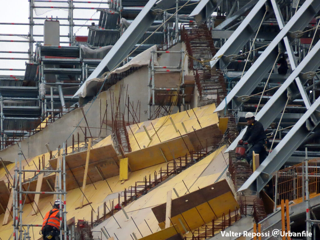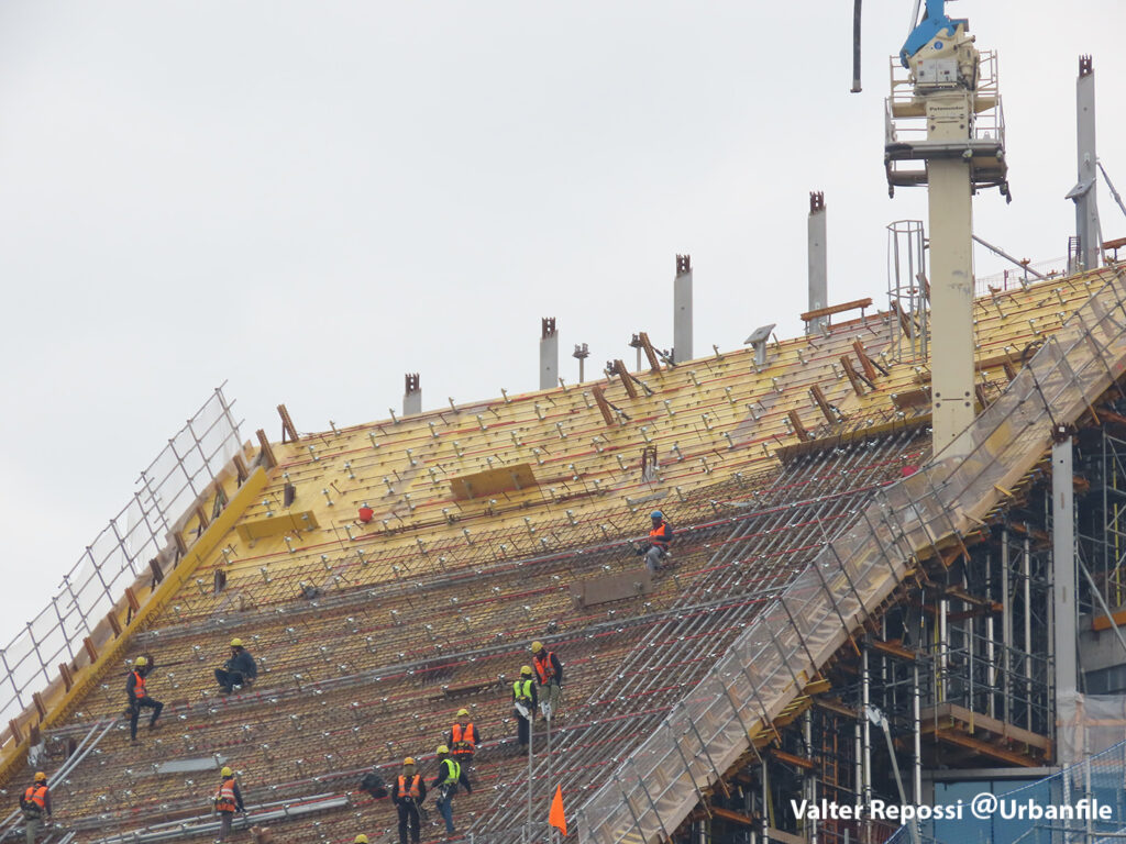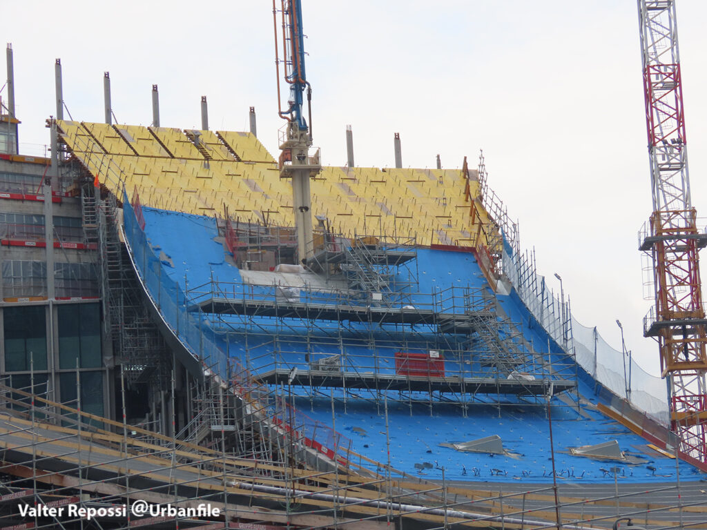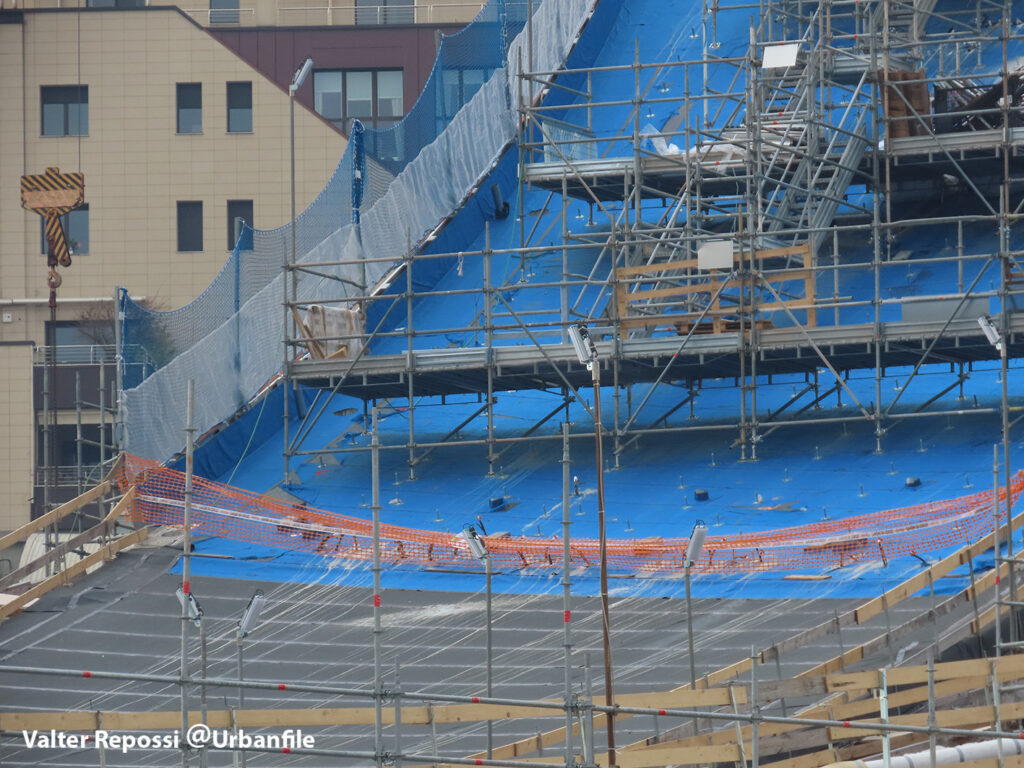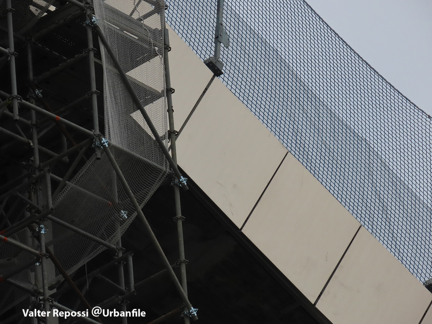 Proseguono i lavori alCityWave, oltre al montaggio delle vetrate delle facciate, anche quelli per completare la copertura del tetto e l’incredibile e complessa tettoia (canopy) che come un “telo” unirà le due torri del nuovo edificio per uffici in realizzazione nell’area verso largo Domodossola.