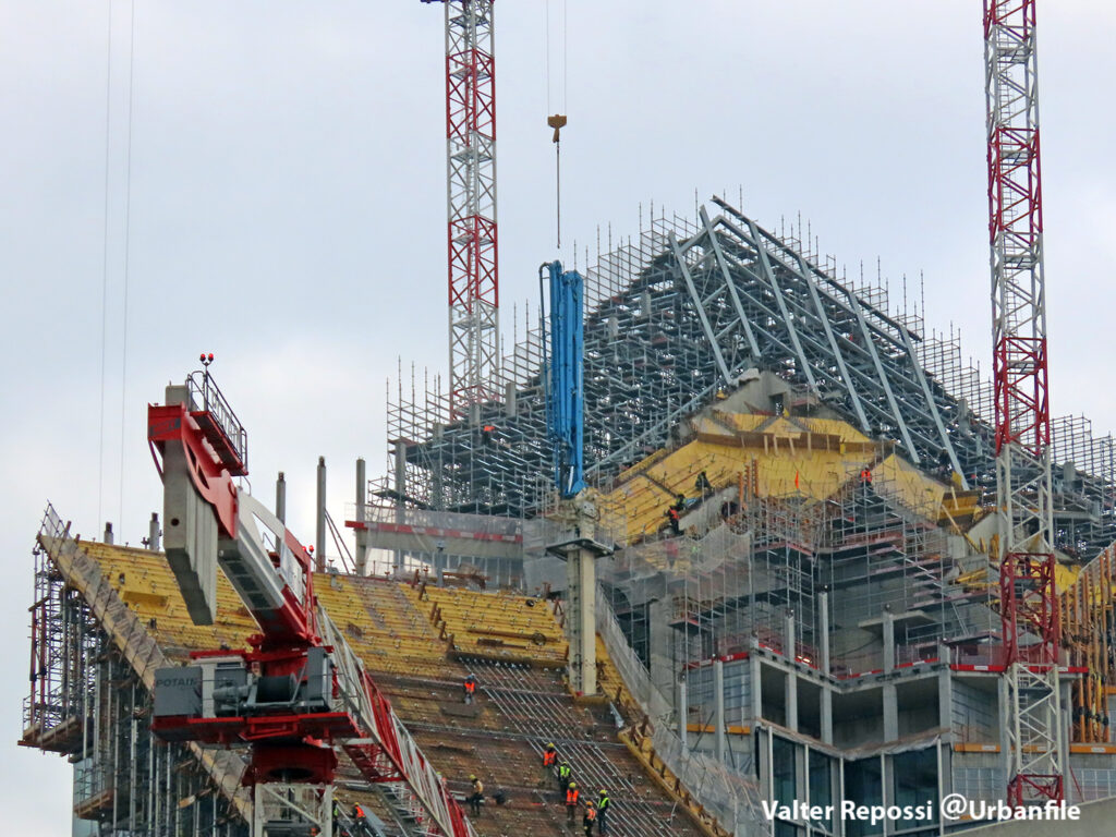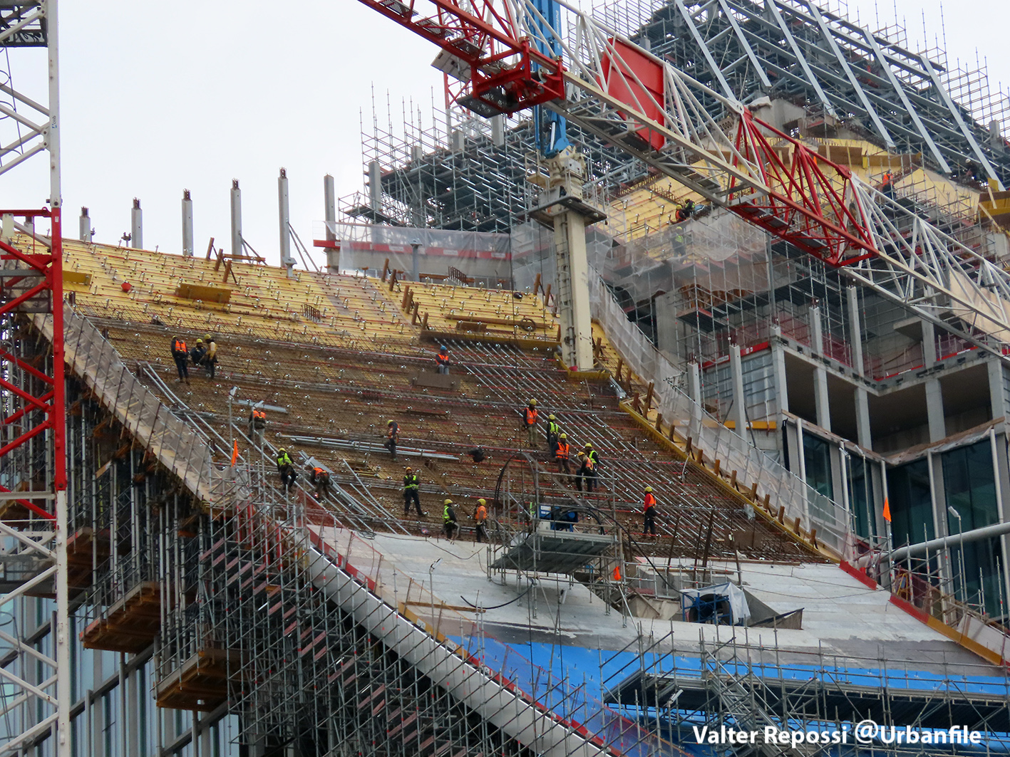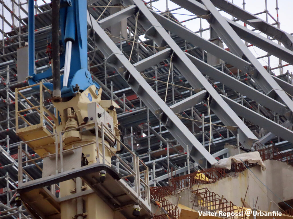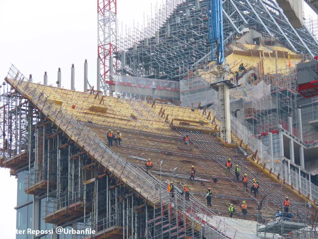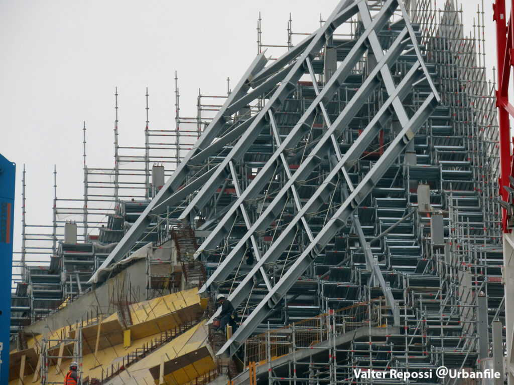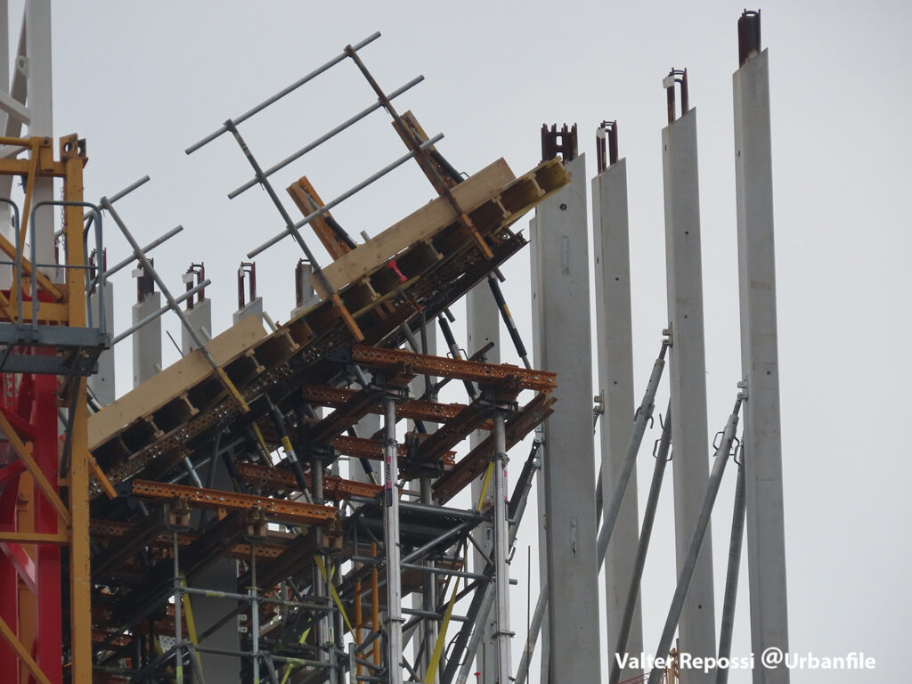 Proseguono i lavori alCityWave, oltre al montaggio delle vetrate delle facciate, anche quelli per completare la copertura del tetto e l’incredibile e complessa tettoia (canopy) che come un “telo” unirà le due torri del nuovo edificio per uffici in realizzazione nell’area verso largo Domodossola.