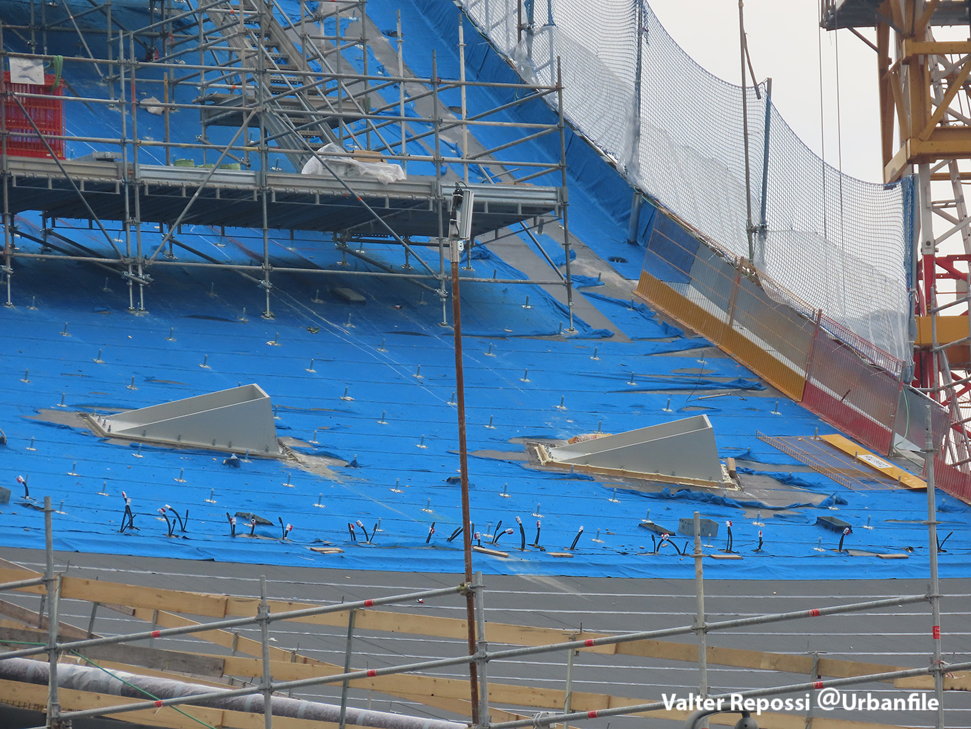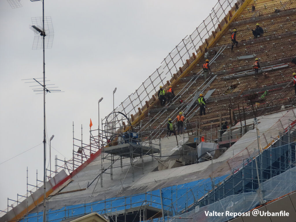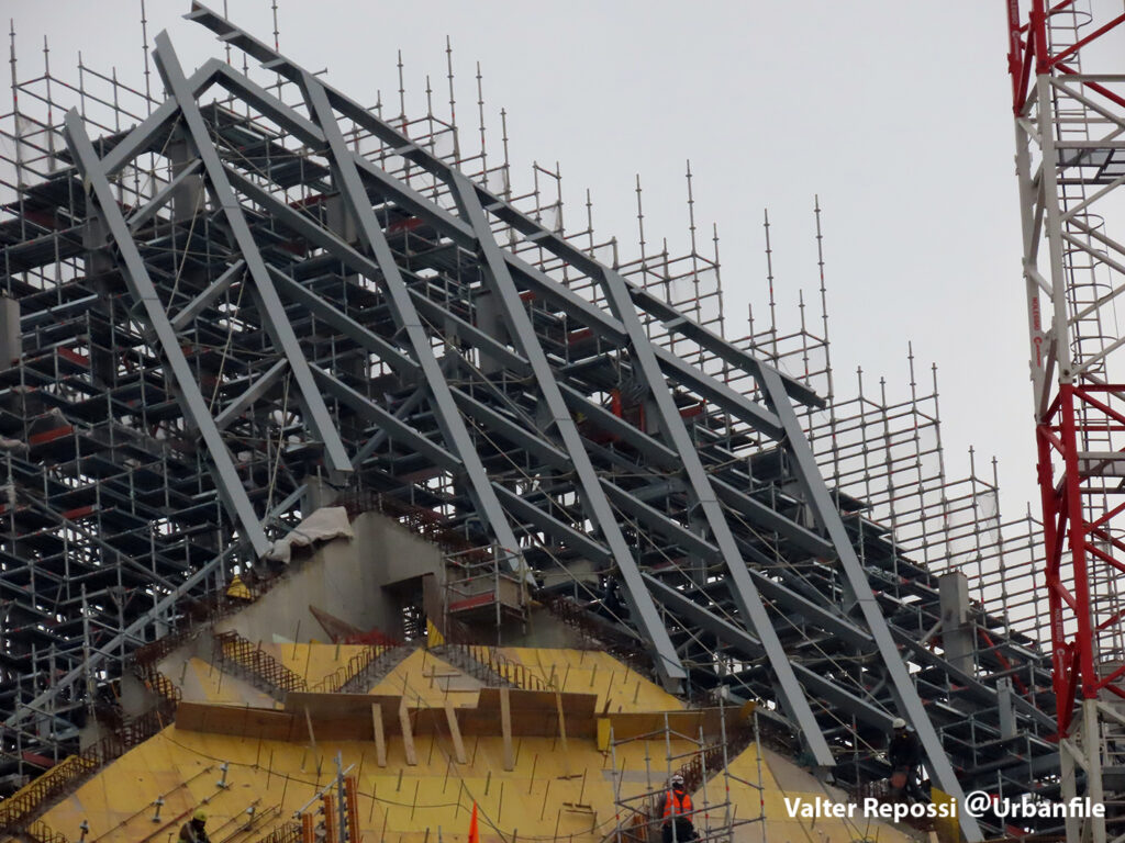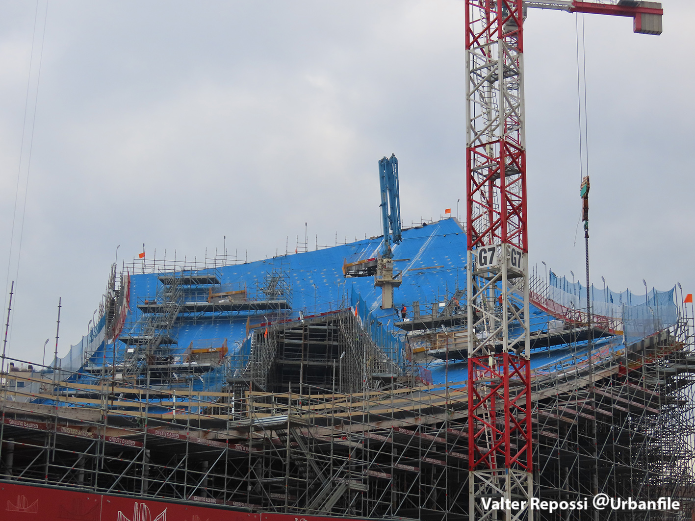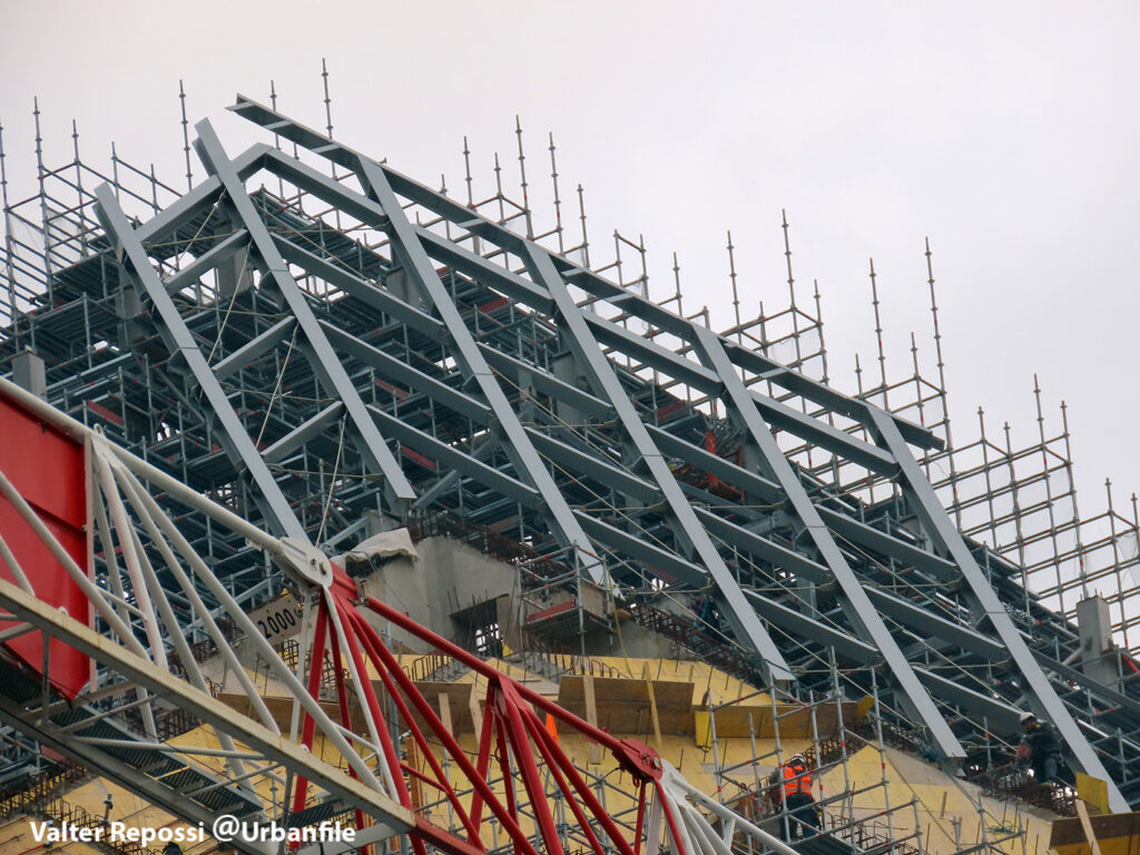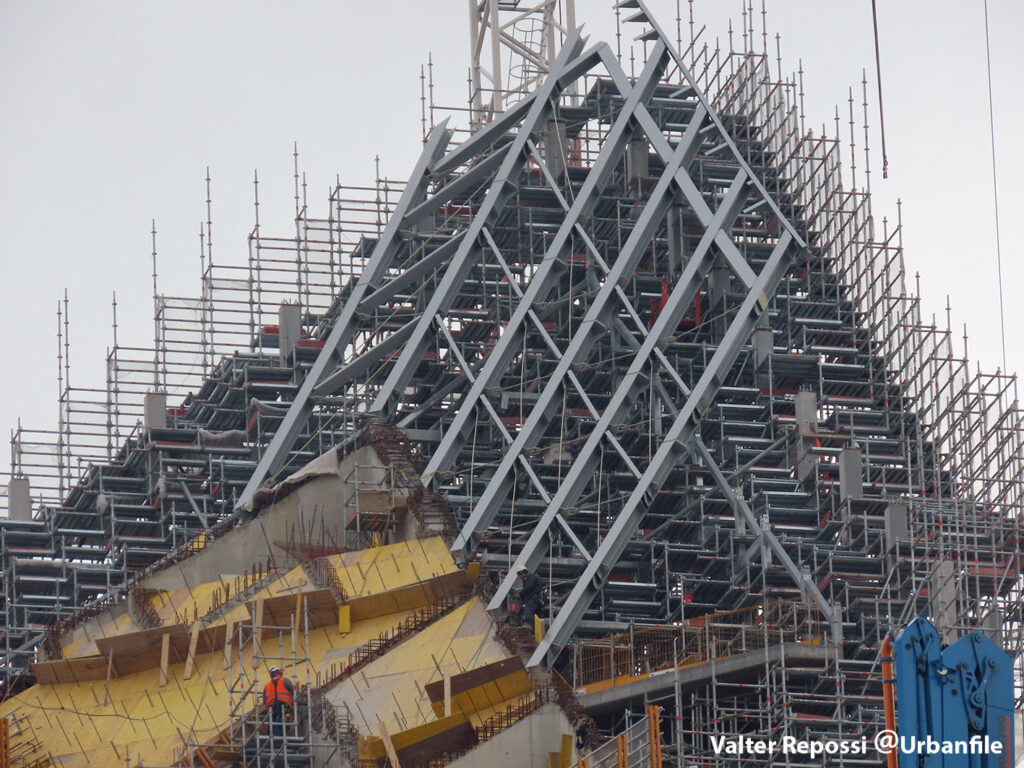 Proseguono i lavori alCityWave, oltre al montaggio delle vetrate delle facciate, anche quelli per completare la copertura del tetto e l’incredibile e complessa tettoia (canopy) che come un “telo” unirà le due torri del nuovo edificio per uffici in realizzazione nell’area verso largo Domodossola.