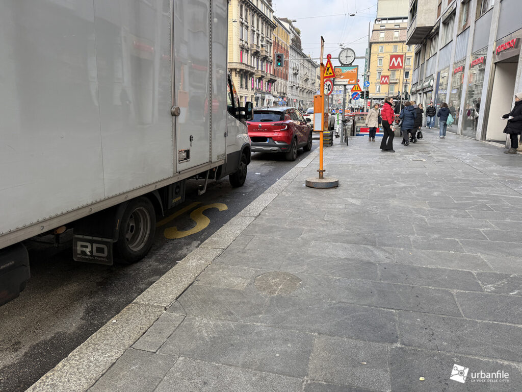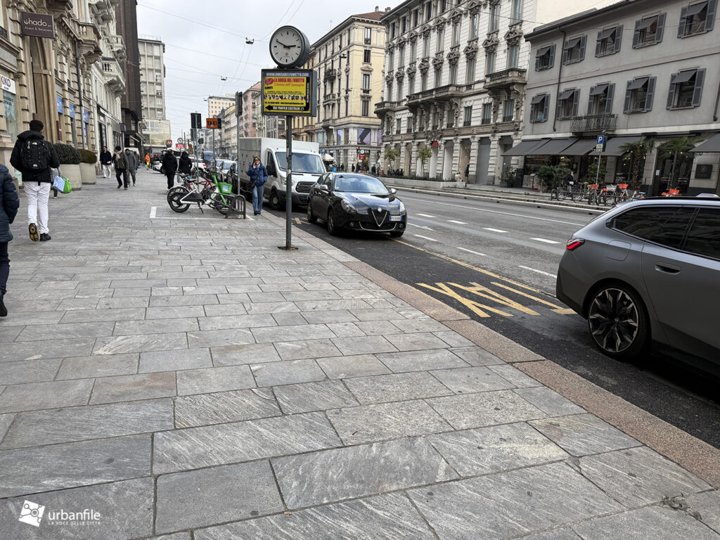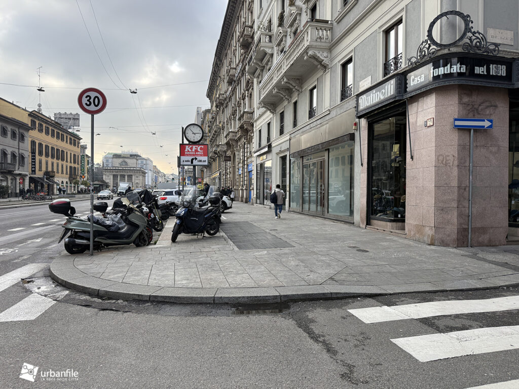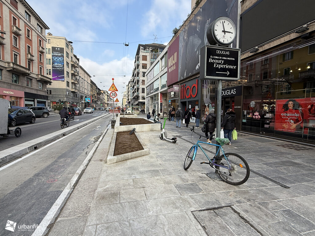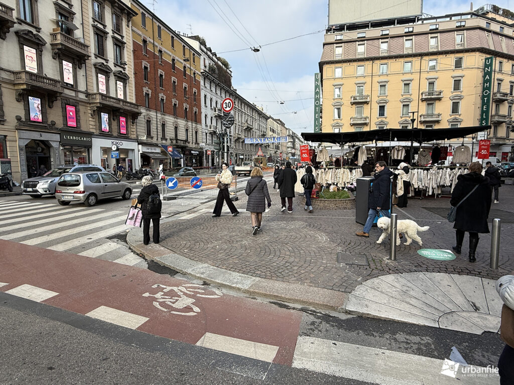 Proseguiamo verso Loreto, dove da via Francesco Redi e via Ruggero Boscovich raggiungiamo piazza Lima. Il tratto di Corso Buenos Aires sul lato dispari è stato completato, sia marciapiede, sia ciclabile e aiuole. Finalmente il lato pari del corso ha visto l’avvio del cantiere. Il settore verso piazza Lima è ancora libero dal cantiere e i soliti furbetti del parcheggio selvaggio non si fanno scrupoli, parcheggiando indisturbatamente.