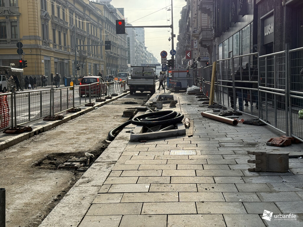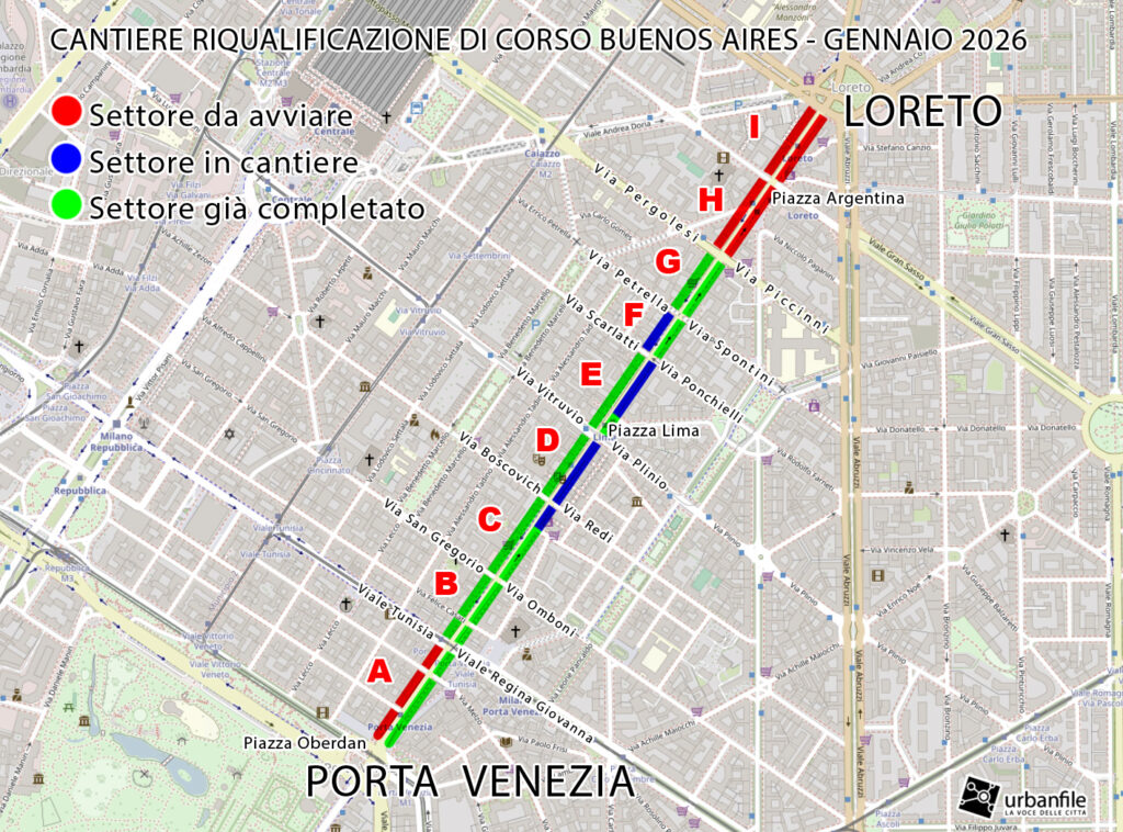 Fine gennaio 2026. Solito aggiornamento fotografico mensile dal cantiere per la riqualificazione di Corso Buenos Aires, la grande arteria commerciale lunga un chilometro e mezzo sita tra Porta Venezia e Loreto.