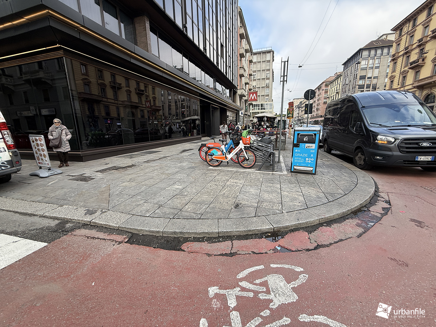 Proseguiamo verso Loreto, dove da via Francesco Redi e via Ruggero Boscovich raggiungiamo piazza Lima. Il tratto di Corso Buenos Aires sul lato dispari è stato completato, sia marciapiede, sia ciclabile e aiuole. Finalmente il lato pari del corso ha visto l’avvio del cantiere. Il settore verso piazza Lima è ancora libero dal cantiere e i soliti furbetti del parcheggio selvaggio non si fanno scrupoli, parcheggiando indisturbatamente.