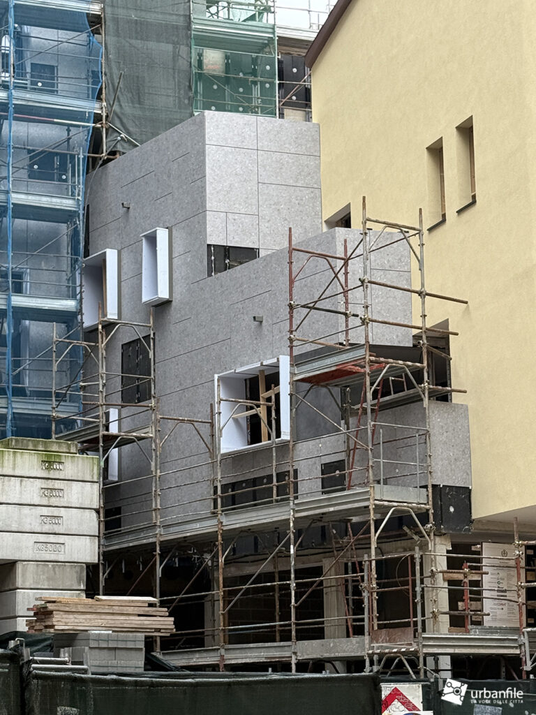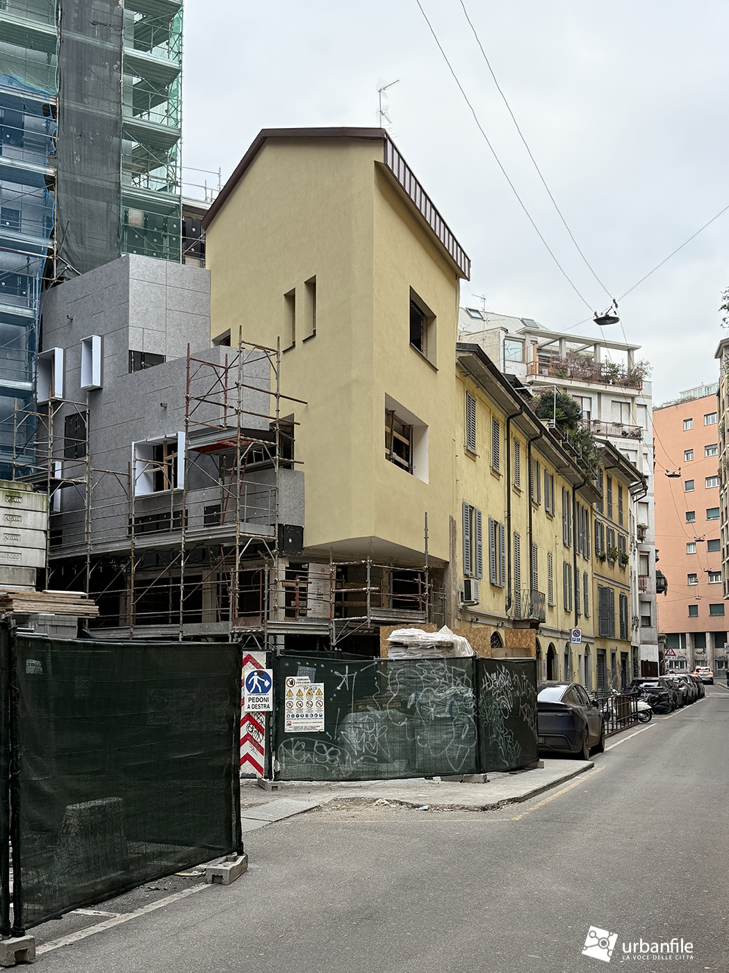 Nel frattempo il cantiere era giunto ormai ad un buon punto e la parte inferiore era stata spacchettata dalle implacature, mentre la torre manca ancora dei rivestimenti delle facciate. L’edificio a torre si incastra in un lotto decisamente piccolo tra l’edificio moderno e in Clinker di 8 piani di Corso Garibaldi 49, mentre la parte bassa del nuovo edificio si va a unire alle vecchie case operaie settecentesche. Ora si può vedere come sarà la parte bassa e, se non fosse per le finestre troppo ampie, potrebbe essere una soluzione accettabile che si fonde con le casette di due piani adiacenti.