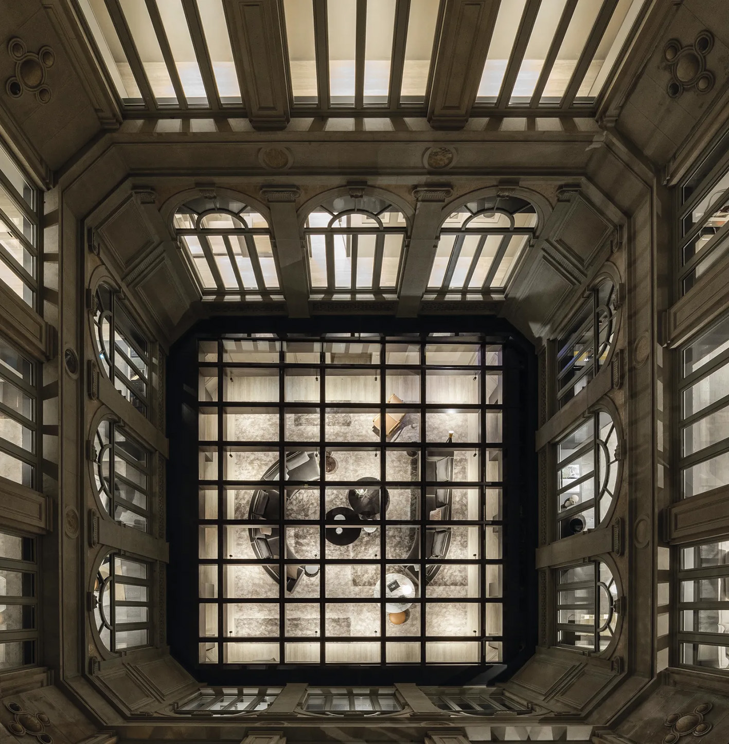 Il negozio si sviluppa come una sequenza di stanze a scala residenziale, collegate da una monumentale scala centrale, con quattro piani dedicati allo showroom e i livelli superiori riservati a uffici ed eventi.
