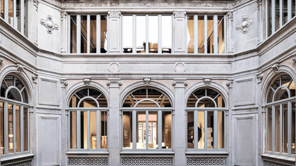 Lo spazio è stato ripensato nel pieno rispetto del DNA del marchio e dell’architettura storica, trasformandosi in un autentico omaggio all’artigianato italiano. Il progetto combina materiali raffinati come legno scuro, bronzo e pietra, dando vita ad ambienti che evocano il glamour milanese e creano un dialogo continuo tra il dinamismo della città e la quiete dei cortili interni.
