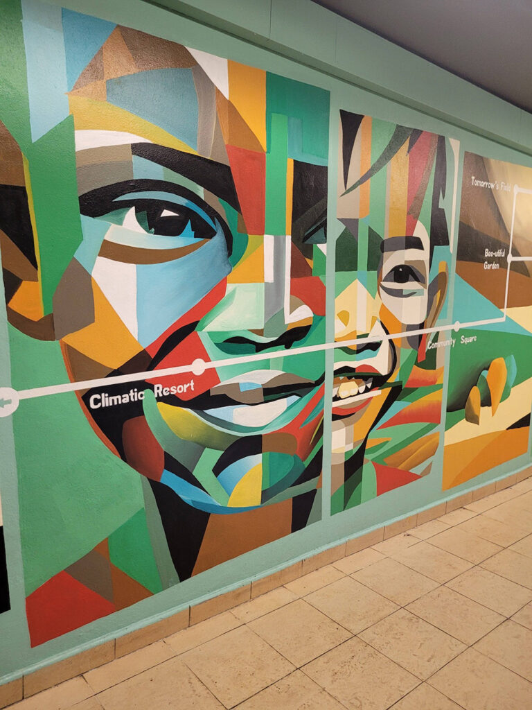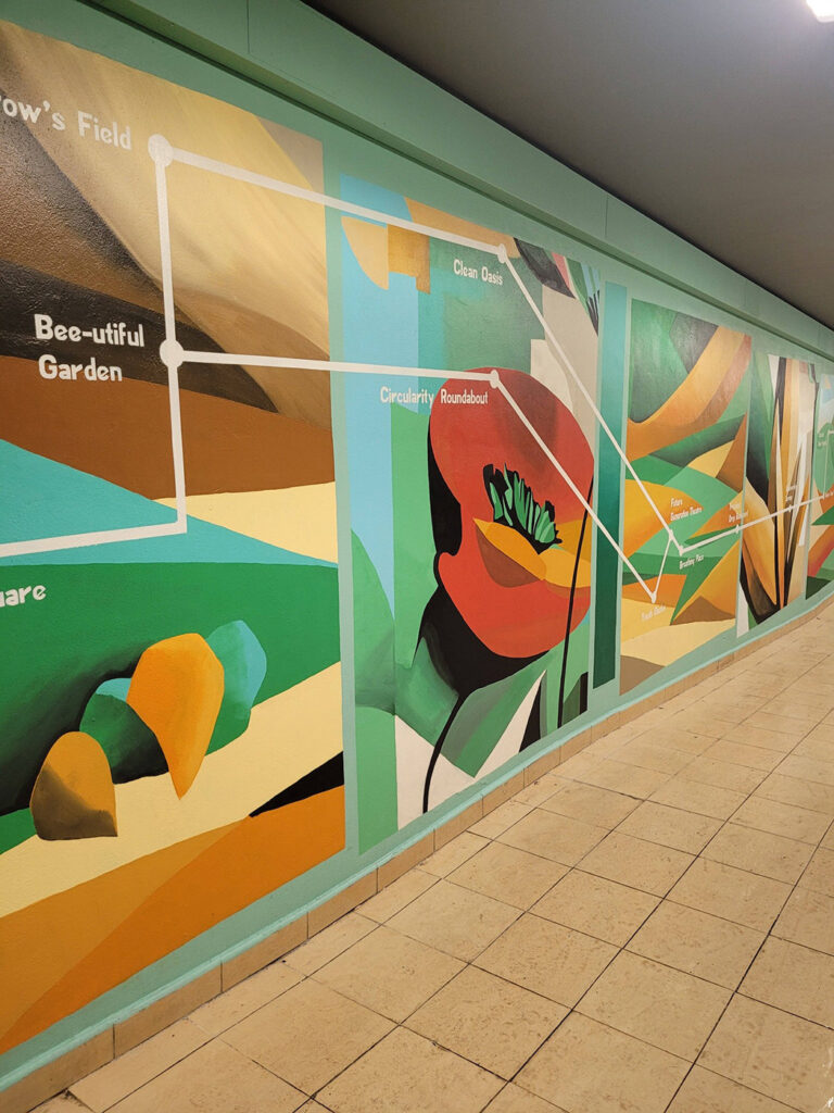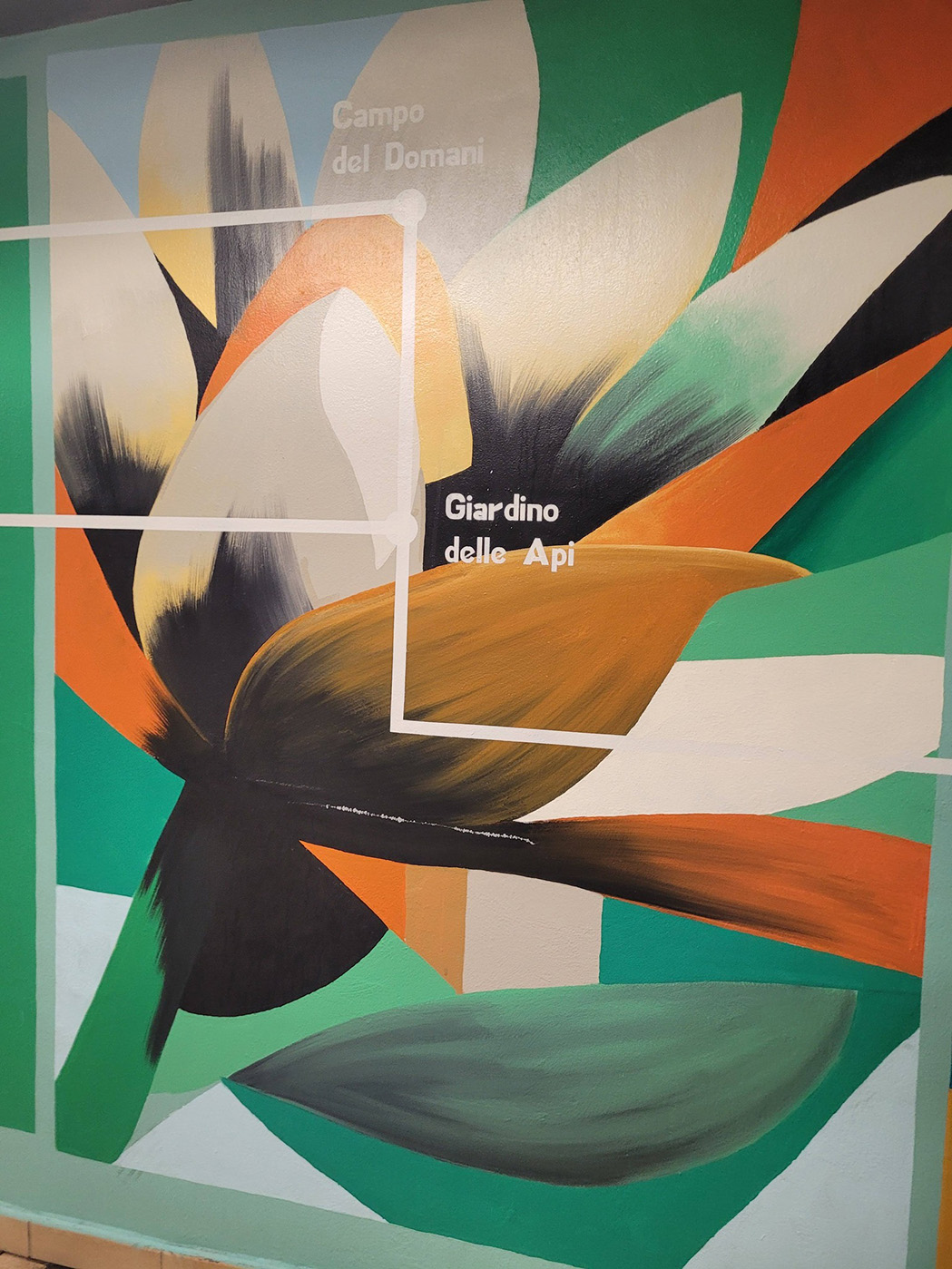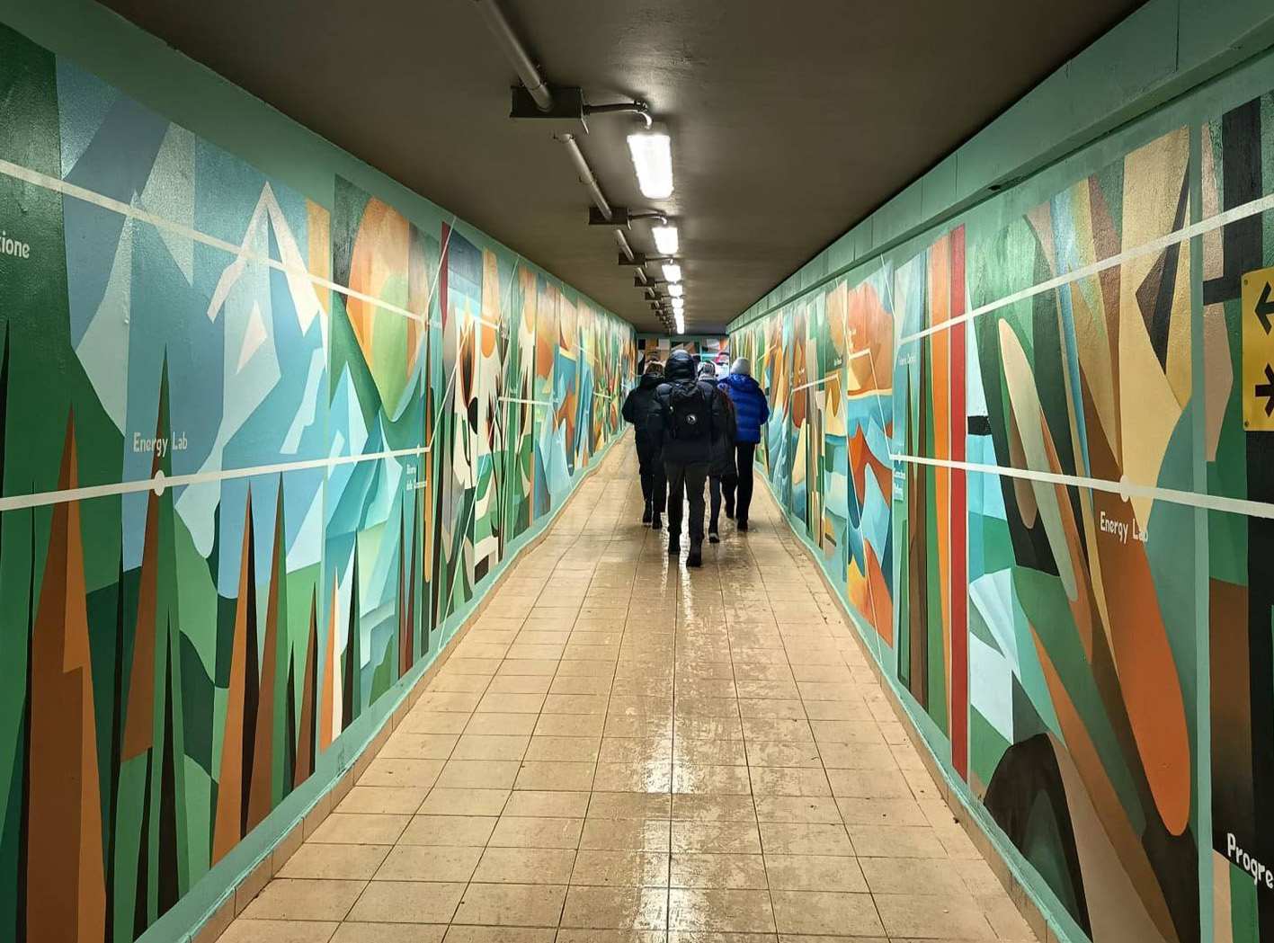 Il murale si sviluppa lungo le due pareti principali del sottopasso per una lunghezza complessiva di circa 85 metri. Una parete è realizzata in italiano, l’altra in inglese, per rendere l’opera accessibile anche a una comunità internazionale. Le due superfici raccontano lo stesso percorso visivo: un viaggio che parte dalle persone e dal loro ingegno creativo e si proietta verso un futuro sostenibile, scandito dalle fermate di una metropolitana immaginaria.