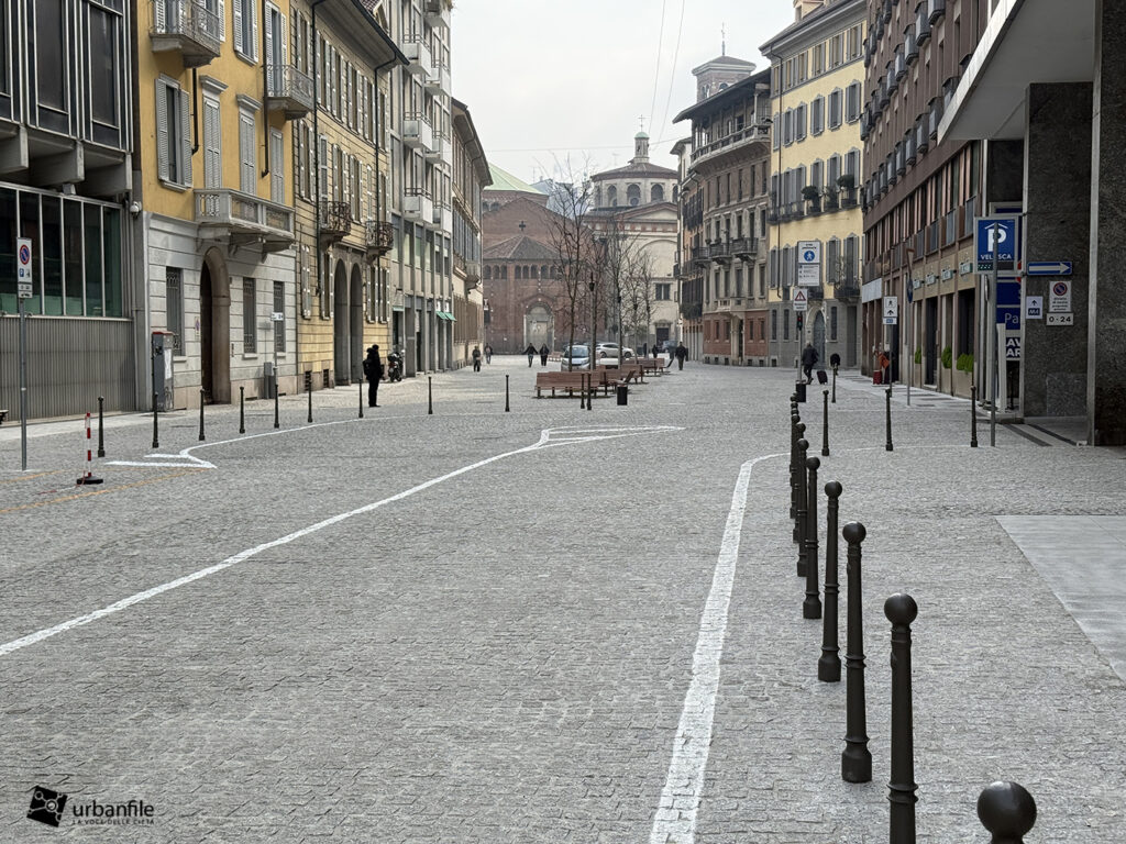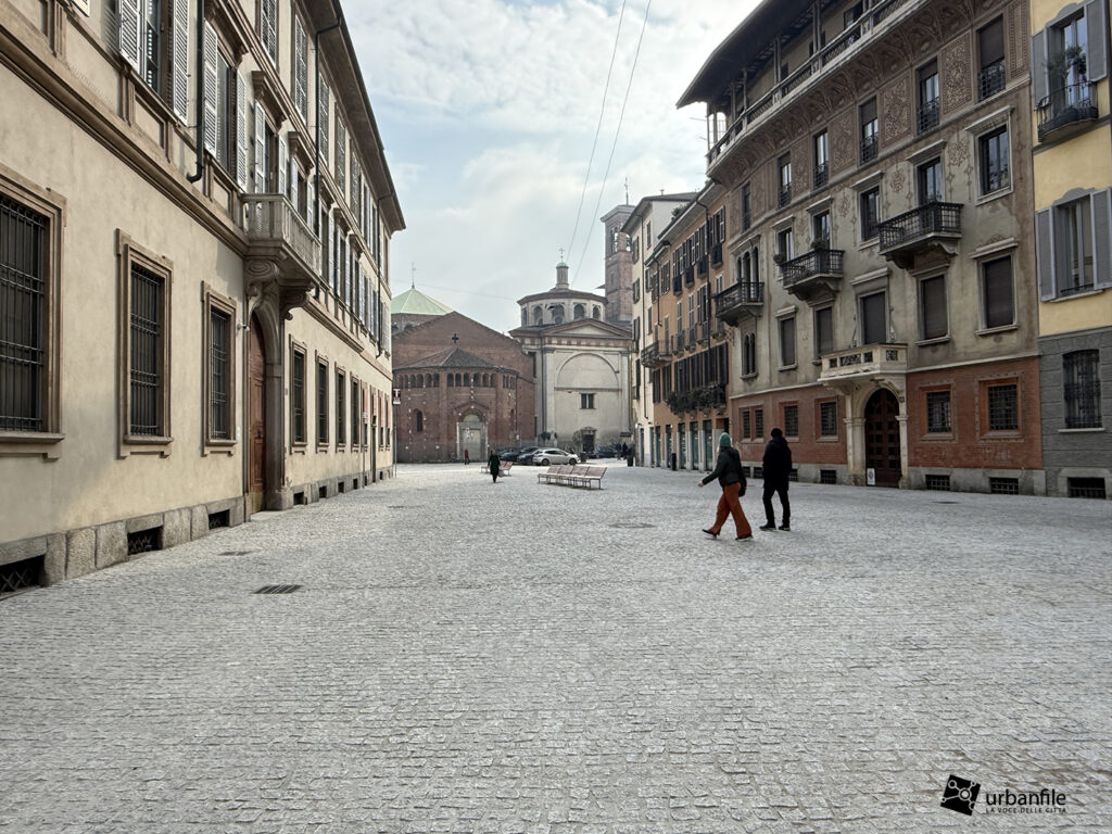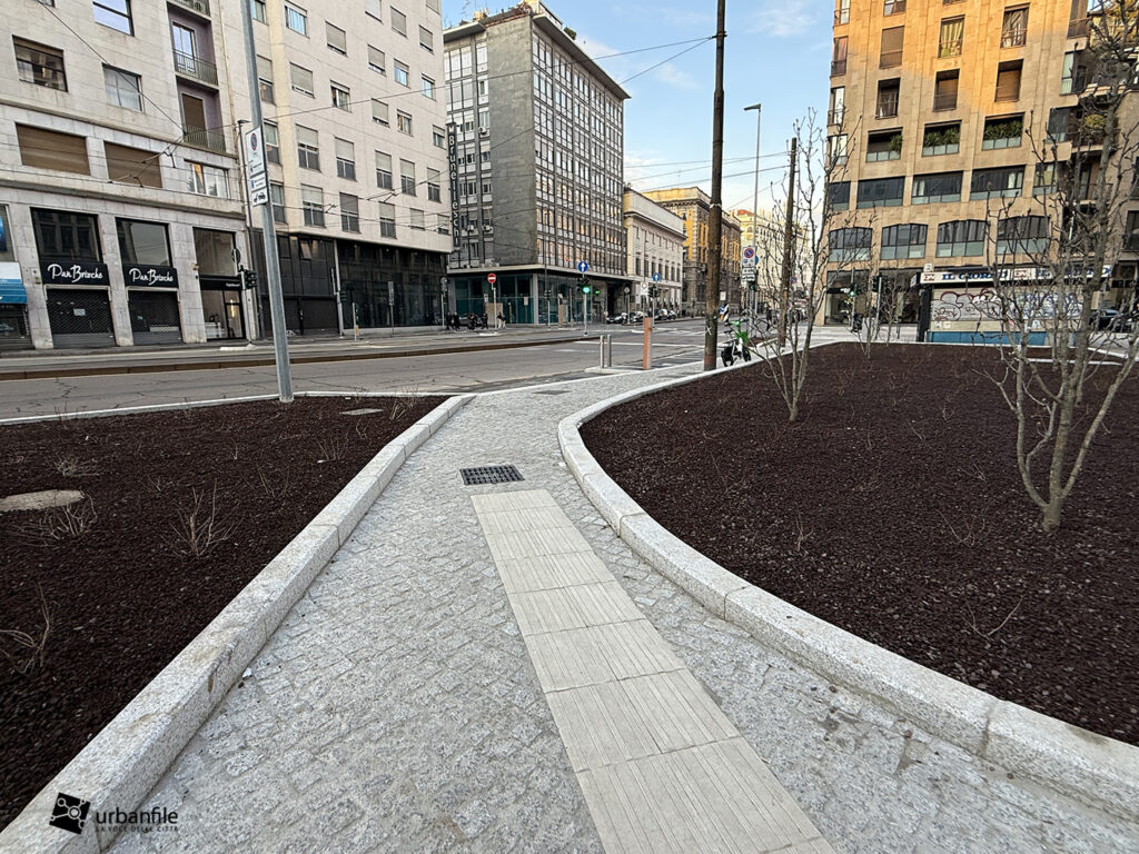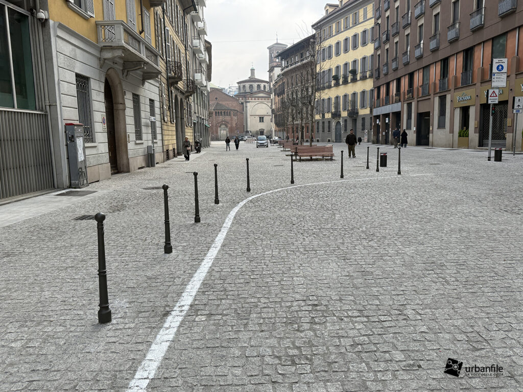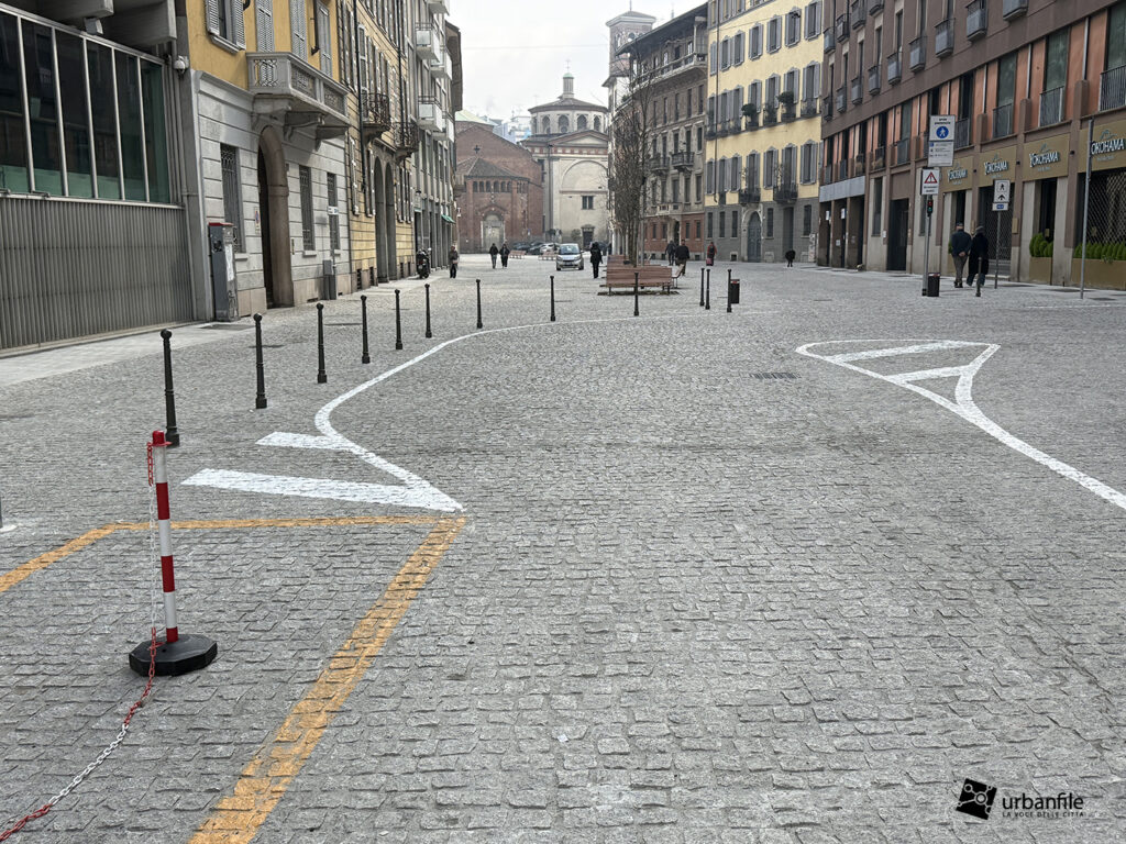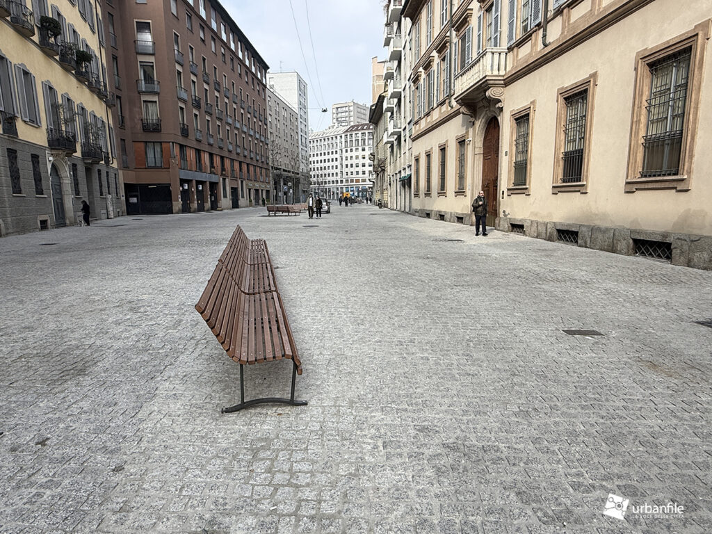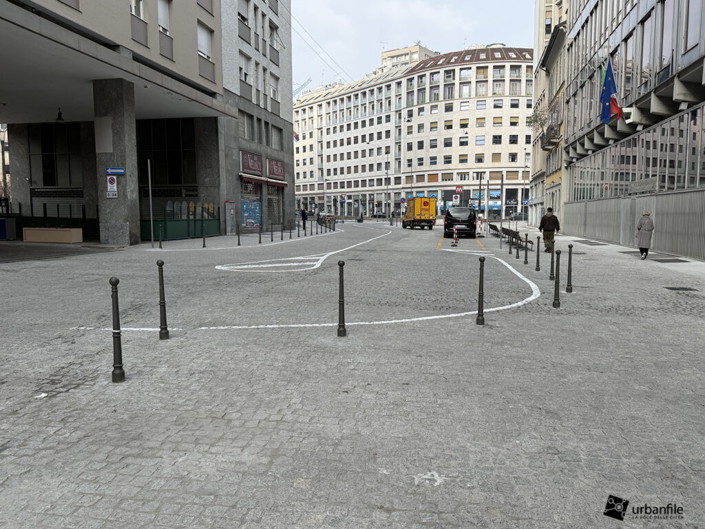 Anche qui l’intervento ha riqualificato uno spazio in precedenza utilizzato come parcheggio. Già rivestita con ampie lastre di pietra, con i lavori le piastre sono state riposizionate e sistemate. Nella pavimentazione è stata collocata una placca che indica la direzione per la stazione M3 Missori.
