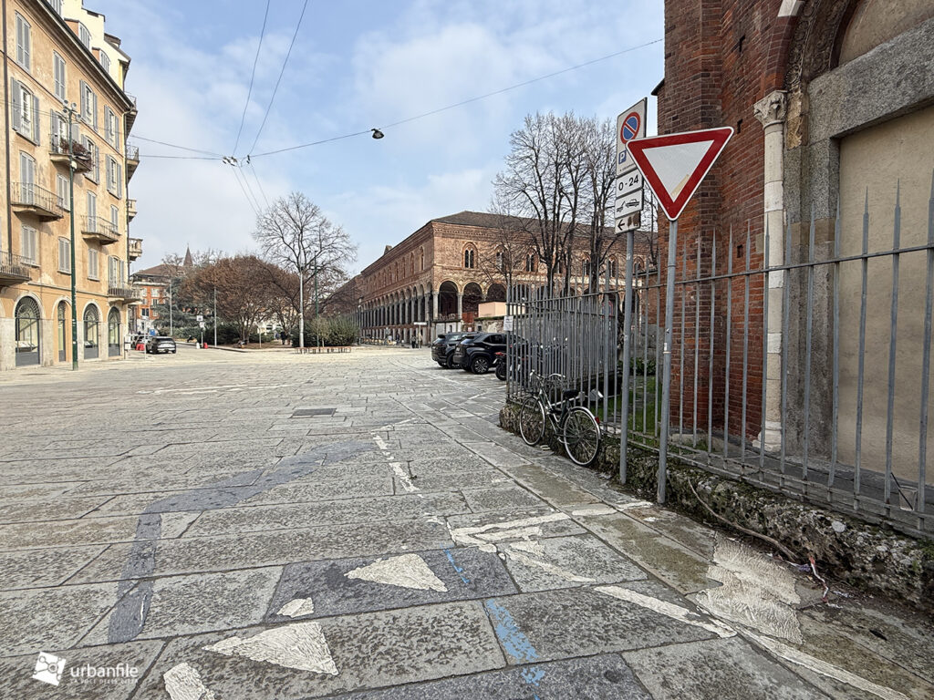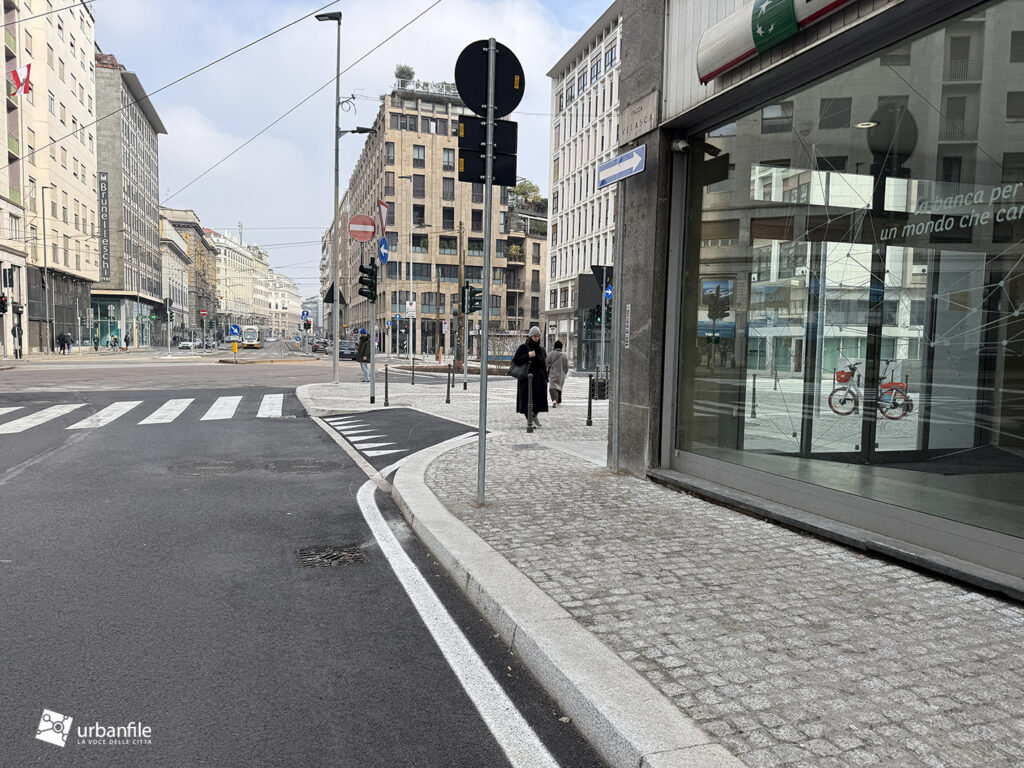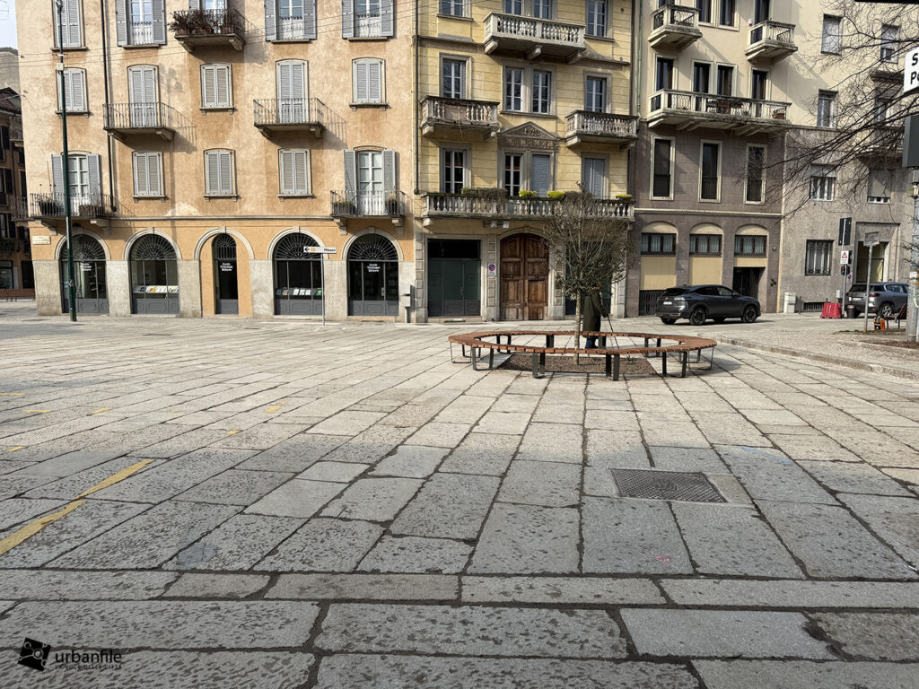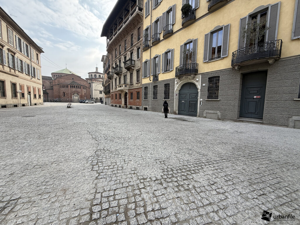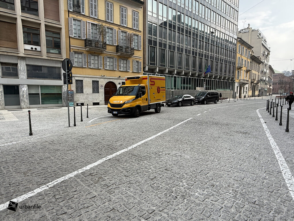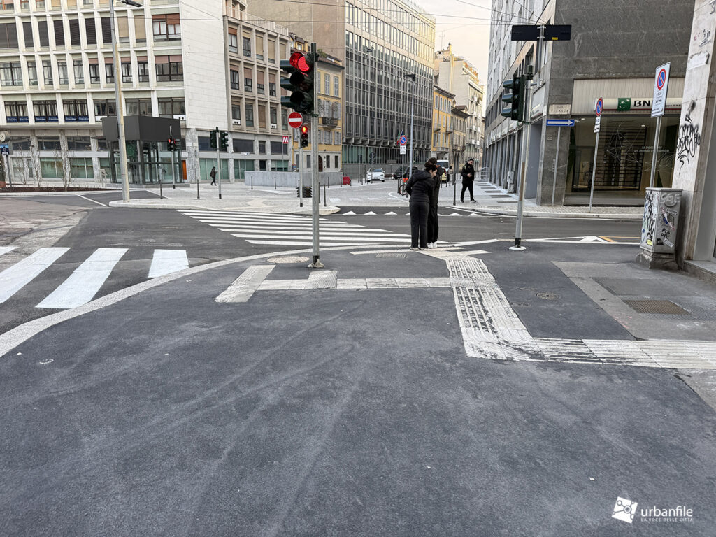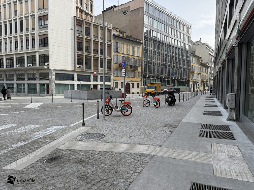 Anche qui l’intervento ha riqualificato uno spazio in precedenza utilizzato come parcheggio. Già rivestita con ampie lastre di pietra, con i lavori le piastre sono state riposizionate e sistemate. Nella pavimentazione è stata collocata una placca che indica la direzione per la stazione M3 Missori.