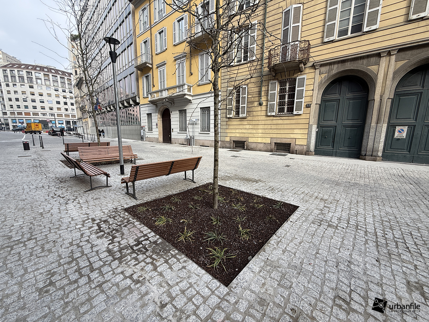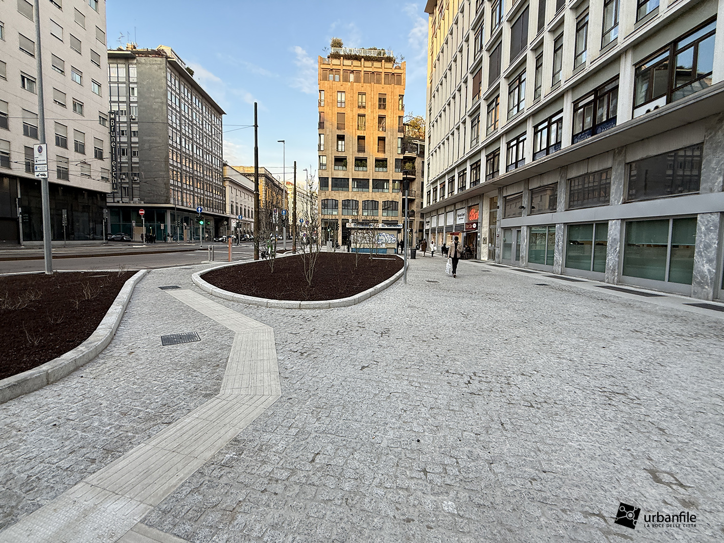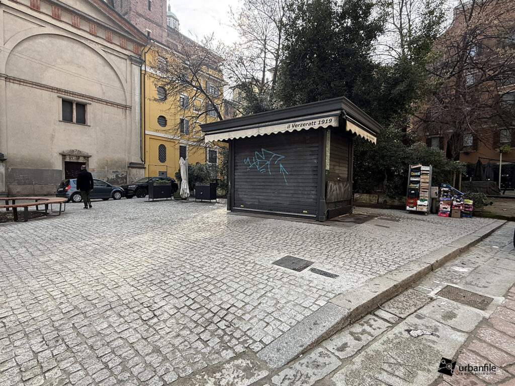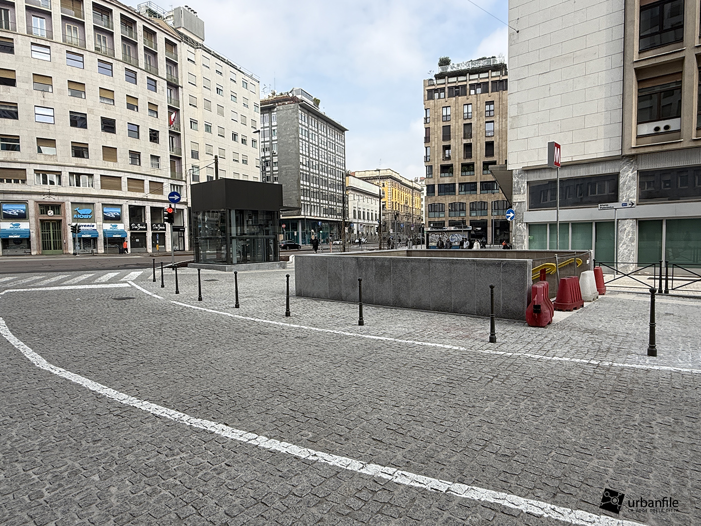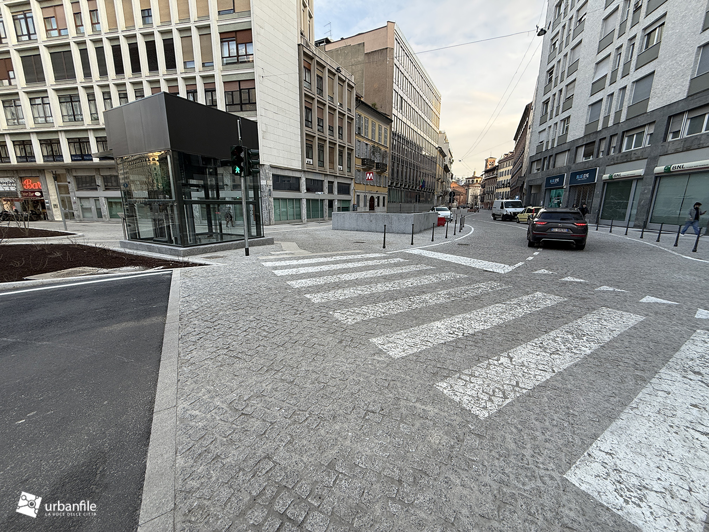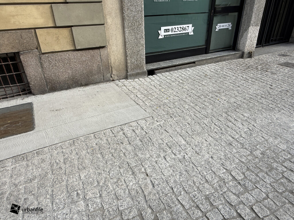 Anche qui l’intervento ha riqualificato uno spazio in precedenza utilizzato come parcheggio. Già rivestita con ampie lastre di pietra, con i lavori le piastre sono state riposizionate e sistemate. Nella pavimentazione è stata collocata una placca che indica la direzione per la stazione M3 Missori.