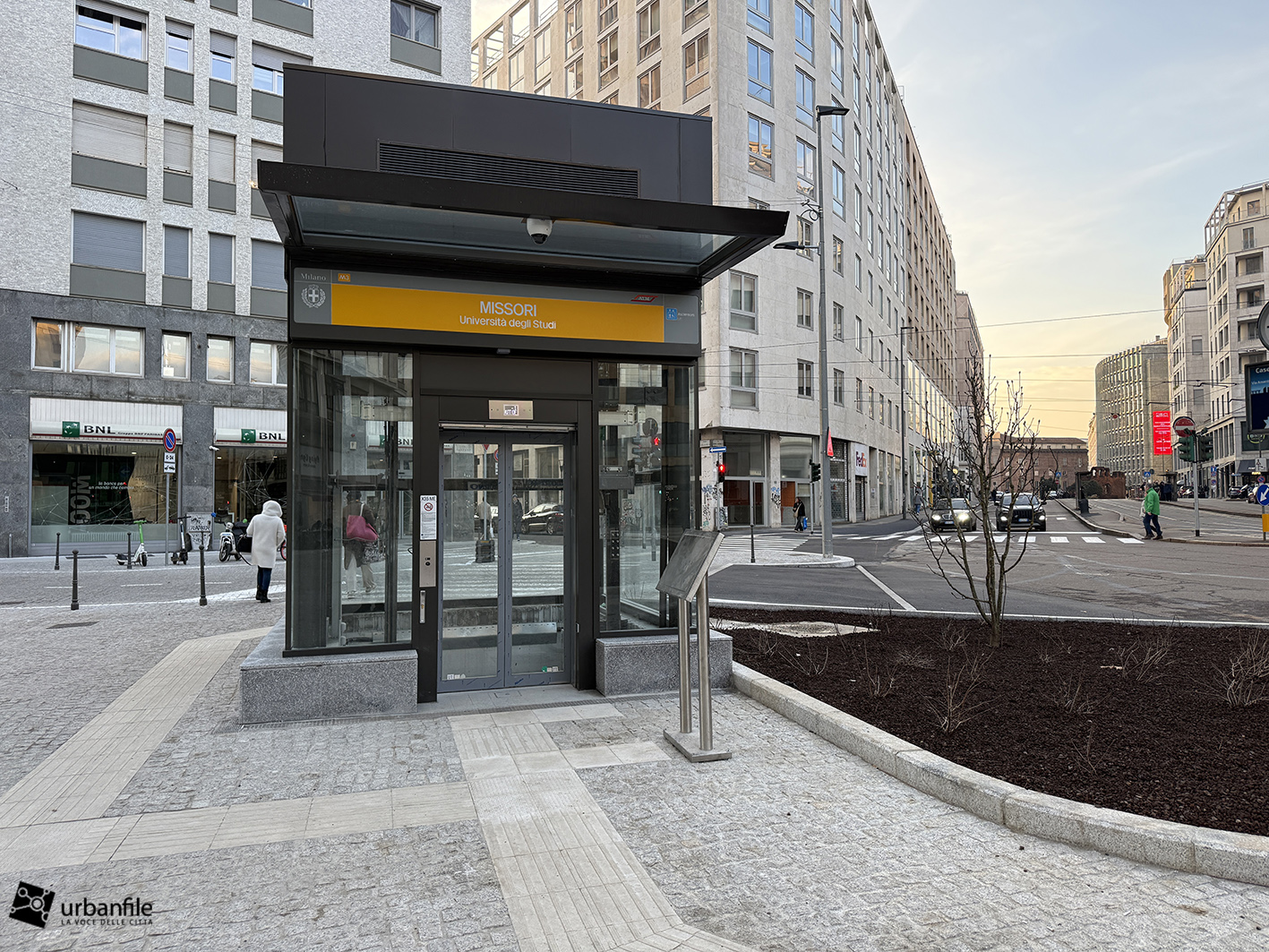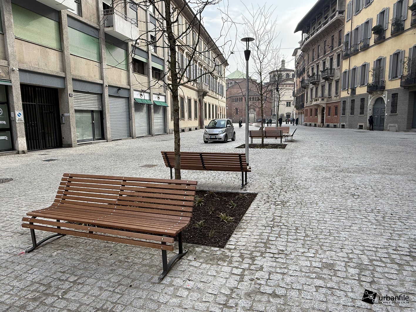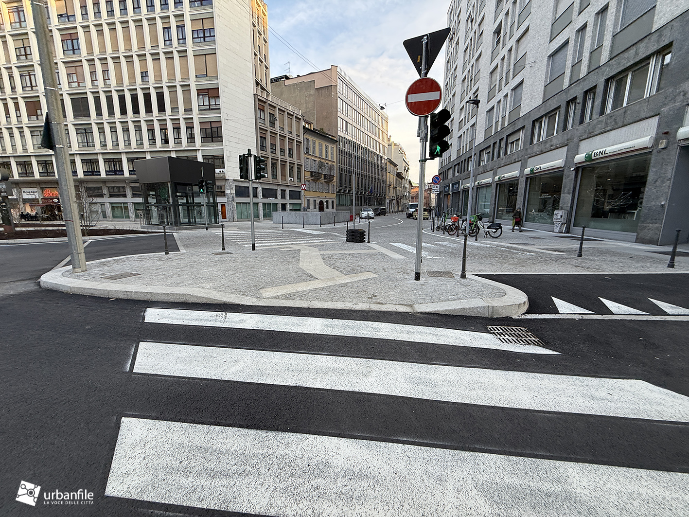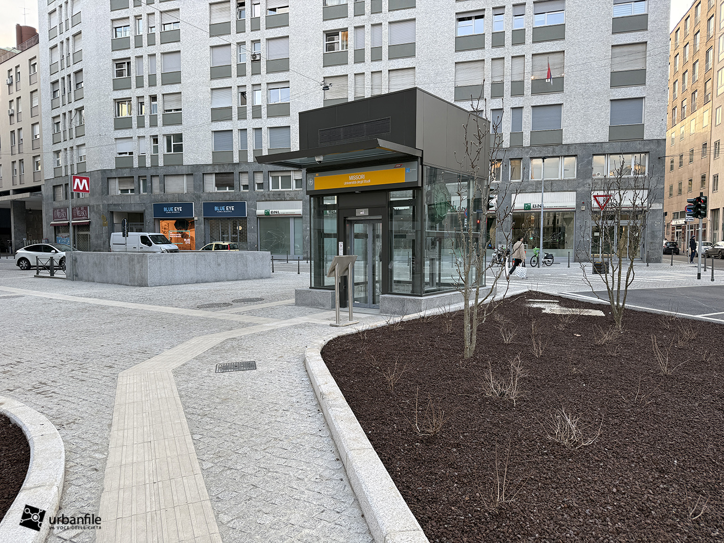 Anche qui l’intervento ha riqualificato uno spazio in precedenza utilizzato come parcheggio. Già rivestita con ampie lastre di pietra, con i lavori le piastre sono state riposizionate e sistemate. Nella pavimentazione è stata collocata una placca che indica la direzione per la stazione M3 Missori.