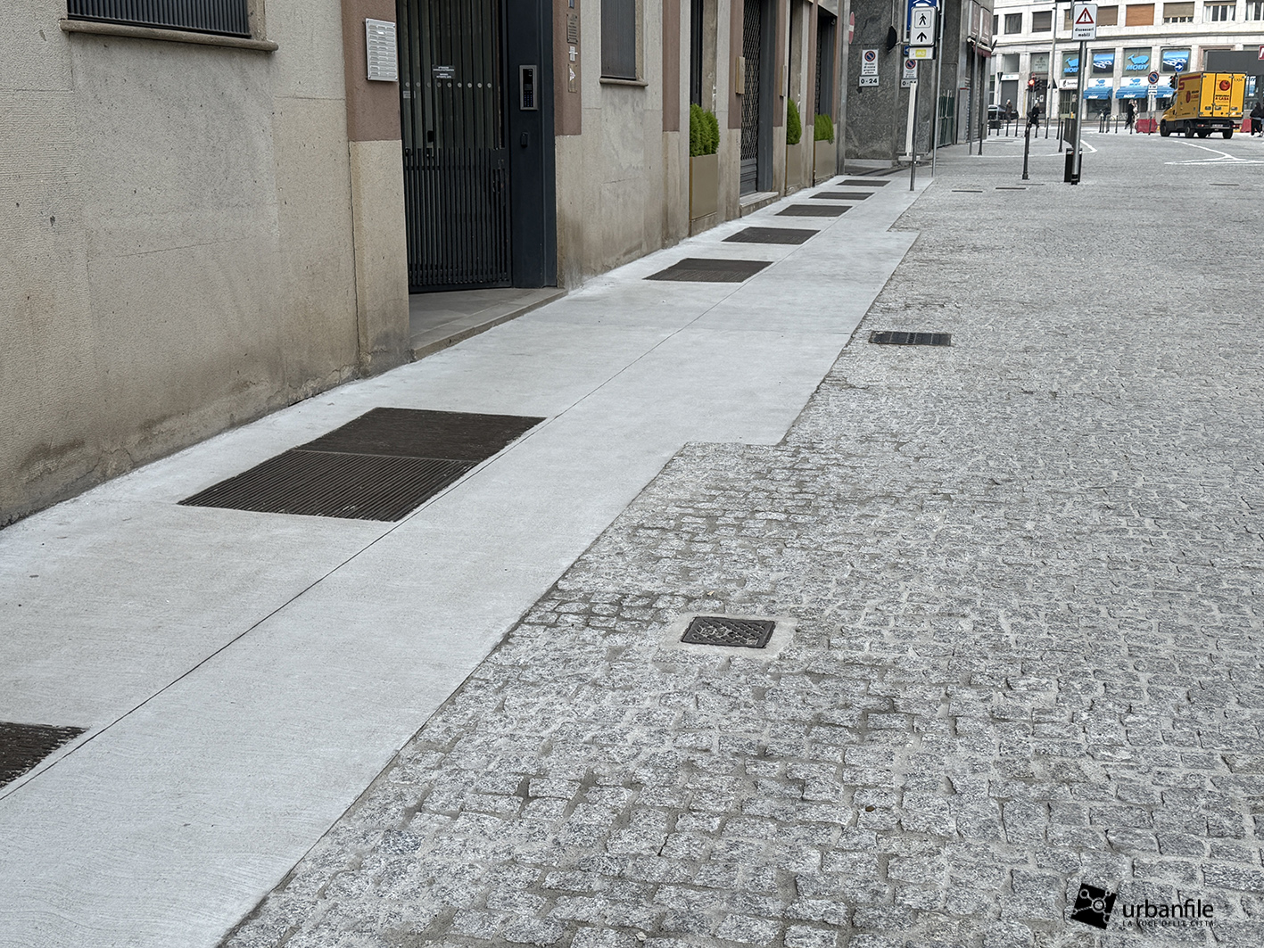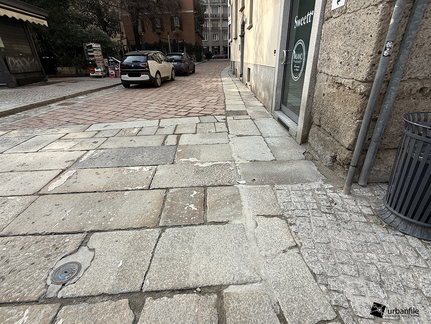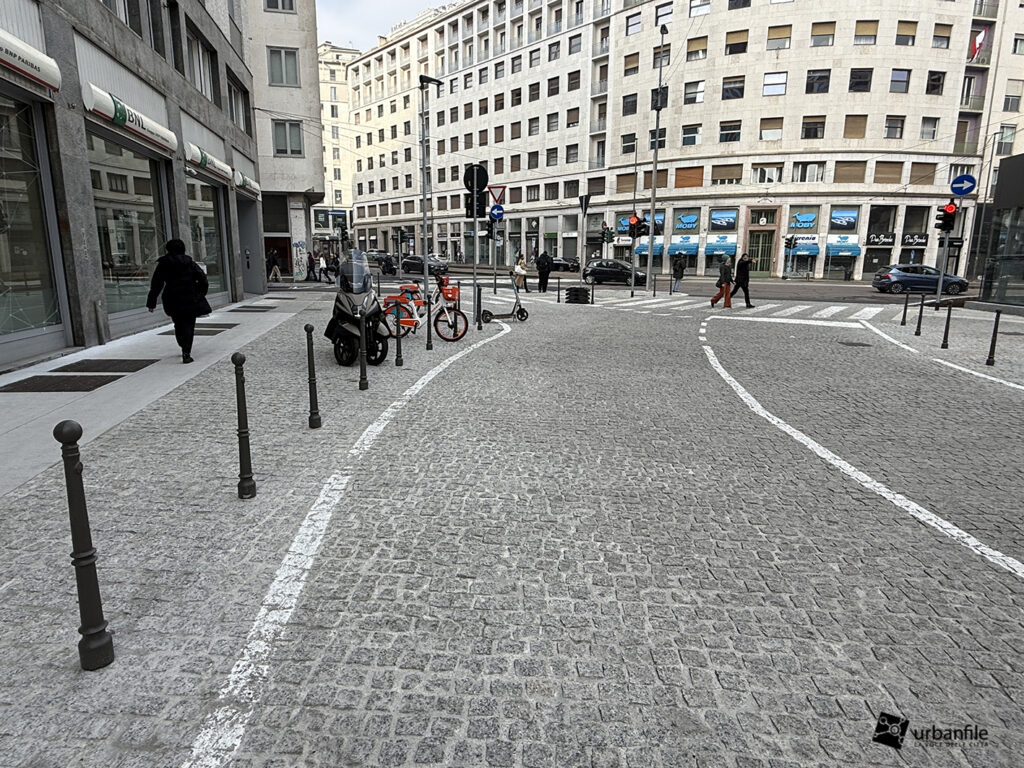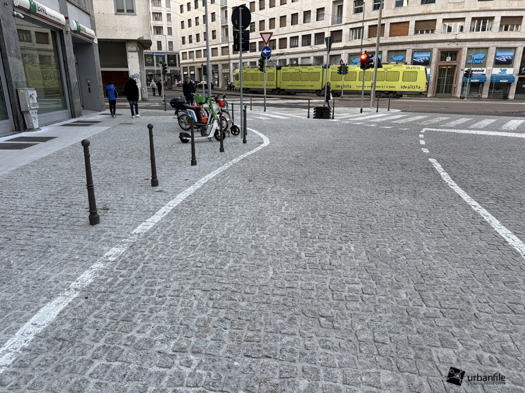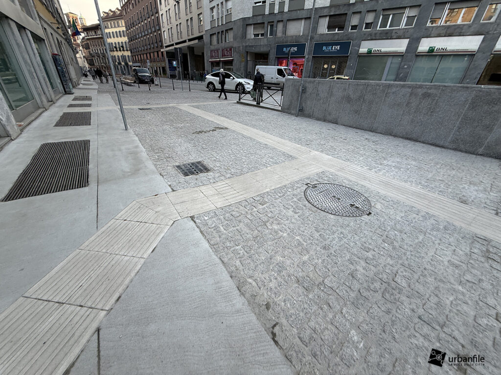 Se lo slargo di via Larga ci è piaciuto molto (escludendo la scelta delle aiuole, come spiegato sopra), via Pantano ci convince solo a metà. Da normale strada con marciapiedi e stalli per la sosta, è diventata una distesa infinita di cemento rivestito in pietra, con cubetti irregolari di granito. Pietre che fanno “mitragliare” le valigie a rotelle di tutti i pedoni che effettueranno il trasbordo da una linea all’altra.