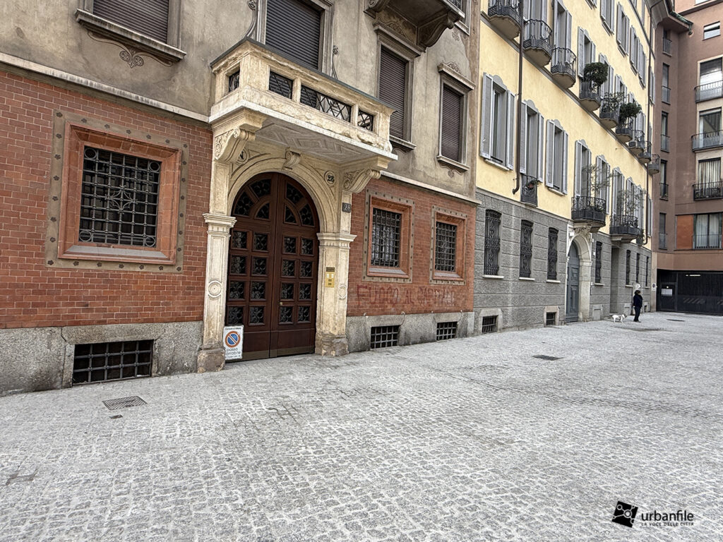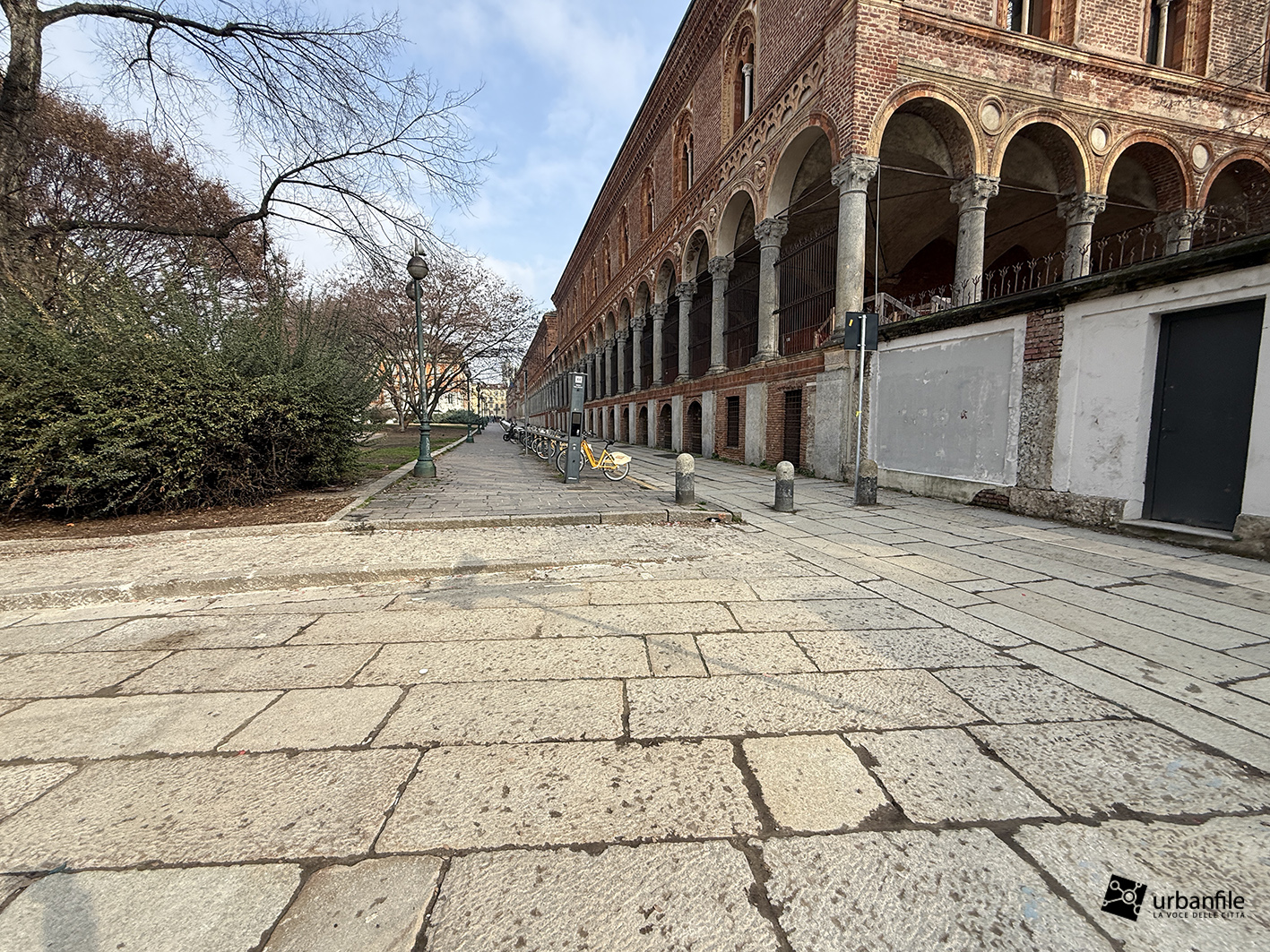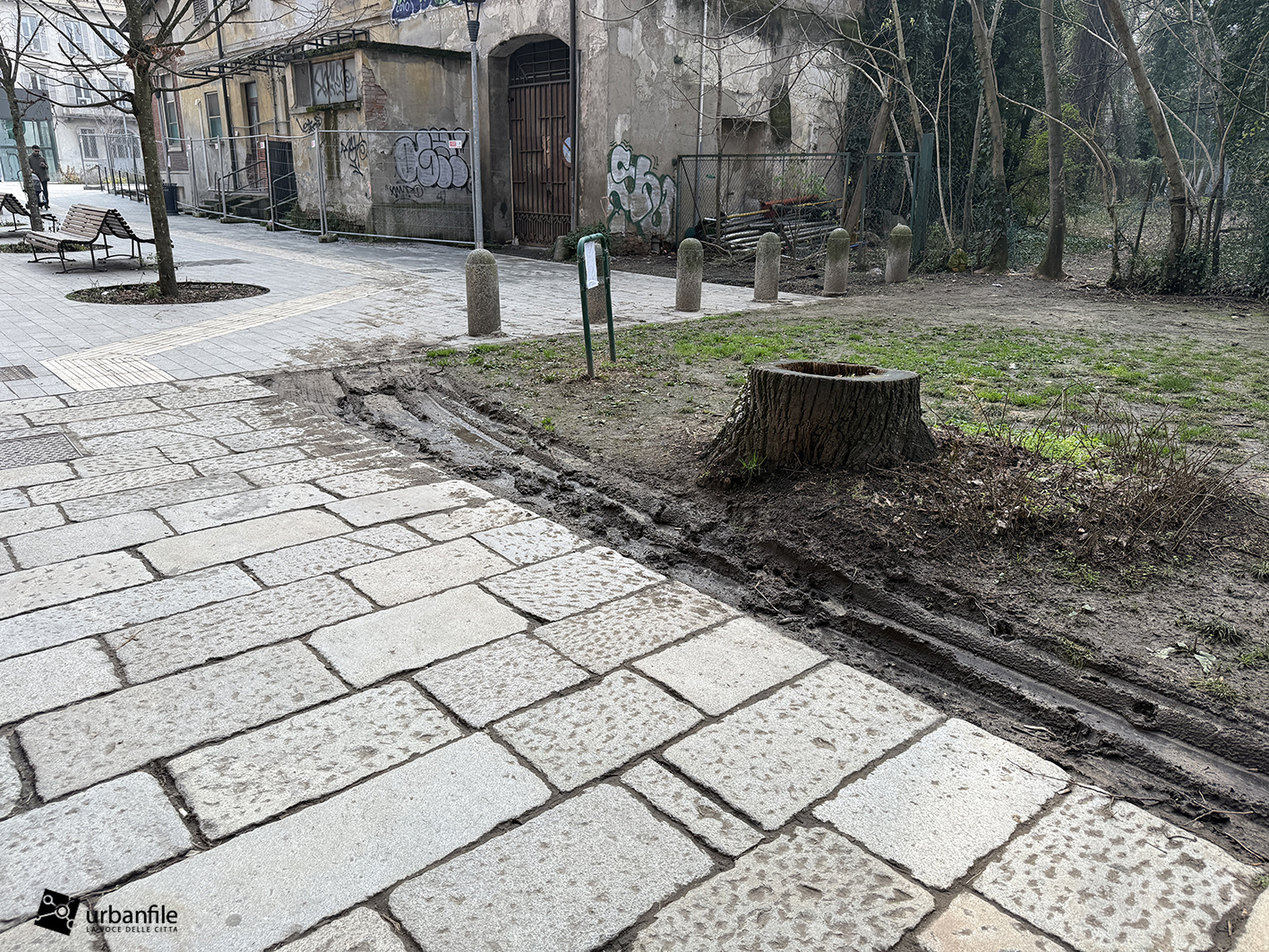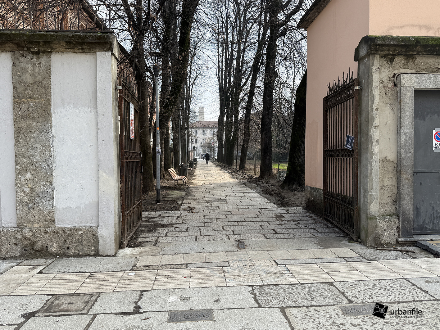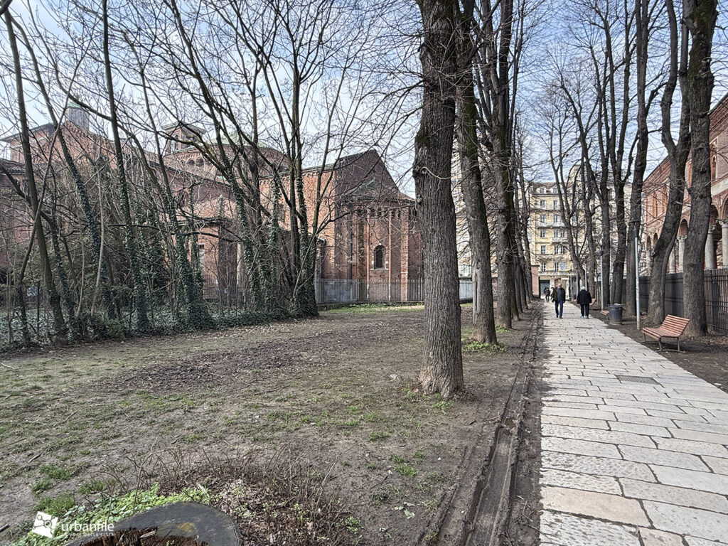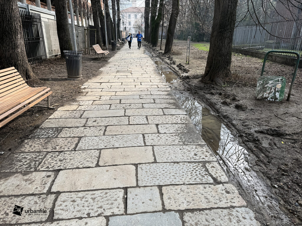 Purtroppo la pavimentazione in pietra è stata realizzata troppo a raso del terreno e, ogni volta che piove, si trasforma in un pantano. Speriamo venga risolto il problema, così come auspichiamo che venga ripiantato l’albero mancante. Ci auguriamo anche che il giardino venga riqualificato e recintato (è spesso luogo di bivacco) e che partano presto i lavori per il recupero del vecchio obitorio di via Sforza.