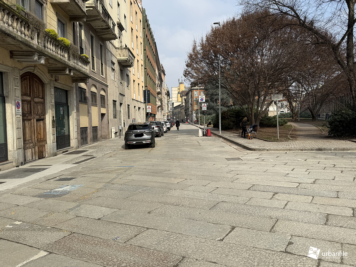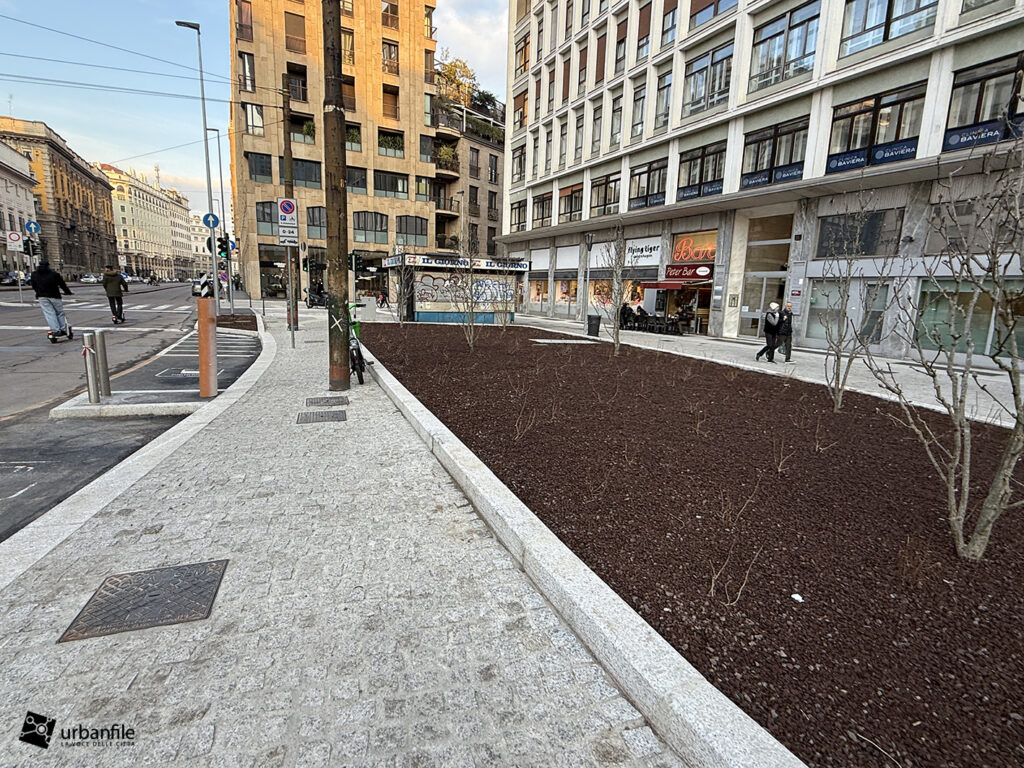Lascia perplessaa filosofia di questi nuovi interventi che non applicano il depaving invocato a parole dall’amministrazione e la scelta molto timida in fatto di alberature. Solo cespugli o piccoli alberi (piccoli non per la giovane età ma per le caratteristiche di crescita ridotta delle specie scelte). Il verde non è un mero elemento di arredo ma fornisce servizi ecosistemici, pertanto servono alberi in grado di ombreggiare e raffrescare l’aria durante i mesi caldi. Questi obiettivi non mi pare siano stati traguardati nè ora nè nei prossimi decenni, soprattutto verso via Larga dove manca completamente l’ombra. Anche l’aspetto della città spugna e del drenaggio naturale resta sulla carta, data la vastità delle superfici impermeabilizzate. Togliere le auto e l’asfalto per mettere il porfido su letto di cemento non è un upgrade che migliora gli aspetti di resilienza climatica ma un’occasione persa.