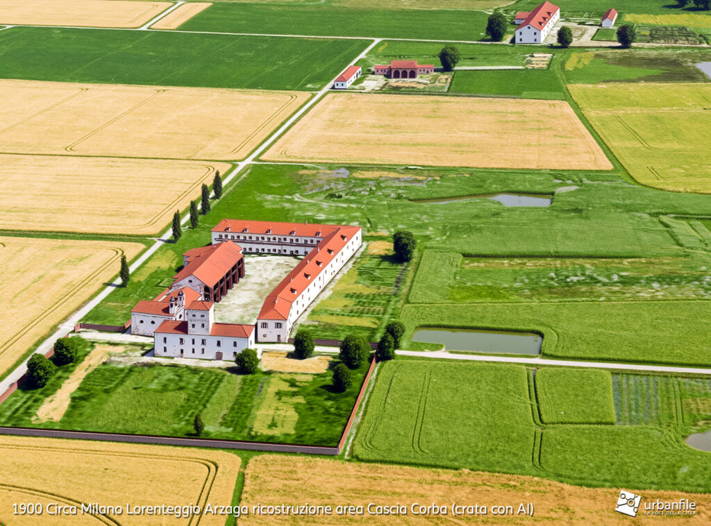 Di seguito alcune ricostruzioni fotografiche di come poteva apparire la Cascina Corba e l’oratorio di San Carlo coi due campaniletti.