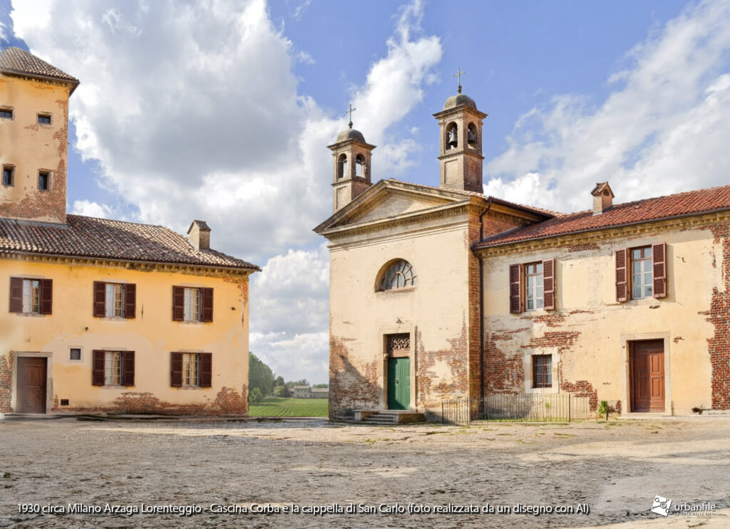 Accanto alla cascina sorgeva la chiesetta di San Carlo alla Corba, un modesto oratorio costruito alla fine del Seicento “per comodo del colono”. Se ne trovano tracce fino agli anni Trenta del Novecento; negli ultimi anni dipendeva dalla parrocchia di Santa Maria del Rosario e scomparve probabilmente con le demolizioni del secondo dopoguerra. Addossata a uno dei fabbricati rurali, aveva un’aula unica di gusto neoclassico, con due piccoli campanili ai lati del timpano. Una finestra a lunetta e tre aperture laterali garantivano l’illuminazione interna. Sull’altare era collocato un bassorilievo in gesso raffigurante San Carlo Borromeo mentre assiste gli appestati (del quale ignoriamo la storia).