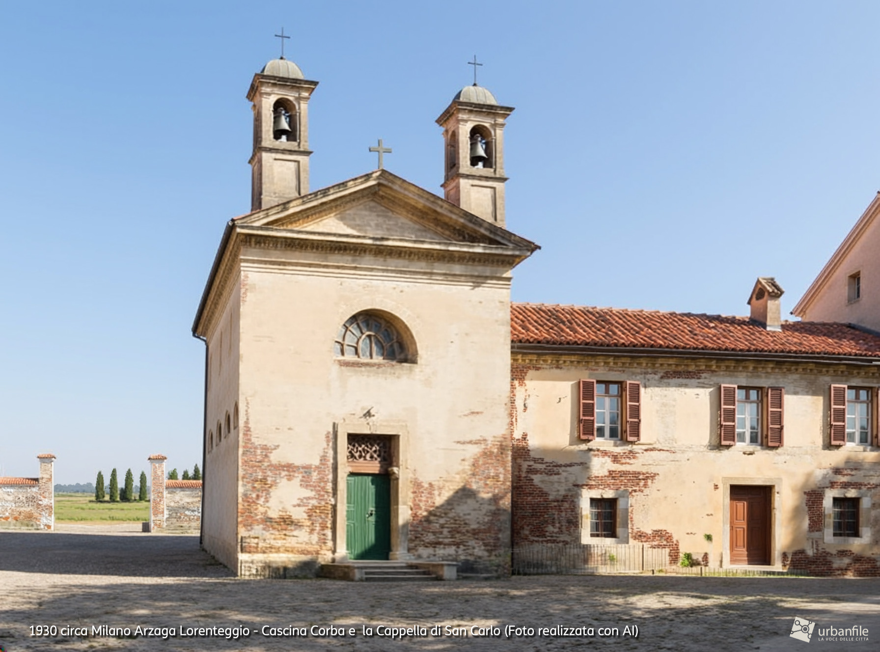 Accanto alla cascina sorgeva la chiesetta di San Carlo alla Corba, un modesto oratorio costruito alla fine del Seicento “per comodo del colono”. Se ne trovano tracce fino agli anni Trenta del Novecento; negli ultimi anni dipendeva dalla parrocchia di Santa Maria del Rosario e scomparve probabilmente con le demolizioni del secondo dopoguerra. Addossata a uno dei fabbricati rurali, aveva un’aula unica di gusto neoclassico, con due piccoli campanili ai lati del timpano. Una finestra a lunetta e tre aperture laterali garantivano l’illuminazione interna. Sull’altare era collocato un bassorilievo in gesso raffigurante San Carlo Borromeo mentre assiste gli appestati (del quale ignoriamo la storia).