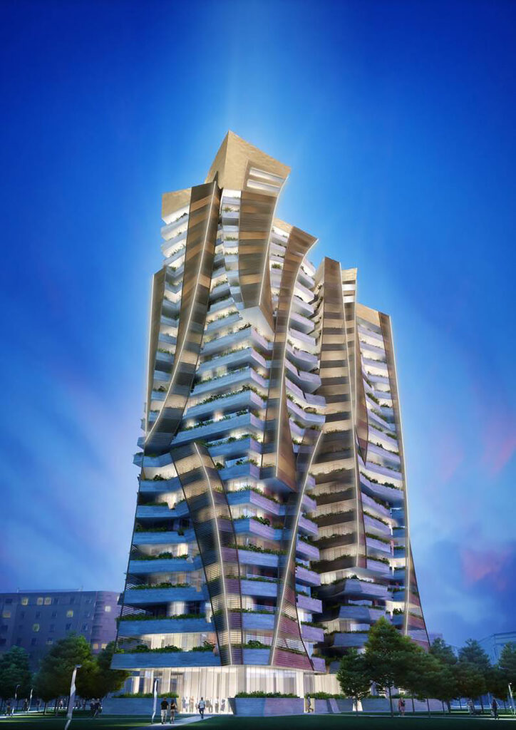 Si trattava — perché nel frattempo il progetto è stato completamente rivisto — di un edificio a destinazione residenziale che avrebbe dovuto affacciarsi su piazza Arduino. Il piano originario prevedeva 26 piani fuori terra (per un’altezza di circa 100 metri), 80 appartamenti e una superficie lorda di pavimento complessiva di 14.200 metri quadrati. Presentato nel 2010, il progetto portava la firma dello studio di Daniel Libeskind e richiamava nelle forme le residenze Libeskind già realizzate, seppur con linee ancora più articolate e dinamiche.