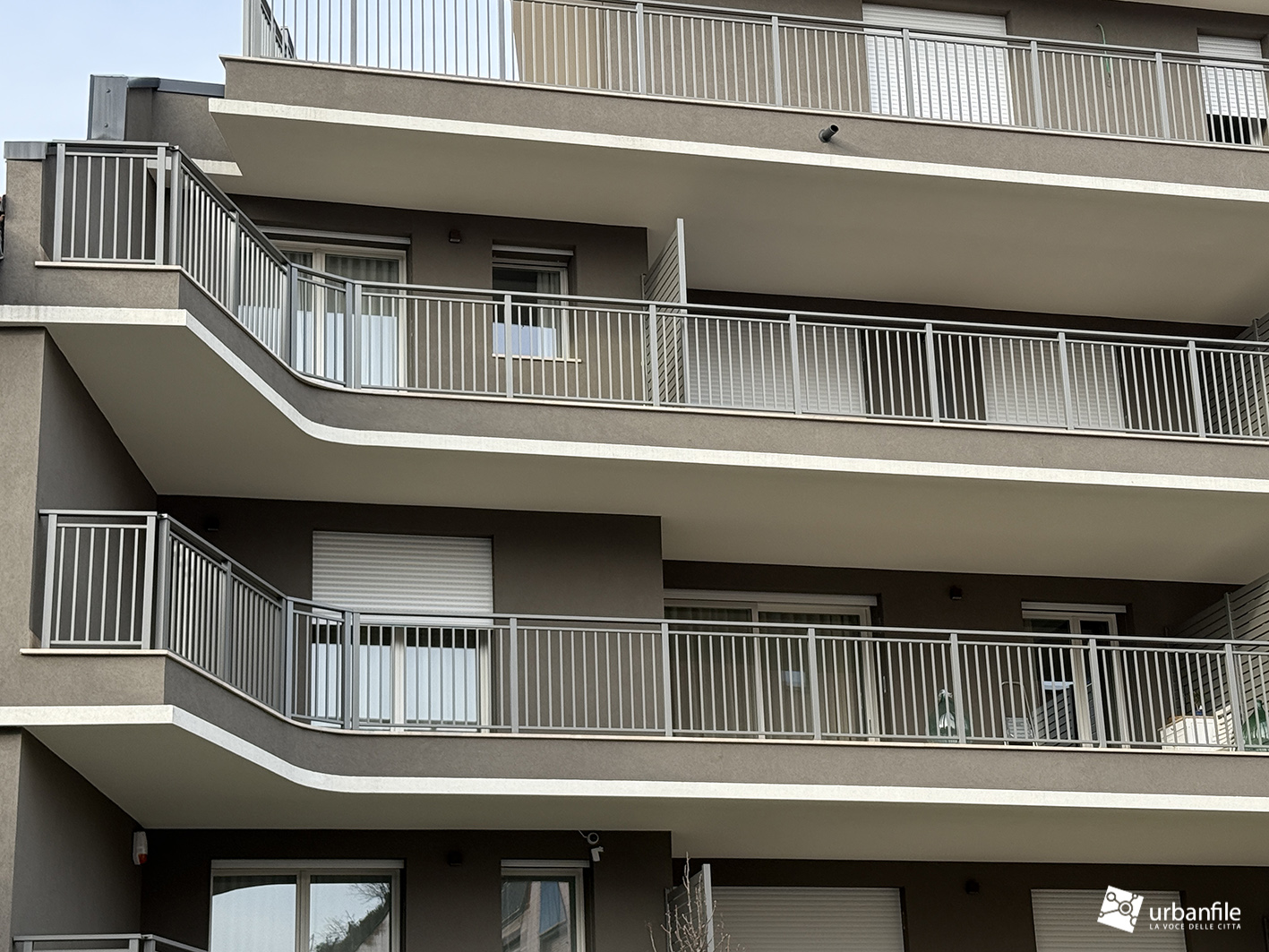 Particolarmente riuscita la scelta del colore salvia per gli intonaci, in piacevole contrasto con le ringhiere metalliche bianche e con le persiane. Apprezzabile anche la decisione di evitare balaustre in vetro, soluzione ormai molto diffusa ma non sempre armoniosa in contesti come questo.