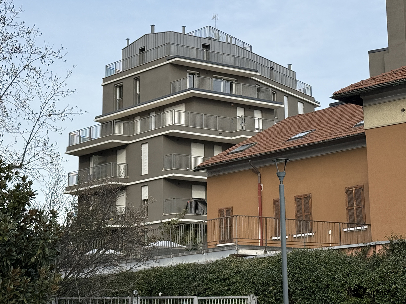 L’edificio si presenta elegante, senza eccessi o soluzioni eccentriche, e si inserisce con equilibrio in un contesto che, pur trovandosi lungo un’antica via e non lontano da vecchi cascinali, è oggi caratterizzato prevalentemente da edifici costruiti nella seconda metà del Novecento. La facciata principale dell’edificio più basso, affacciata sulla strada (il secondo corpo si sviluppa all’interno del lotto), è scandita da ampie terrazze che ne definiscono il ritmo architettonico.