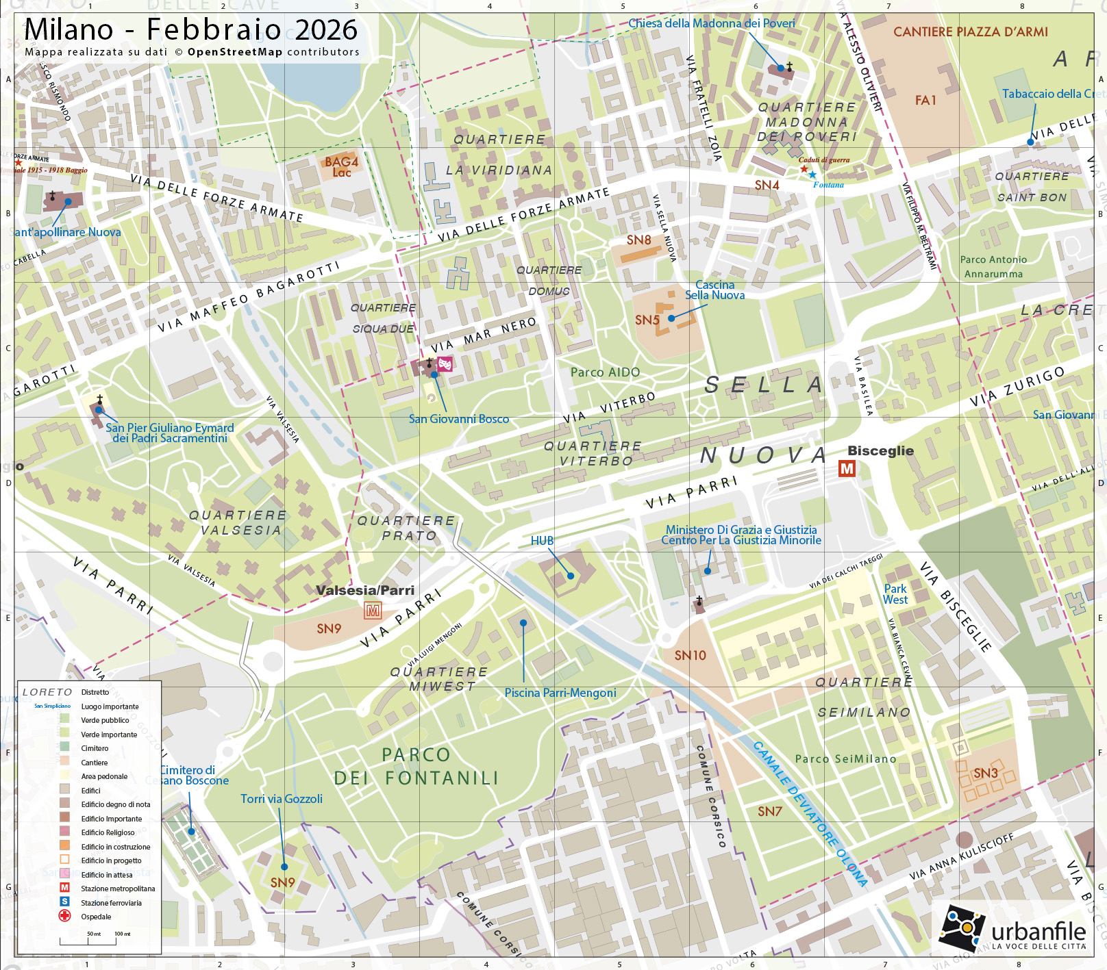 Febbraio 2026. Abbiamo compiuto un giretto in quel di Sella Nuova, l’area un tempo fulcro di un borgo autonomo poi aggregato al Comune di Baggio che a sua volta è stato annesso a quello di Milano nel 1923. Oggi Sella Nuova viene chiamata principalmente coi nomi di Bisceglie (grazie alla stazione M1) e anche Forze Armate. Nel suo territorio troviamo il nuovo quartiere di SeiMilano, dove abbiamo fatto un giretto fotografico, il cantiere di via Sella Nuova 10 che prevede la riqualificazionedi un vecchio stabile e la riqualificazione dell’antica cascina, unica parte dell’antico borgo che tarda a decollare col suo progetto.