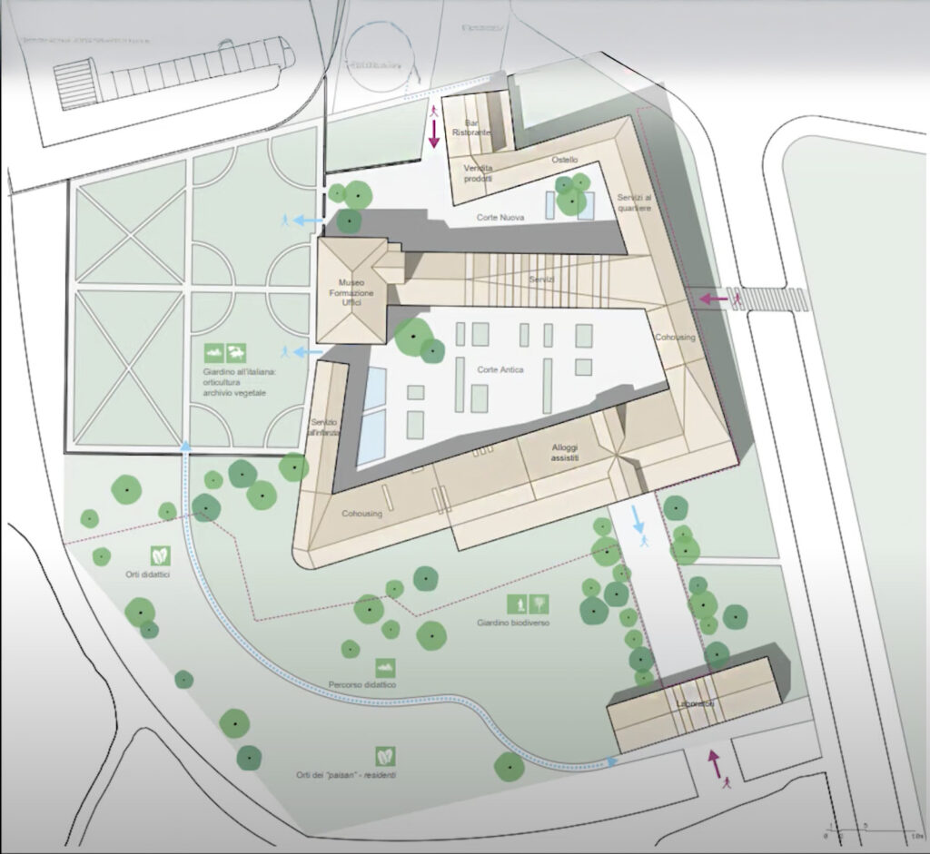 Il progetto prevede l’integrale riqualificazione del bene con la realizzazione di circa 125 unità abitative in classe energetica A, e circa 120 posti auto e cantine.