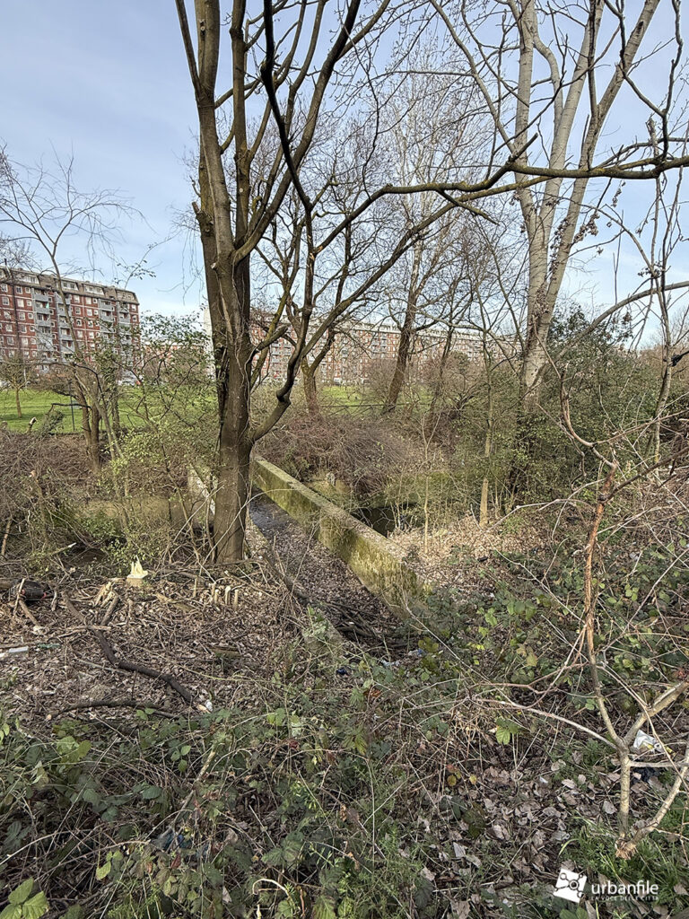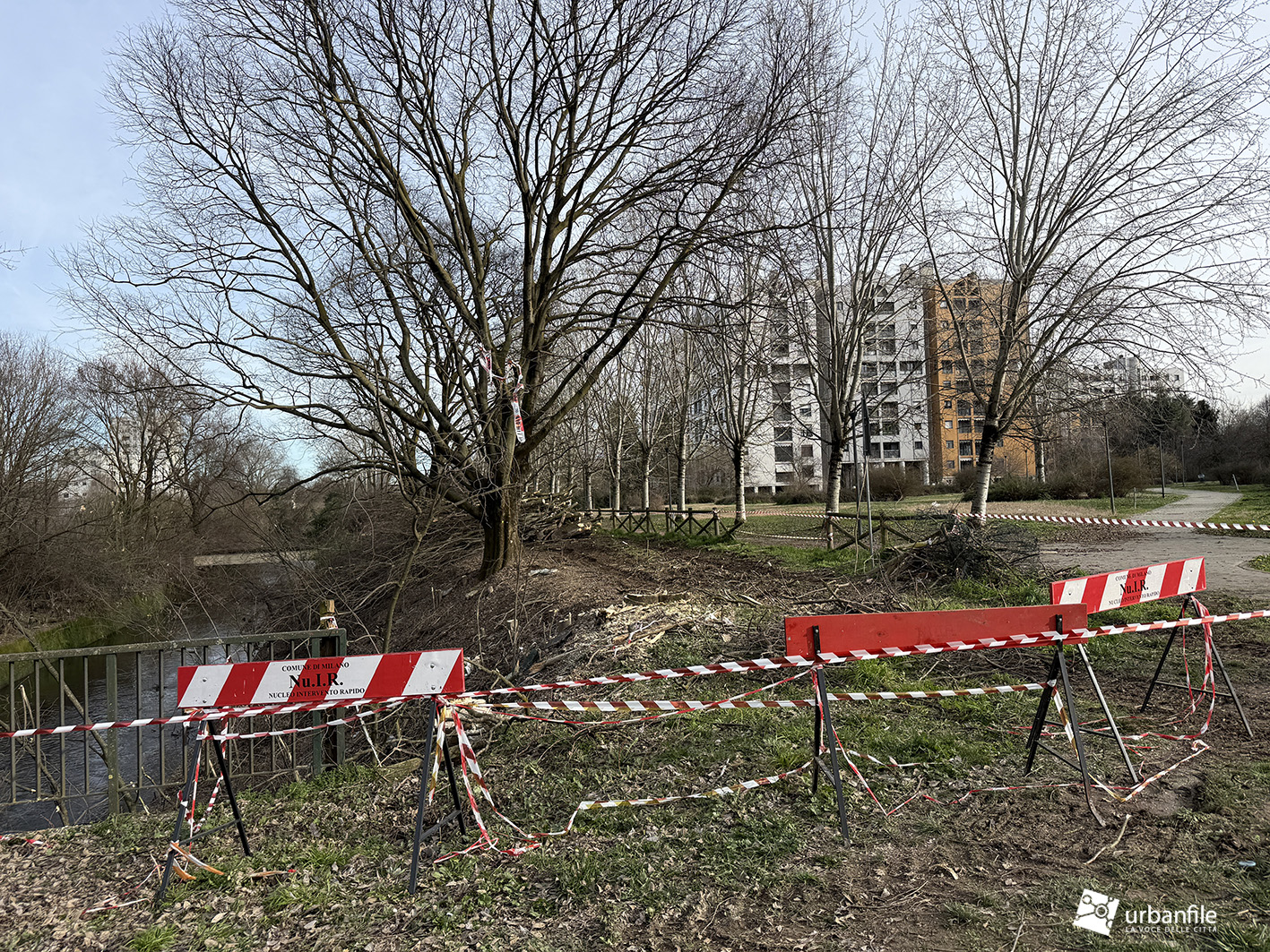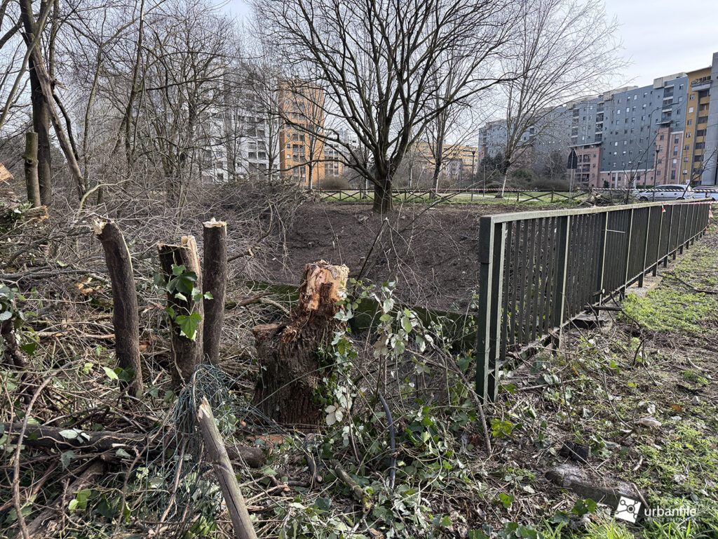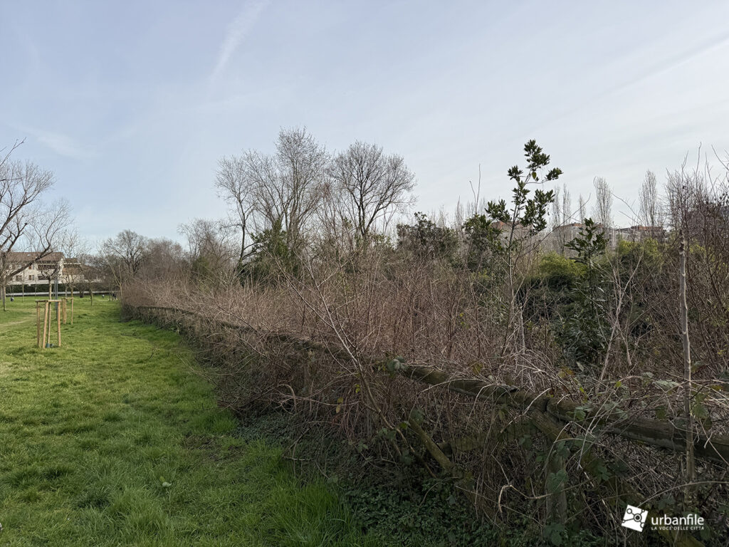 Lungo le sponde – l’acqua scorre a un livello inferiore di quattro o cinque metri rispetto al parco – erano cresciuti bagolari (Celtis australis), olmi e pioppi bianchi, insieme a specie infestanti come ailanto e robinia. Nel tempo, queste piante si erano sviluppate rigogliose, con rami che in alcuni casi arrivavano fino al corso d’acqua.
