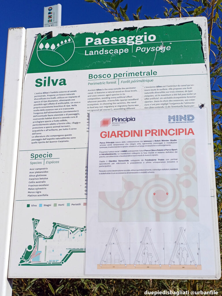 Il progetto si integra inoltre nel percorso verde che circonda l’ex sito Expo di MIND. L’antica Silva, situata oltre il canale perimetrale, propone un bosco naturale diversificato su tre livelli, caratterizzato da un impianto disetaneo (con alberi di età differenti), volto a ridurre ogni effetto di artificialità. Si configura come un vero e proprio ecosistema boschivo ripariale.