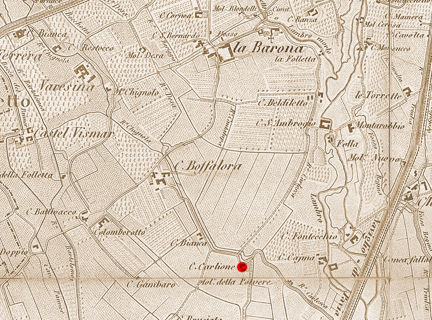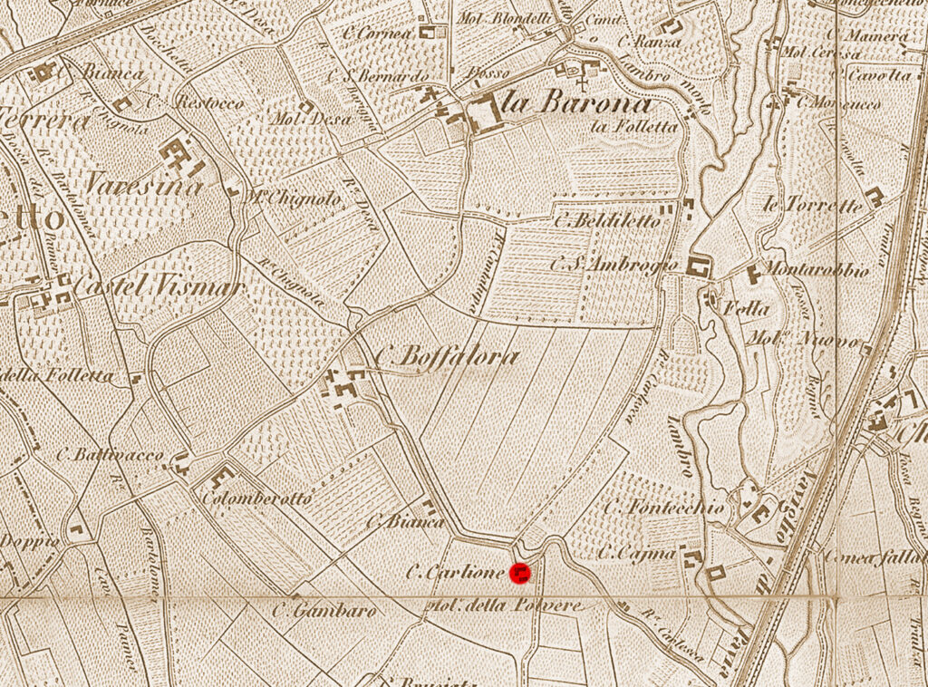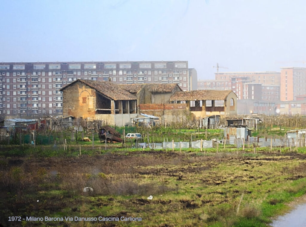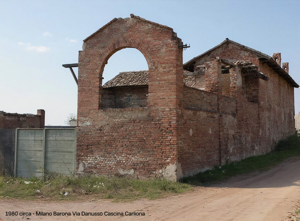 Questa volta lo sguardo si posa nell’estrema periferia della Barona, al margine del Quartiere Sant’Ambrogio, nei pressi dello Scolmatore dell’Olona. Qui giace, ormai in totale rovina, una delle più antiche cascine di proprietà comunale, acquistata nel 1964: la Cascina Carliona (originariamente “Carlione”, come attestano i corsi d’acqua limitrofi Carlione e Carlioncino). Un tempo aveva indirizzo in via Boffalora 75; oggi risulta “domiciliata” in via Danusso, strada moderna che le scorre accanto.