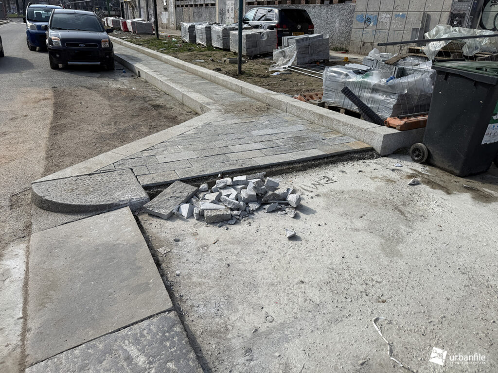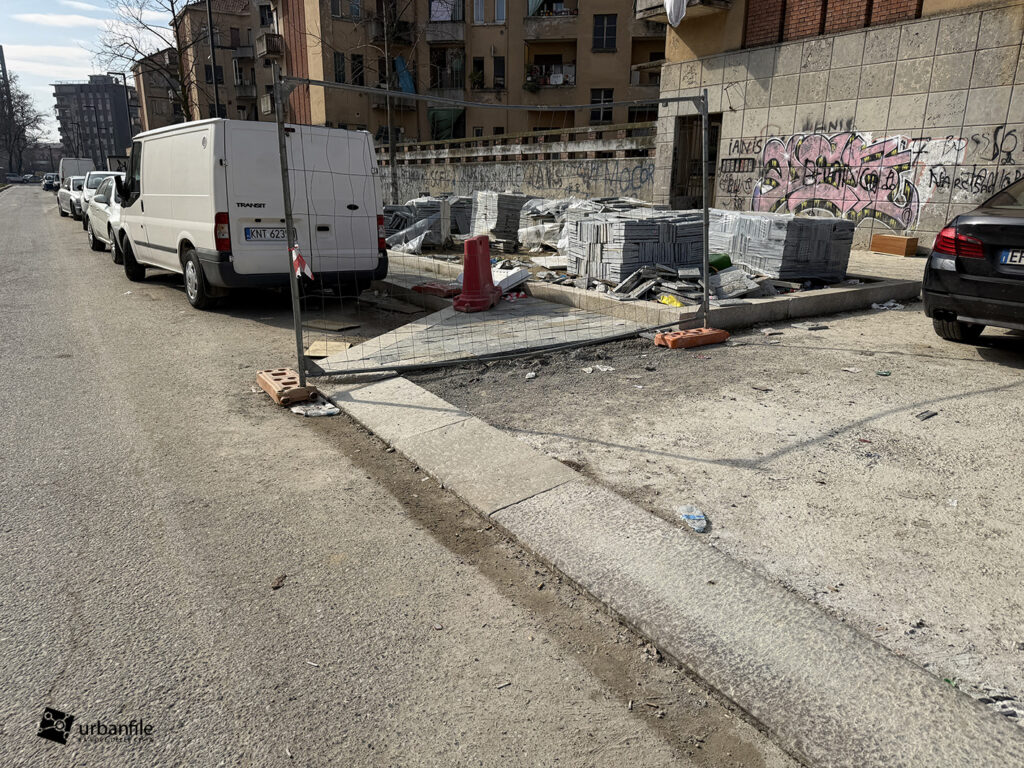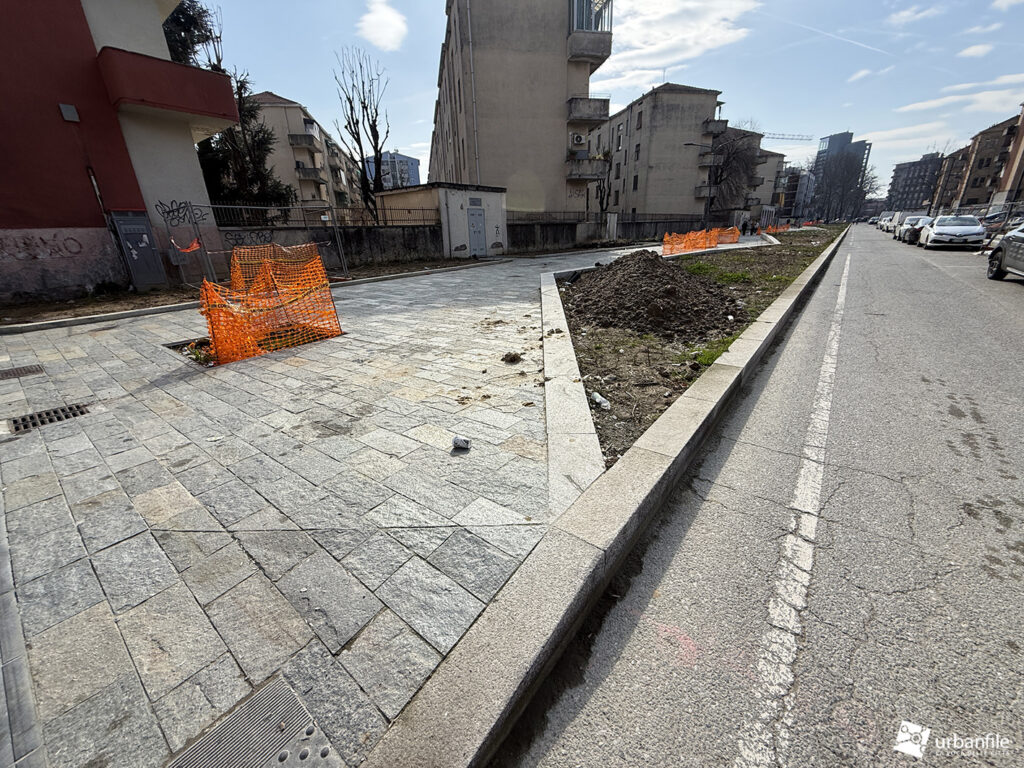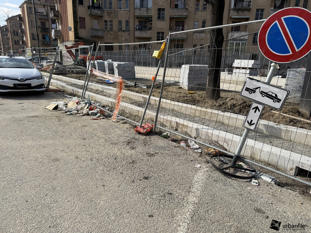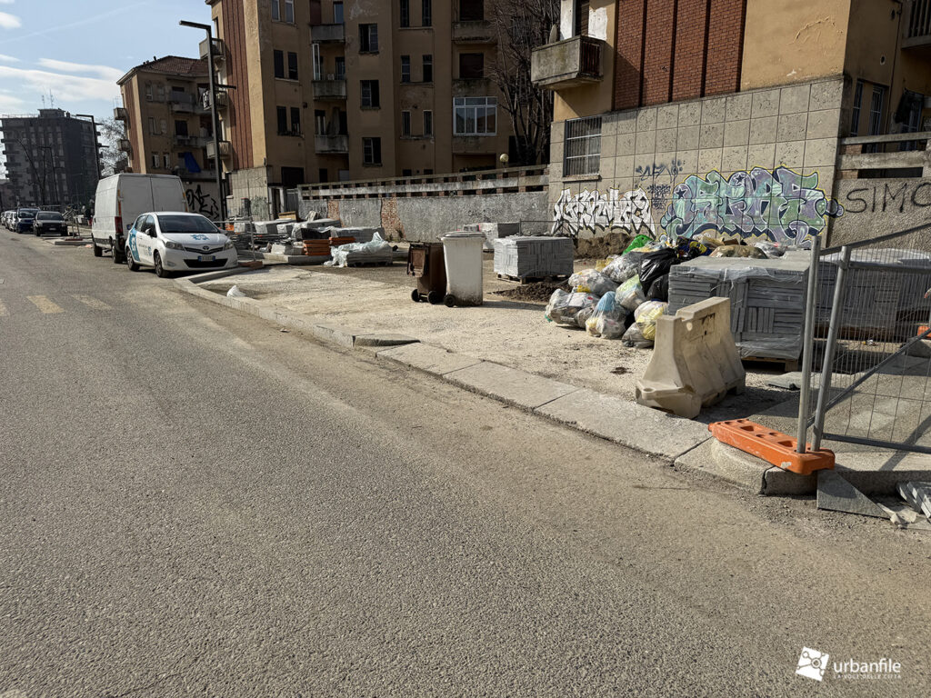 Mentre il lato pari è mezzo fatto, e in parte aperto al passaggio pedonale, visto che il marciapiede sul lato dispari è interdetto dal cantiere che comunque, lentamente, prosegue.