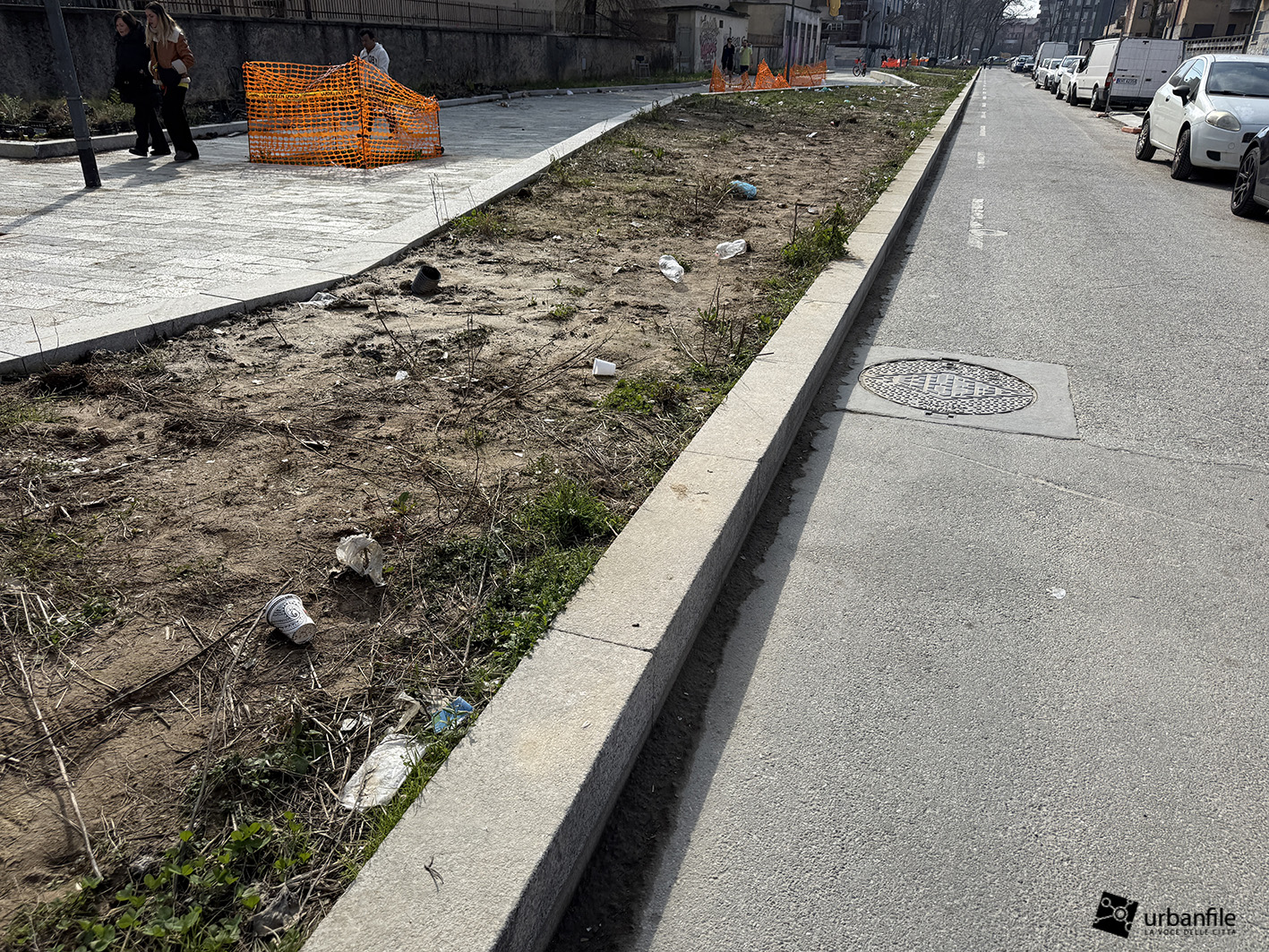 Mentre il lato pari è mezzo fatto, e in parte aperto al passaggio pedonale, visto che il marciapiede sul lato dispari è interdetto dal cantiere che comunque, lentamente, prosegue.