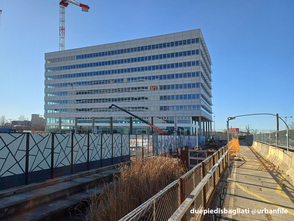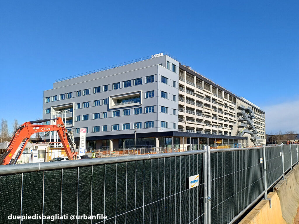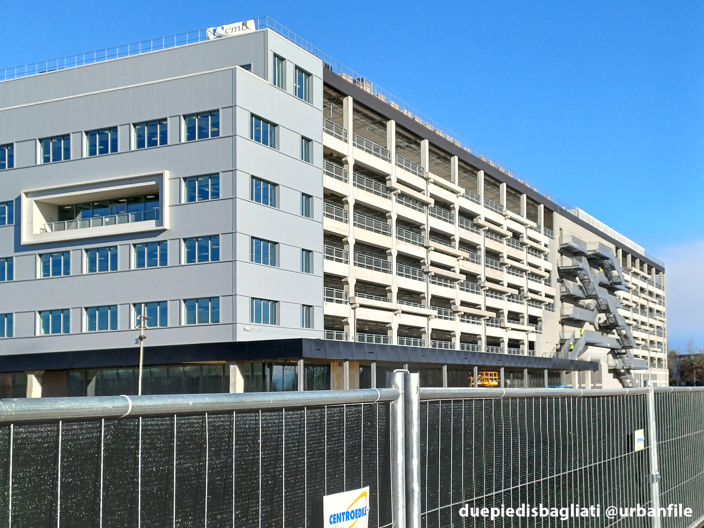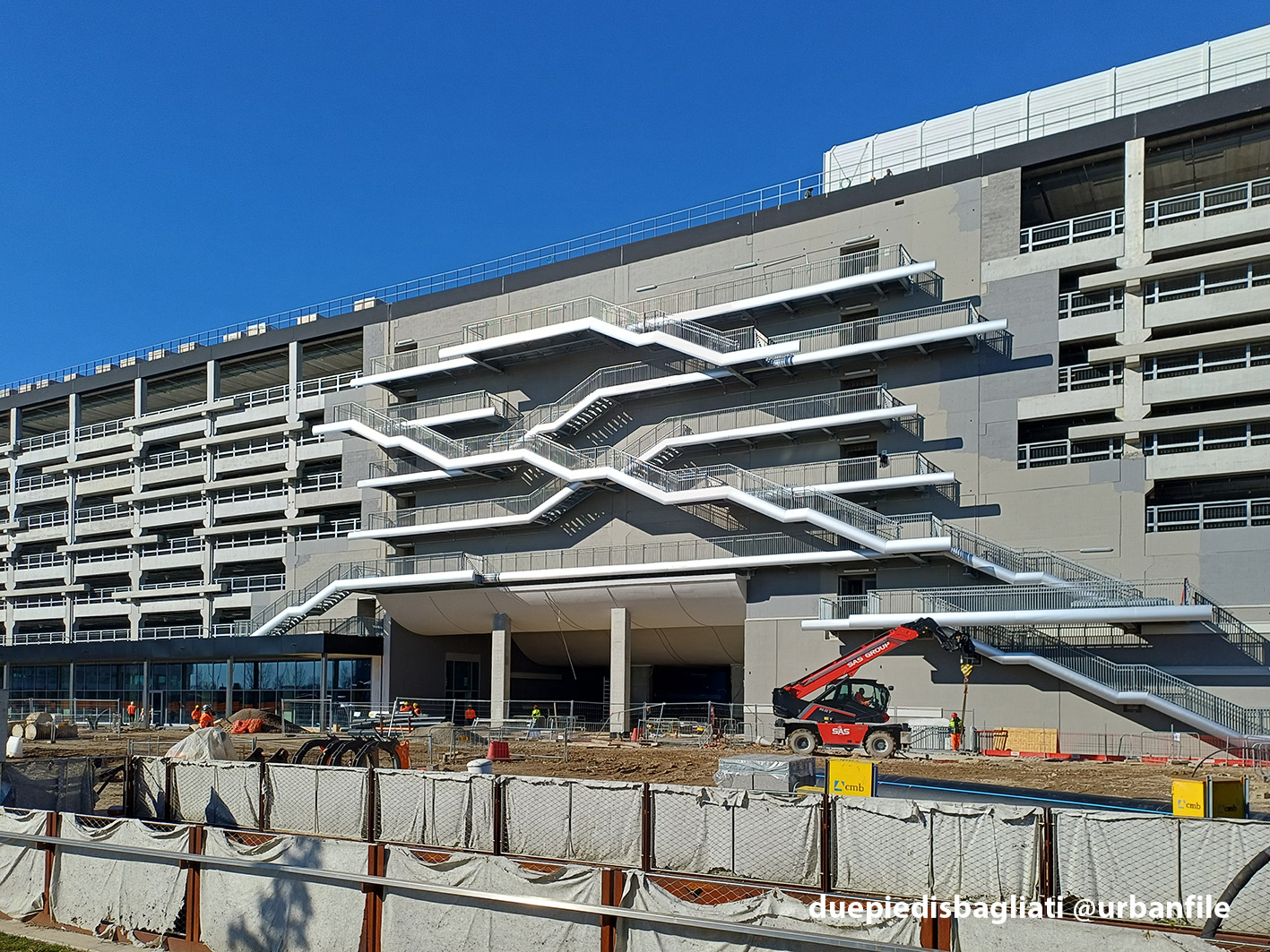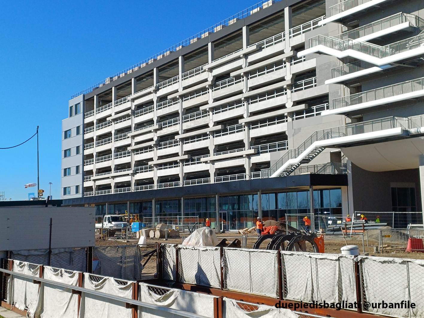 L’edificio di MoLo è anch’esso ormai in fase di completamento. Si iniziano a vedere le facciate e sono terminati anche i lavori per il montaggio delle scale esterne che fungeranno anche da “decorazione” del complesso direzionale. Sulla facciata sono state montate lunghe vasche per le piante che fungeranno da decorazione e per nascondere il parcheggio.