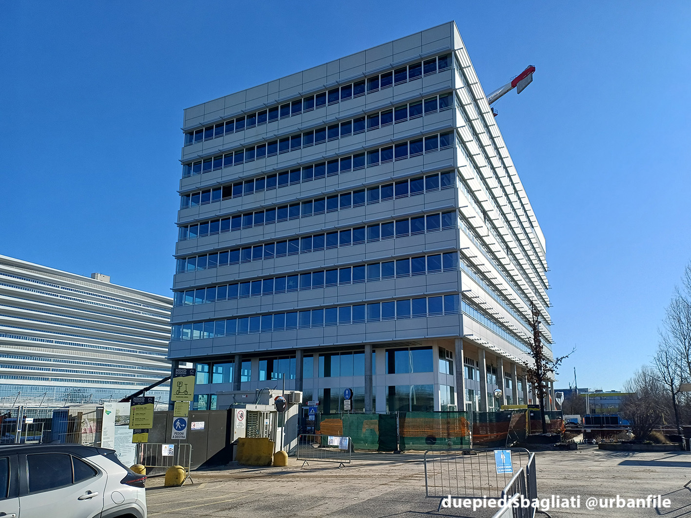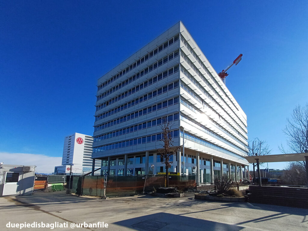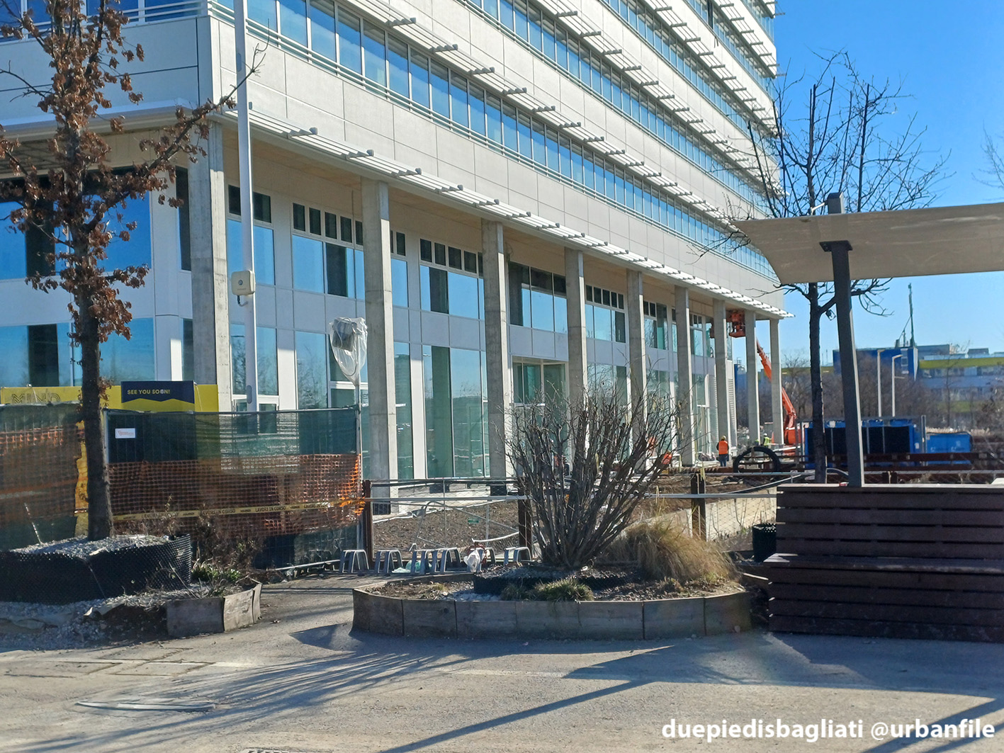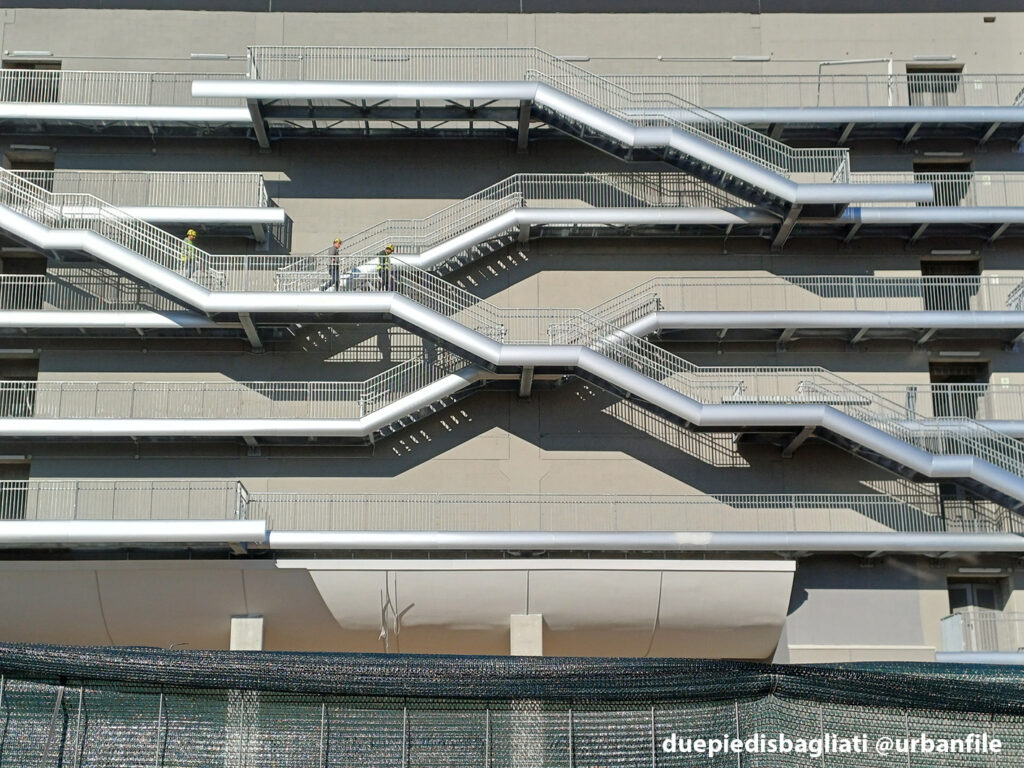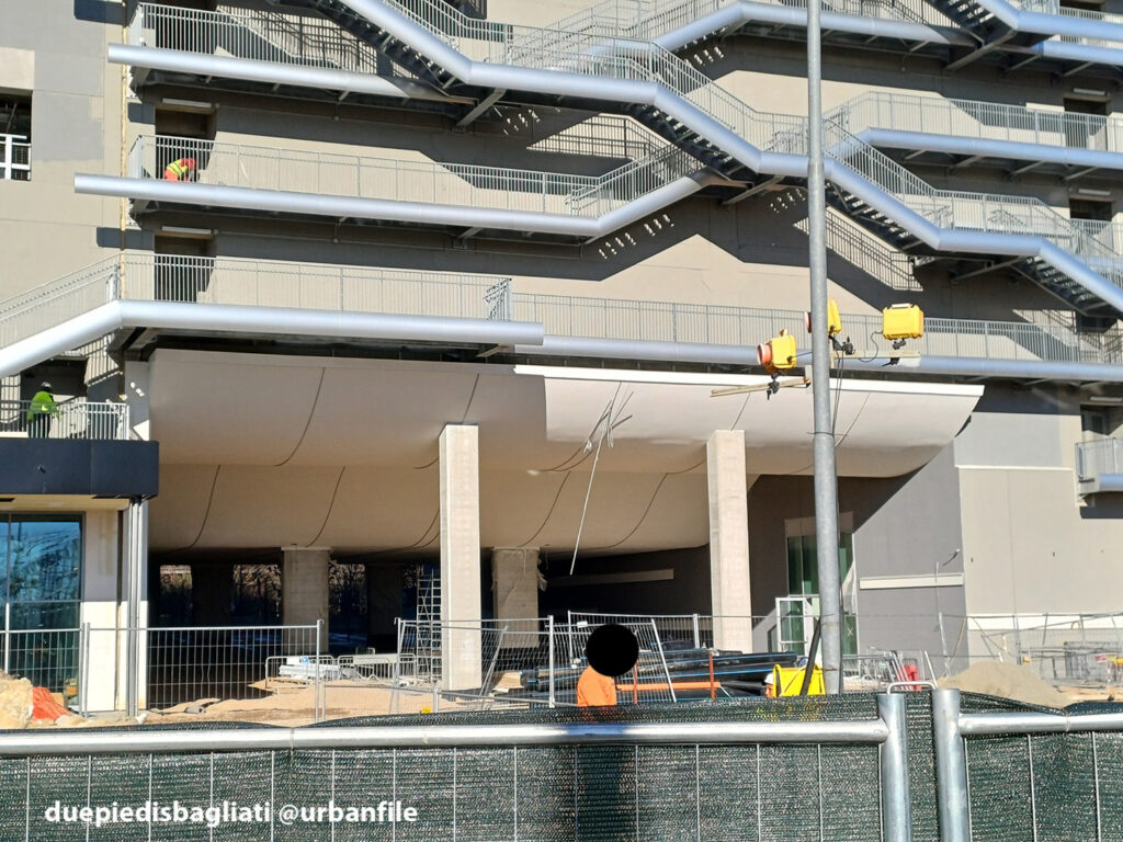 L’edificio di MoLo è anch’esso ormai in fase di completamento. Si iniziano a vedere le facciate e sono terminati anche i lavori per il montaggio delle scale esterne che fungeranno anche da “decorazione” del complesso direzionale. Sulla facciata sono state montate lunghe vasche per le piante che fungeranno da decorazione e per nascondere il parcheggio.