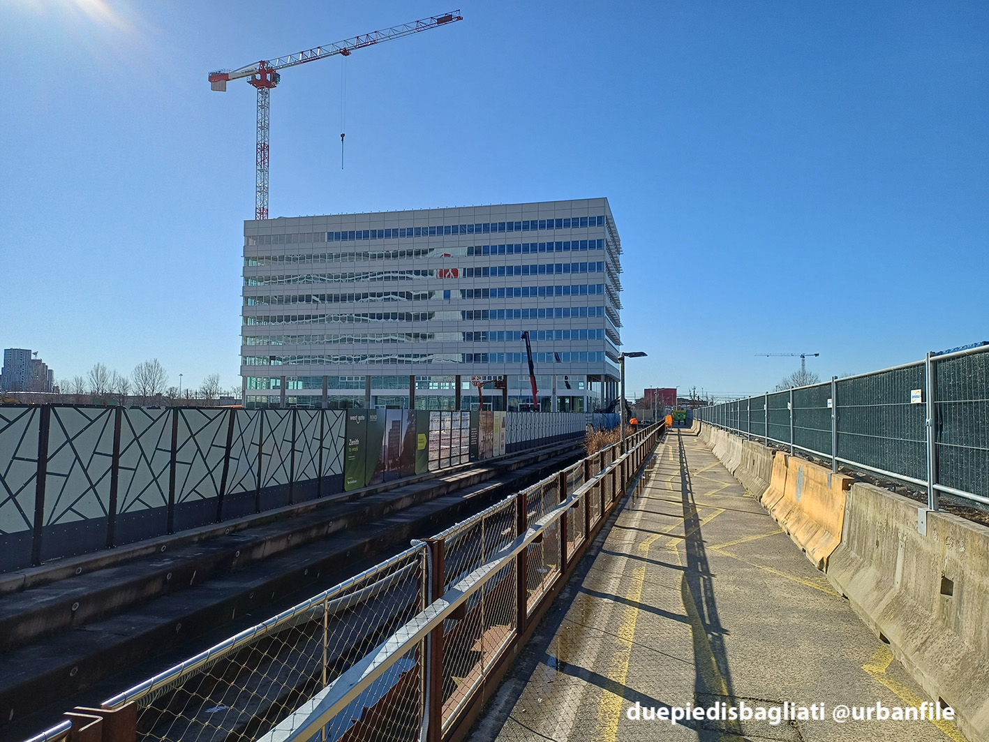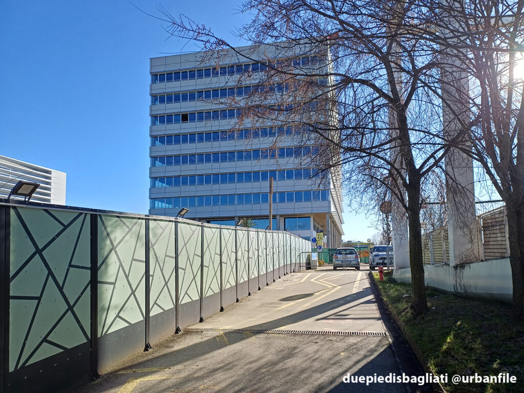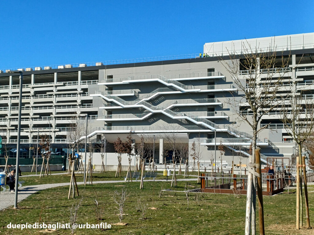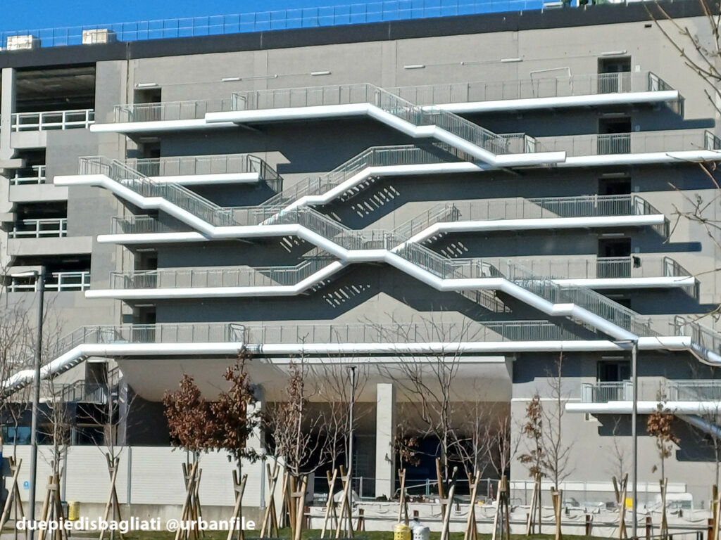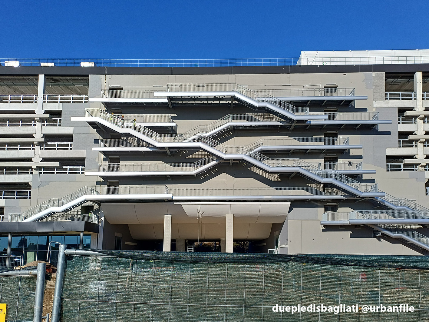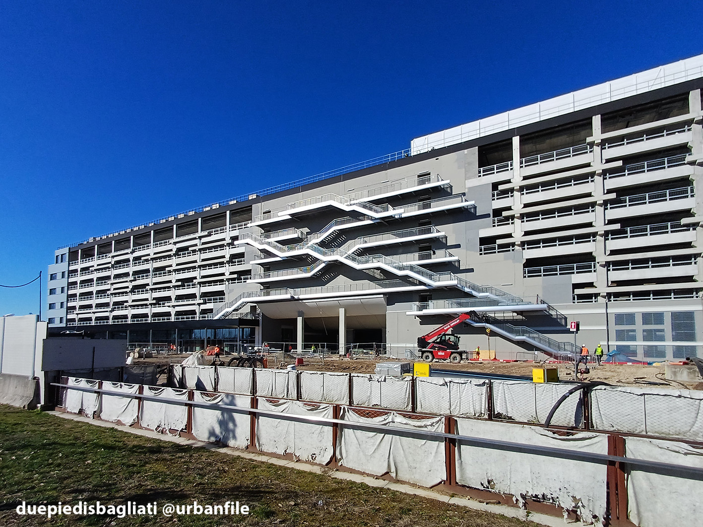 L’edificio di MoLo è anch’esso ormai in fase di completamento. Si iniziano a vedere le facciate e sono terminati anche i lavori per il montaggio delle scale esterne che fungeranno anche da “decorazione” del complesso direzionale. Sulla facciata sono state montate lunghe vasche per le piante che fungeranno da decorazione e per nascondere il parcheggio.