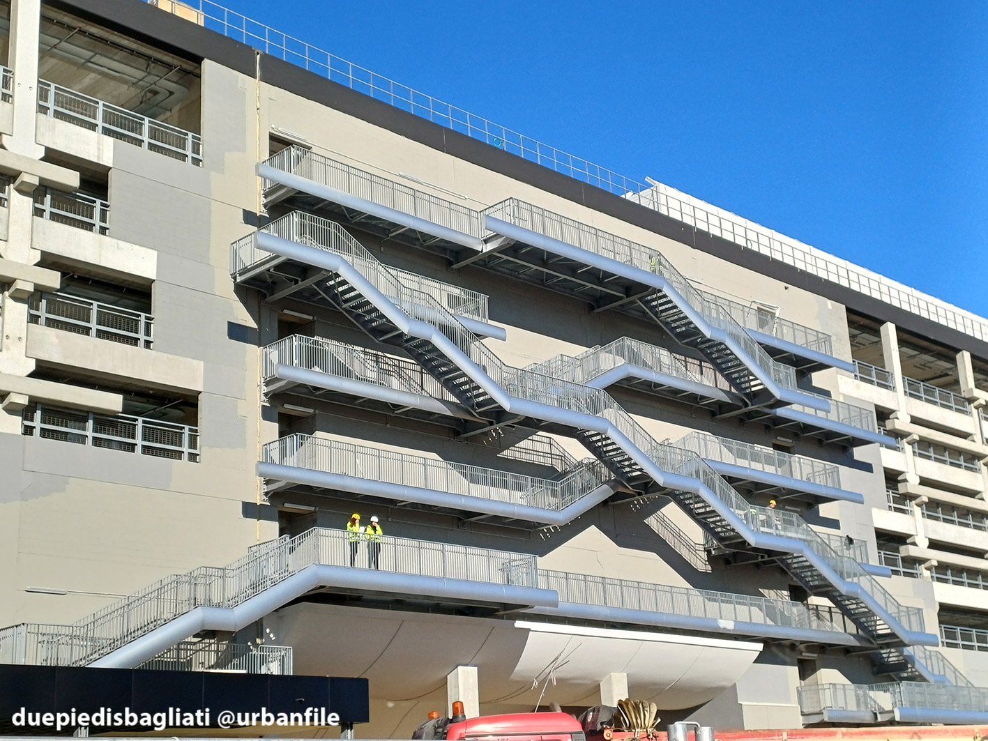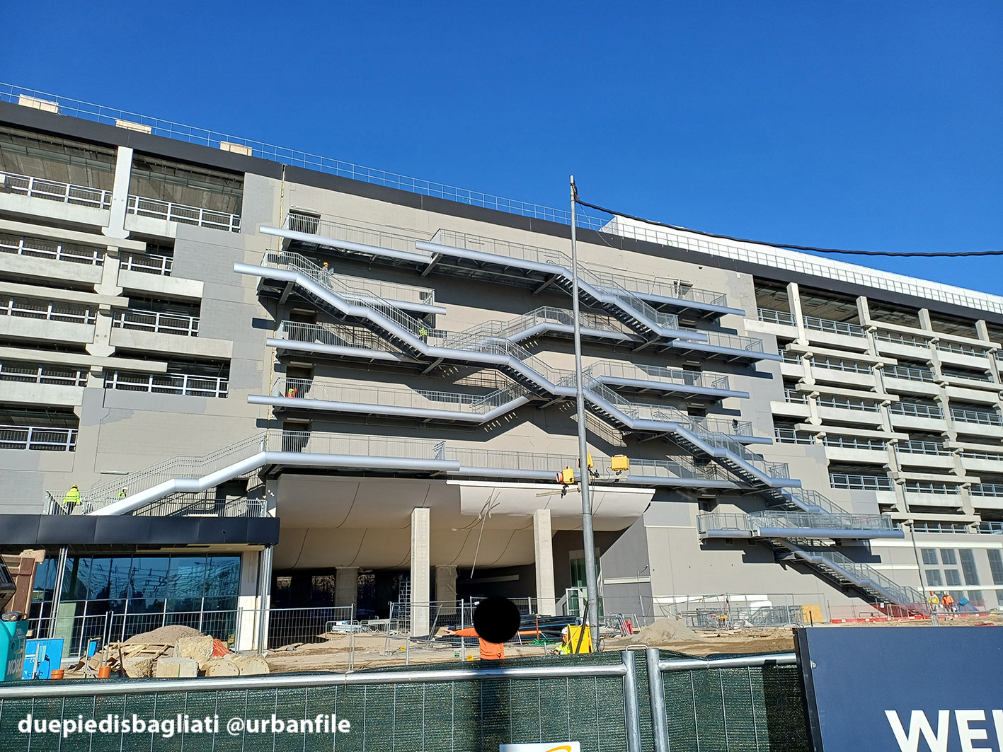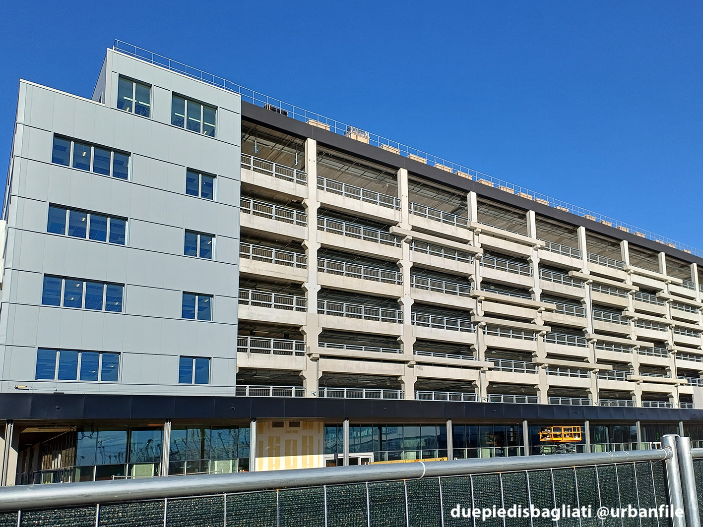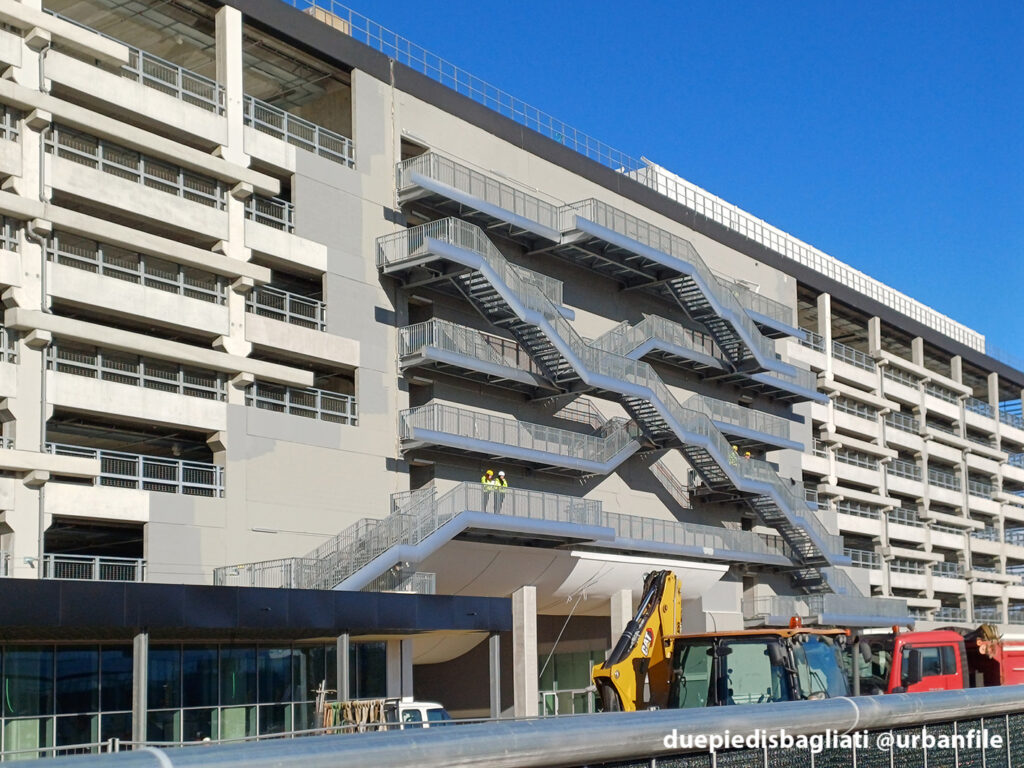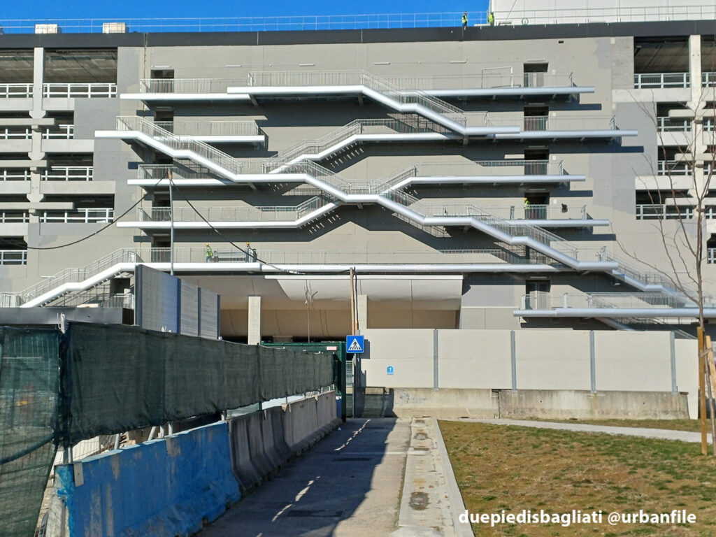 L’edificio di MoLo è anch’esso ormai in fase di completamento. Si iniziano a vedere le facciate e sono terminati anche i lavori per il montaggio delle scale esterne che fungeranno anche da “decorazione” del complesso direzionale. Sulla facciata sono state montate lunghe vasche per le piante che fungeranno da decorazione e per nascondere il parcheggio.