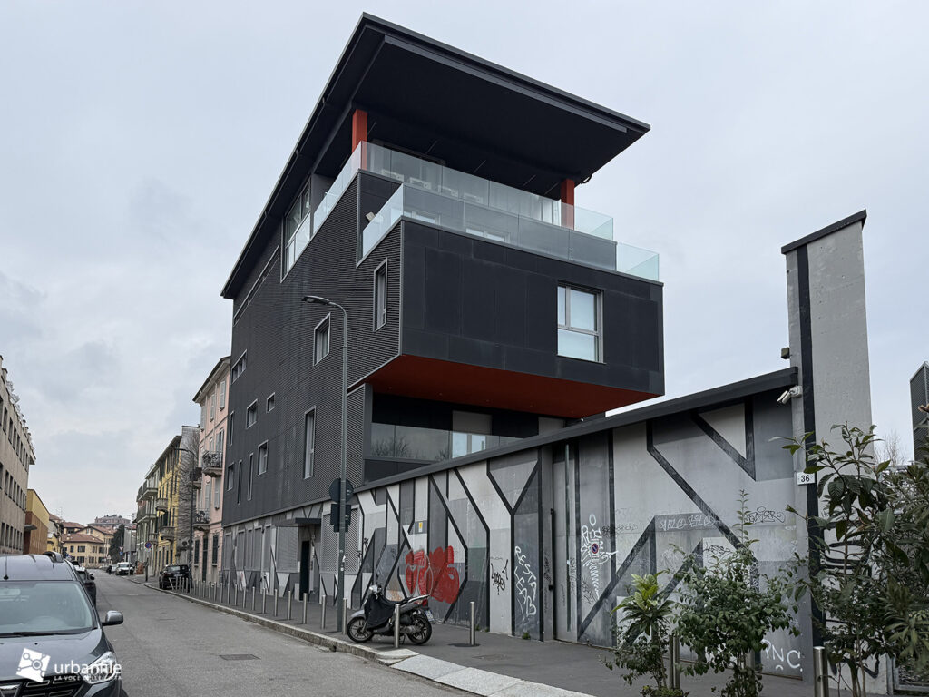 L’aspetto dell’edificio è apparentemente industriale ma d’effetto. Progettato da D.N.A. dYNAMIC nETWORK aRCHITECTS Studio Associato di Lorenzo Rossi e Luca Rossi, la costruzione non è mai parsa veramente abitata (impressione data ogni qual volta passiamo da queste parti, cosa che facciamo spesso), peccato, perché quelle terrazze e logge meriterebbero un po’ di verde e animazione.