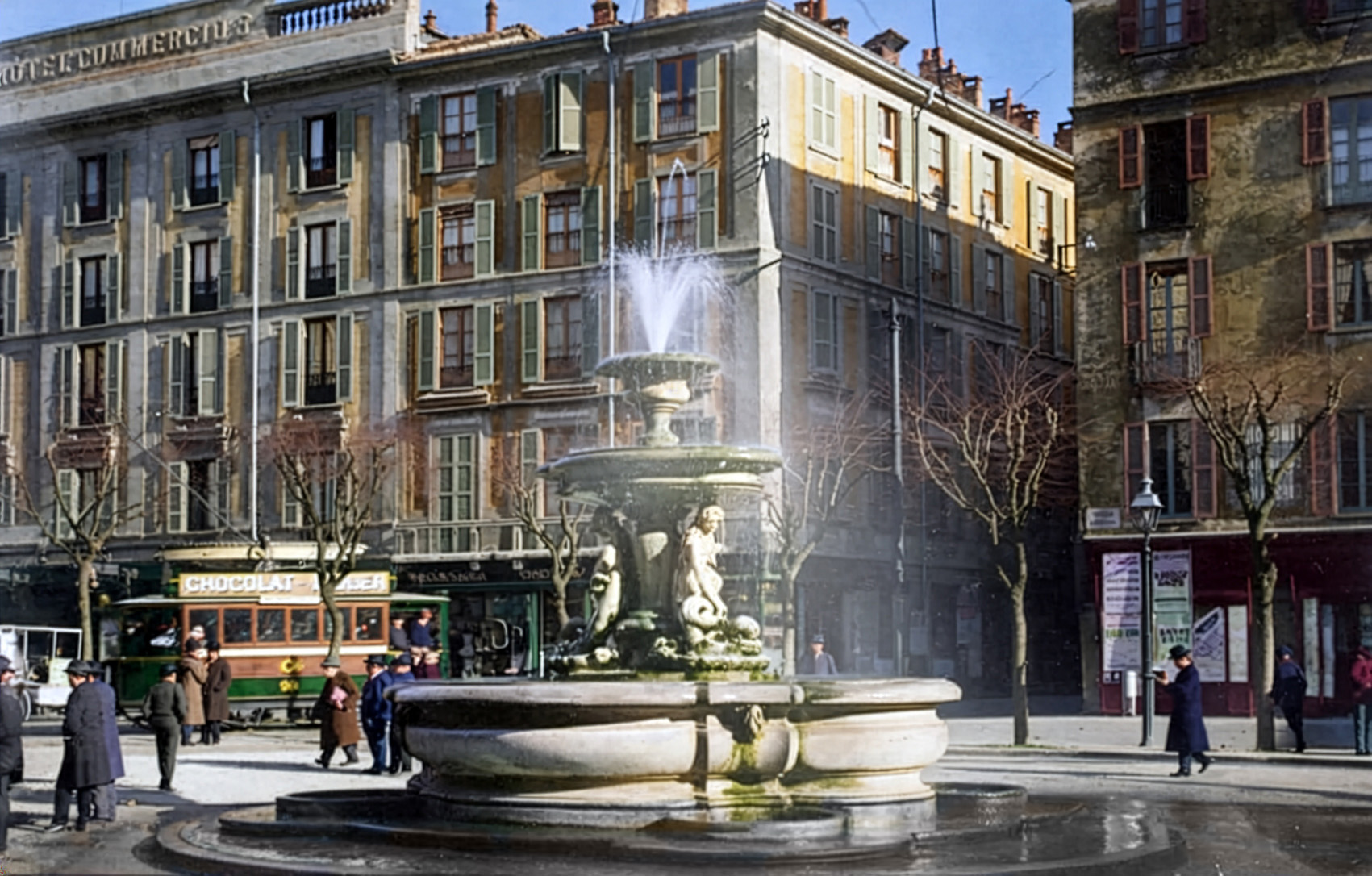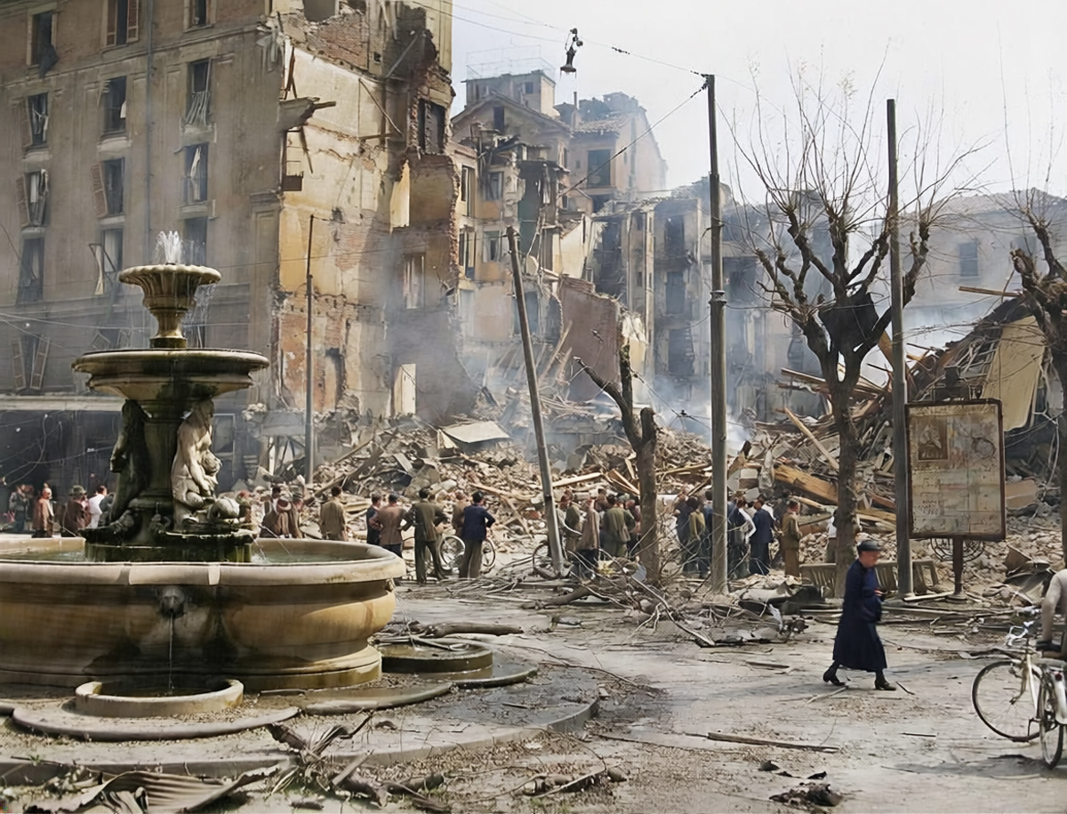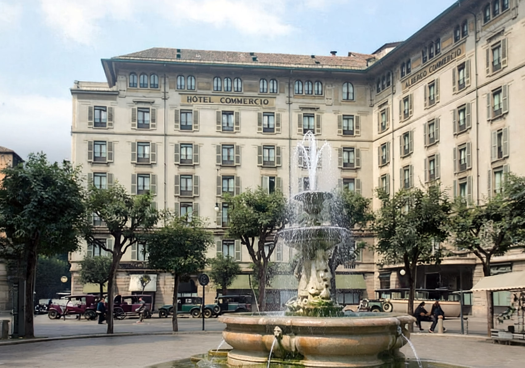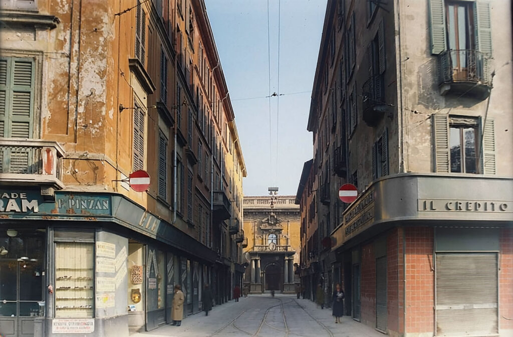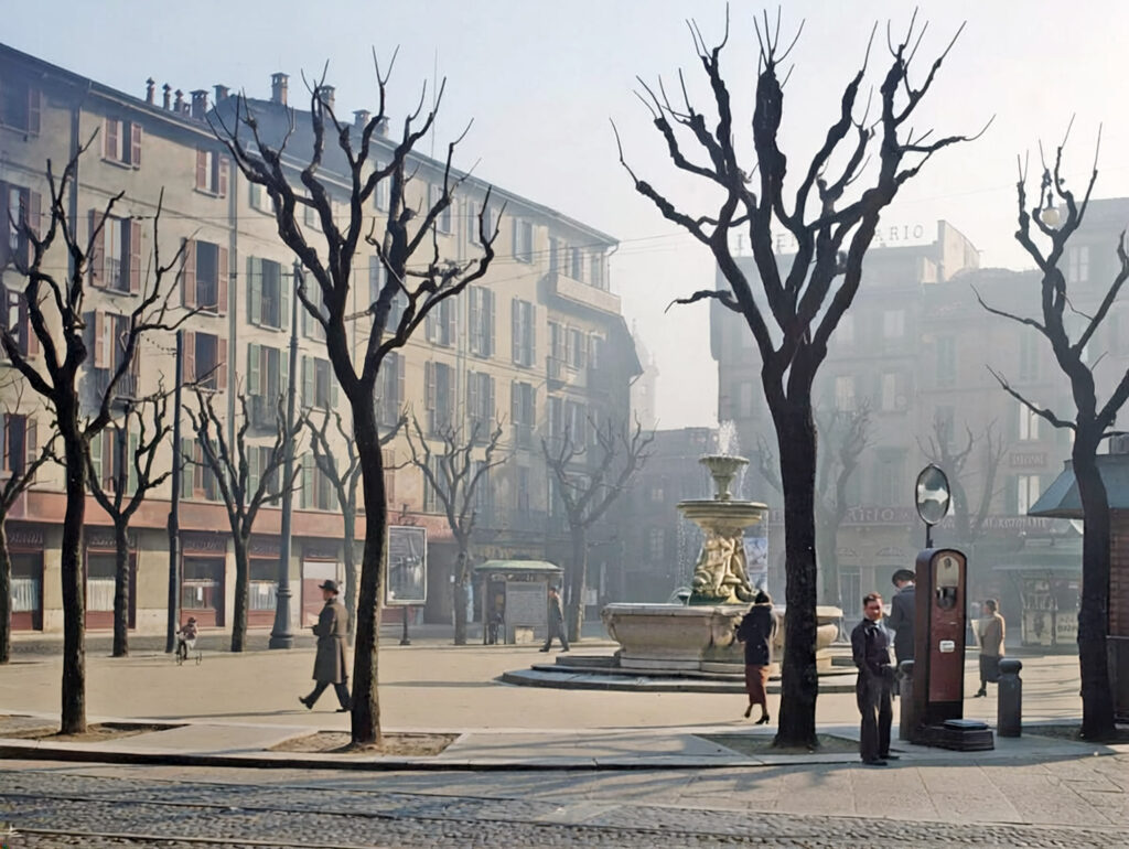 Di seguito alcune foto d’epoca ricolorate che mostrano le parti di piazza Fontana oggi scomparse dove sorge ora il nuovo palazzo. In ordine: 1920 circa; 1926 circa con la via Alciato (scomparsa); l’Albergo Commercio nel 1928 circa; la piazza nel 1930 circa; l’area dell’Albergo Commercio devastata dai bombardamenti.