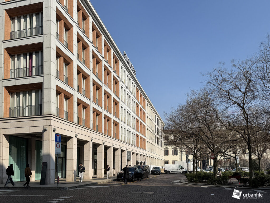 Si tratta di un edificio porticato che riprende e completa le forme progettate già nel 2000 dallo studio Arassociati per ricostruire la quinta interrotta negli anni Cinquanta. Il progetto era stato realizzato solo in parte con il completamento, nel 2009, dell’Hotel Rosa Grand, mentre il lato verso piazza Beccaria era rimasto irrisolto.