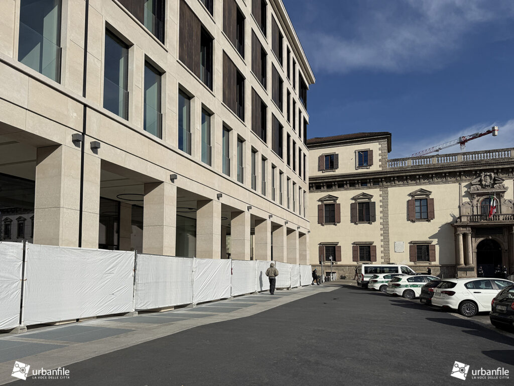Febbraio 2026. Possiamo dire che il cantiere per la costruzione del nuovo edificio in piazza Fontana, destinato a completare la “quinta” sul lato settentrionale della piazza, rimasta incompleta per oltre 70 anni, è giunto a conclusione (anche se il portico è ancora interdetto).