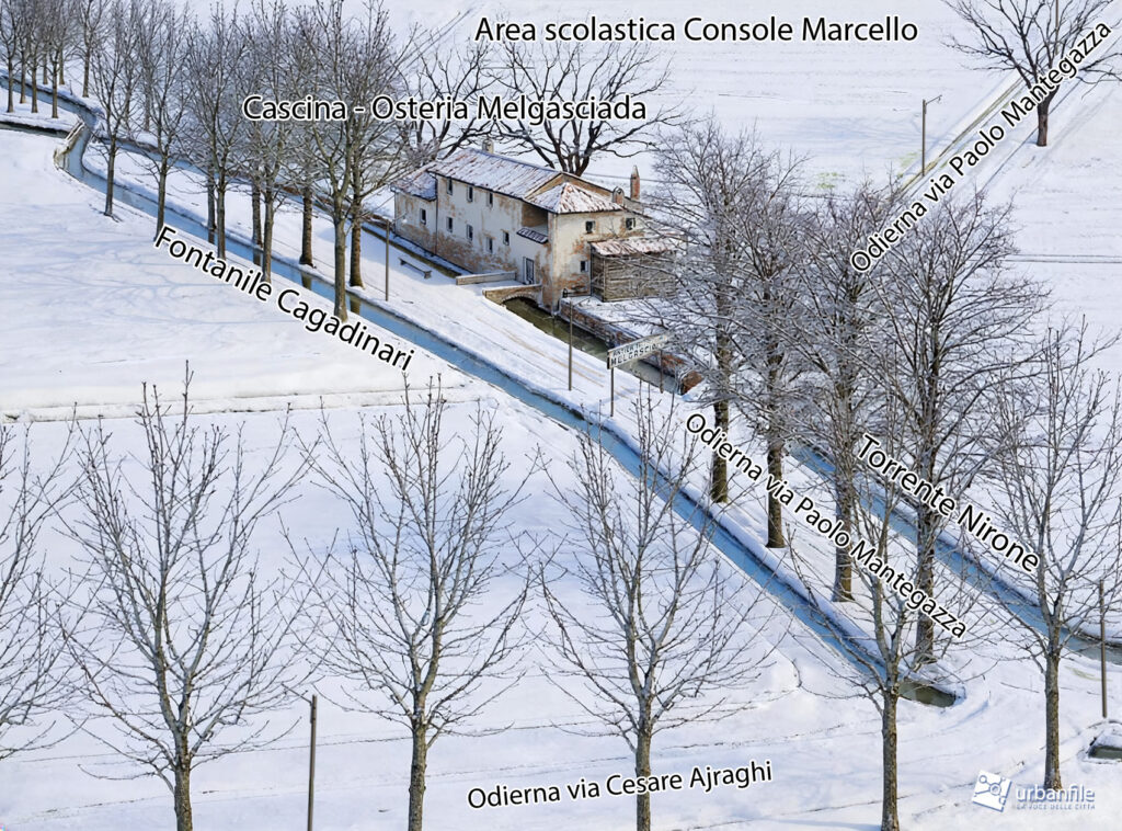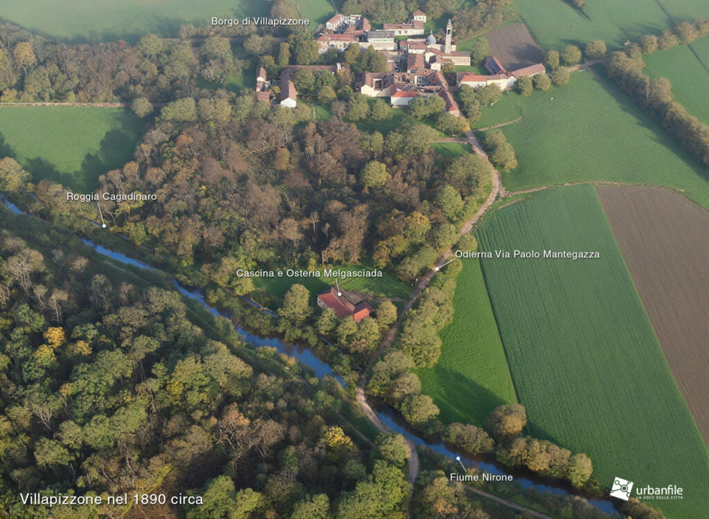 Oggi via Paolo Mantegazza, che ricalca un’antica strada di Villapizzone e partendo da via Cesare Ajraghi piega a gomito prima a destra poi a sinistra verso piazza Villapizzone attraversando via Console Marcello, ha ancora parte dei vecchi edifici che han visto la presenza della cascina. Nella nostra ricostruzione si vede bene dove la via Mantegazza piega a gomito dove oggi c’è il garage e dove all’epoca vi era l’ingresso all’osteria. In questo punto a destra della via correva il torrente Nirone e a sinistra il fontanile Cagadinari.