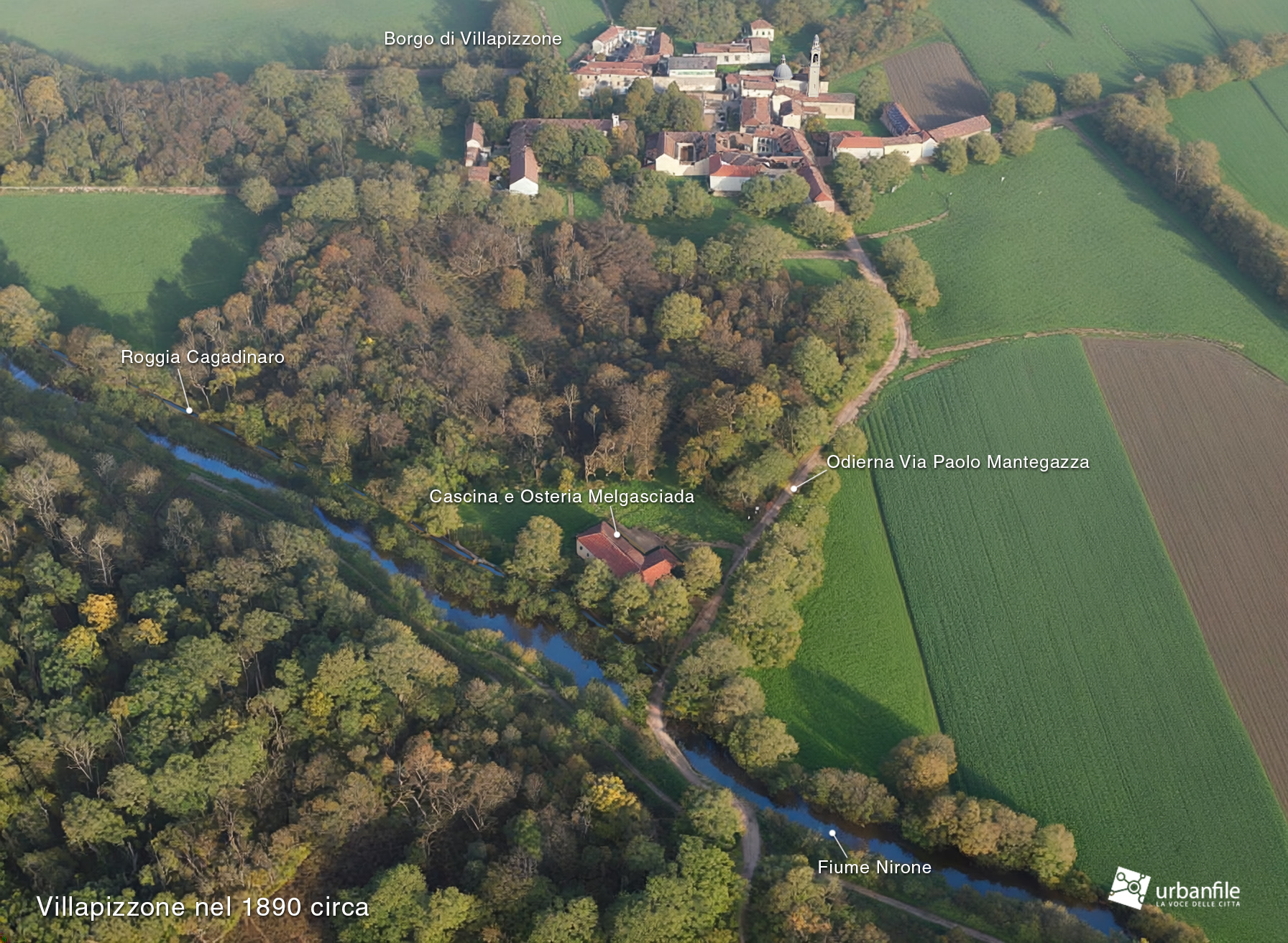 Oggi via Paolo Mantegazza, che ricalca un’antica strada di Villapizzone e partendo da via Cesare Ajraghi piega a gomito prima a destra poi a sinistra verso piazza Villapizzone attraversando via Console Marcello, ha ancora parte dei vecchi edifici che han visto la presenza della cascina. Nella nostra ricostruzione si vede bene dove la via Mantegazza piega a gomito dove oggi c’è il garage e dove all’epoca vi era l’ingresso all’osteria. In questo punto a destra della via correva il torrente Nirone e a sinistra il fontanile Cagadinari.