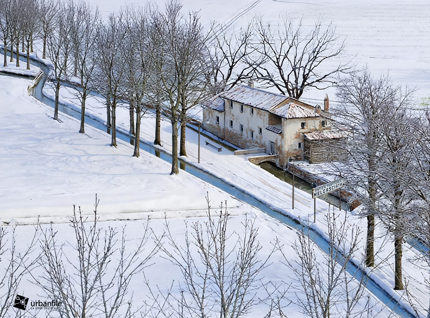 Oltre la strada d’accesso e un’ampia aia posta a ponente, scorreva un secondo corso d’acqua, in questo caso artificiale: il fontanile del Cagadinari o Cagadenari. Pochi metri prima, esso superava il torrente tramite un piccolo acquedotto in cotto, a forma di ponte.