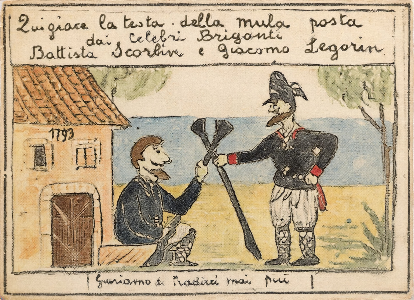 Secondo la leggenda, l’osteria sarebbe stata una delle basi della loro banda e il luogo in cui i due avrebbero nascosto un tesoro. Questa memoria fu rafforzata nel Settecento dalla presenza di due affreschi di gusto popolare sulle pareti dell’edificio: il primo raffigurava un’aggressione ai danni di un viandante, il secondo — datato 1793 — mostrava due banditi nell’atto di incrociare i tromboni in segno di giuramento, accompagnati dalla scritta: “Giuriamo di tradirci mai più”. Un’ulteriore iscrizione evocava la presenza della “testa della mula” posta dai briganti, alimentando per secoli l’immaginario collettivo. Anche il nome del fontanile Cagadenari contribuì a rafforzare l’idea di ricchezze nascoste.