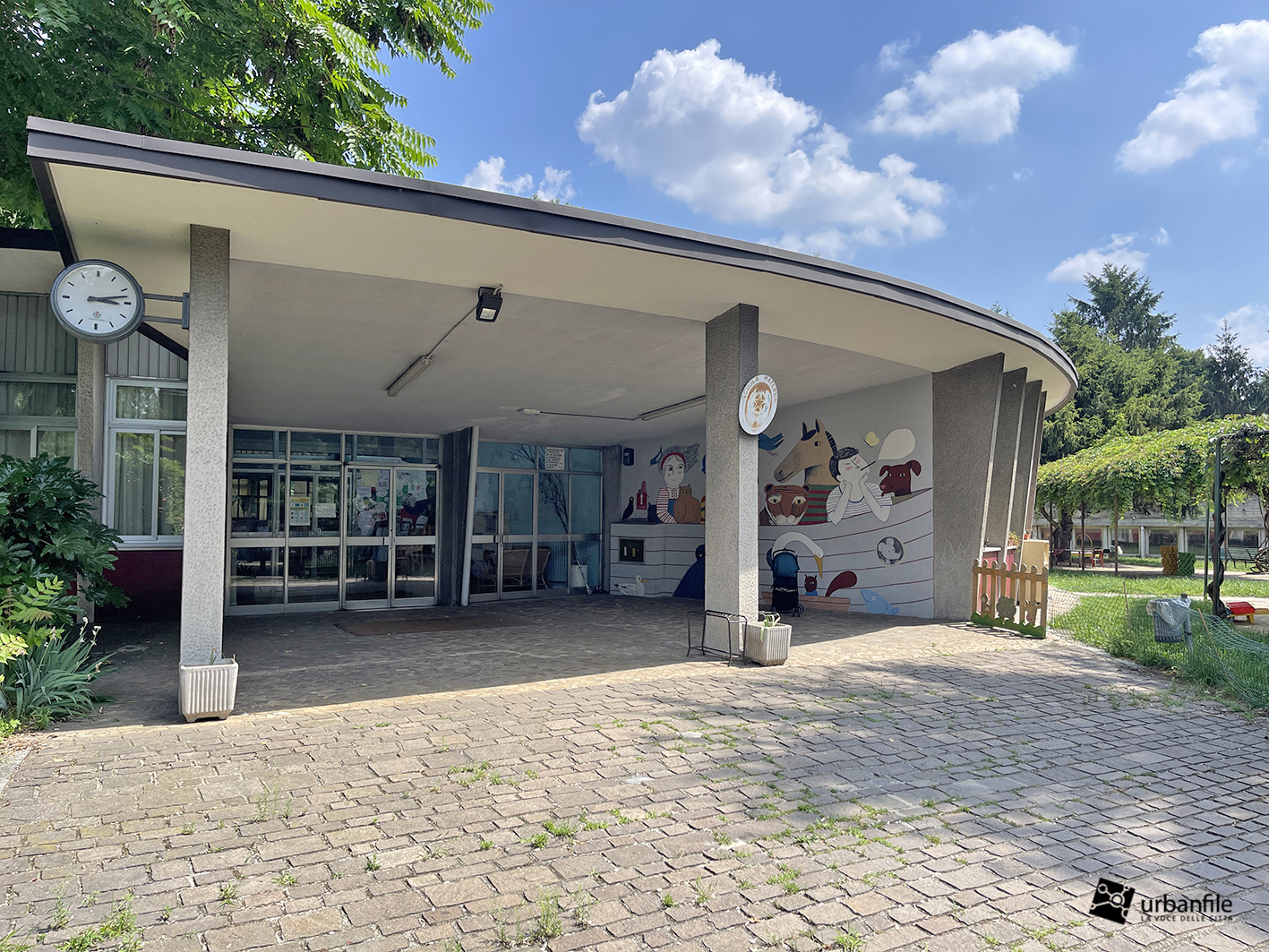 Anche l’edificio per la Scuola Materna Comunale di via Console Marcello 7, venne realizzato nel 1961sempre da Arrighetti. Qui l’architettura di Arrighetti ha escogitato la forma circolare posta al centro di un giardinetto recintato. Anche in questo caso, forse, ci vorrebbe un po’ più di rispetto per il luogo, visto che il porticato secondario è utilizzato come deposito.