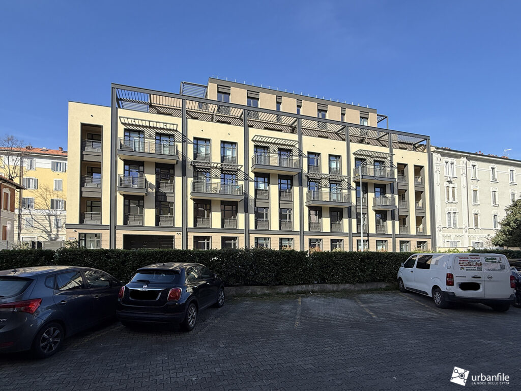 Il nuovo edificio, caratterizzato da una pianta a forma di punto interrogativo, presenta ampi balconi affacciati verso l’interno, mentre sul fronte strada la facciata è scandita verticalmente da finestre a tutta altezza, poggioli, logge e terrazzi di generose dimensioni. Una struttura metallica di raccordo unifica l’insieme architettonico, includendo anche l’ampio terrazzo al quarto e al quinto piano.