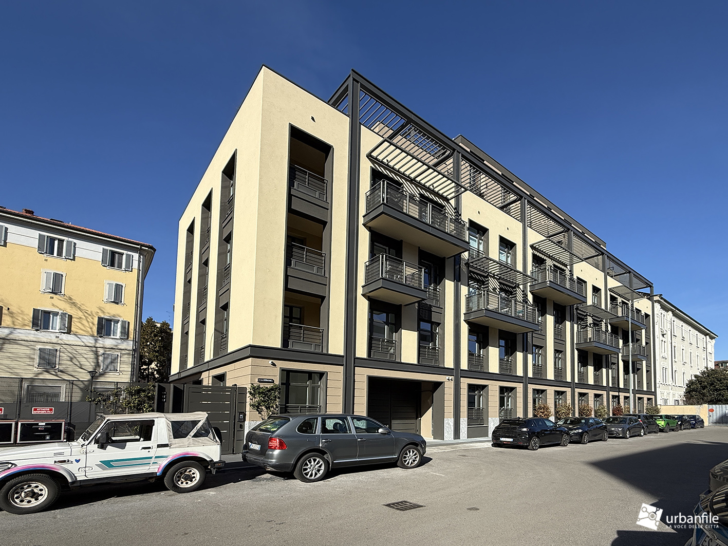 Il nuovo edificio, caratterizzato da una pianta a forma di punto interrogativo, presenta ampi balconi affacciati verso l’interno, mentre sul fronte strada la facciata è scandita verticalmente da finestre a tutta altezza, poggioli, logge e terrazzi di generose dimensioni. Una struttura metallica di raccordo unifica l’insieme architettonico, includendo anche l’ampio terrazzo al quarto e al quinto piano.