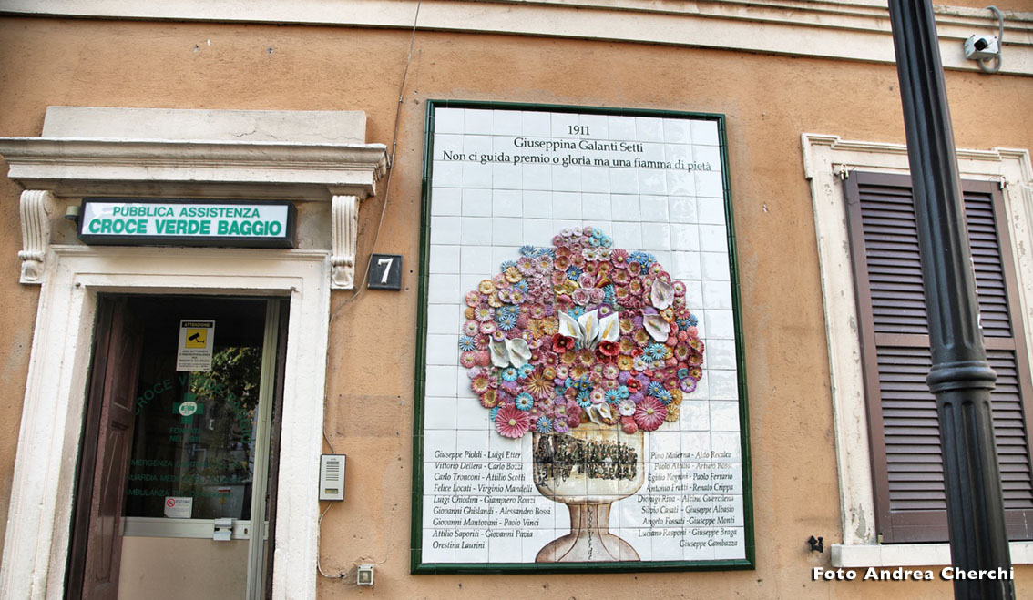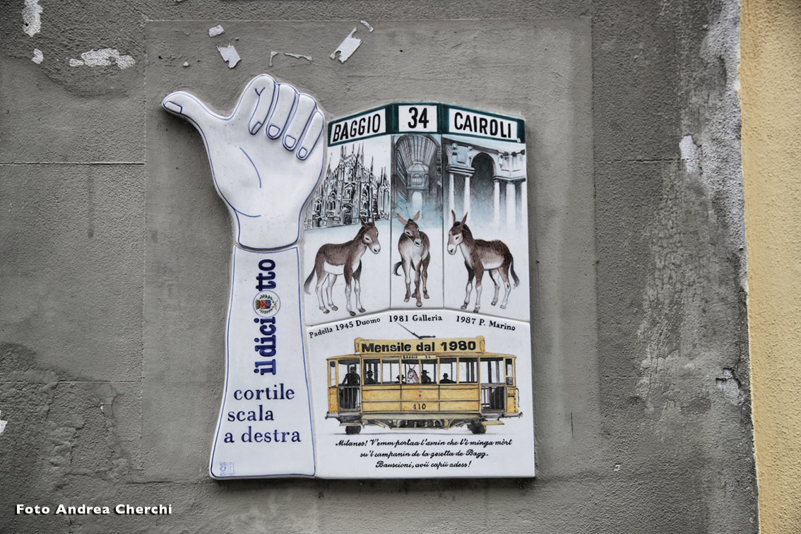 Sul vecchio municipio si vede uno delle tante “composizioni artistiche in ceramica” che abbelliscono dal 2004 le pareti di alcune case dell’antico centro storico di Baggio. Si tratta del progetto denominato “le grandi ceramiche baggesi”, partito nel 2004 con la posa delle prime sei ceramiche in Via Ceriani raffiguranti cinque immagini dei racconti legati al detto “va a Bagg a sonà l’orghen”. Promotore dell’iniziativa il mensile Il diciotto. Attualmente sono visibili 37 racconti parietali che coprono una superficie pari a circa 150 metri quadrati distribuiti tra le vie del centro storico. La loro realizzazione è stata curata da importanti scuole artigiane nazionali (Lodi, Brisighella, Salerno e Caltagirone) e raffigurano episodi della storia baggese e del territorio circostante.