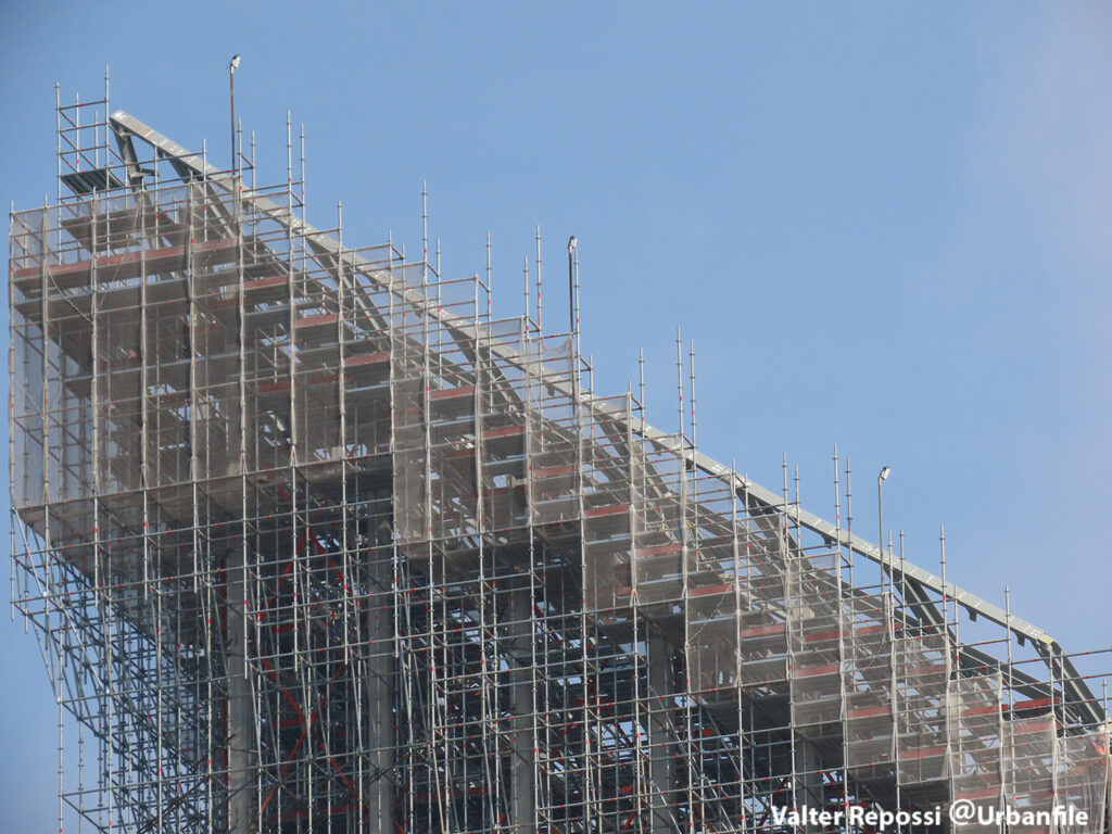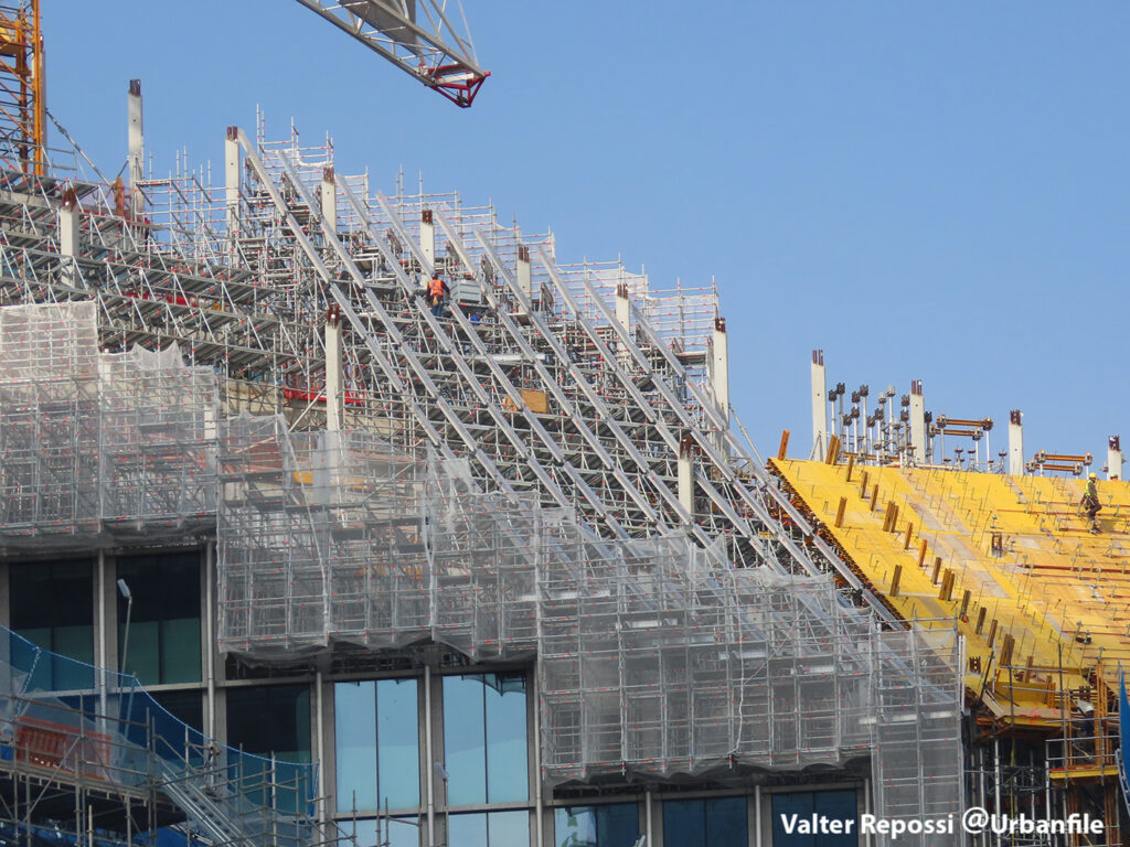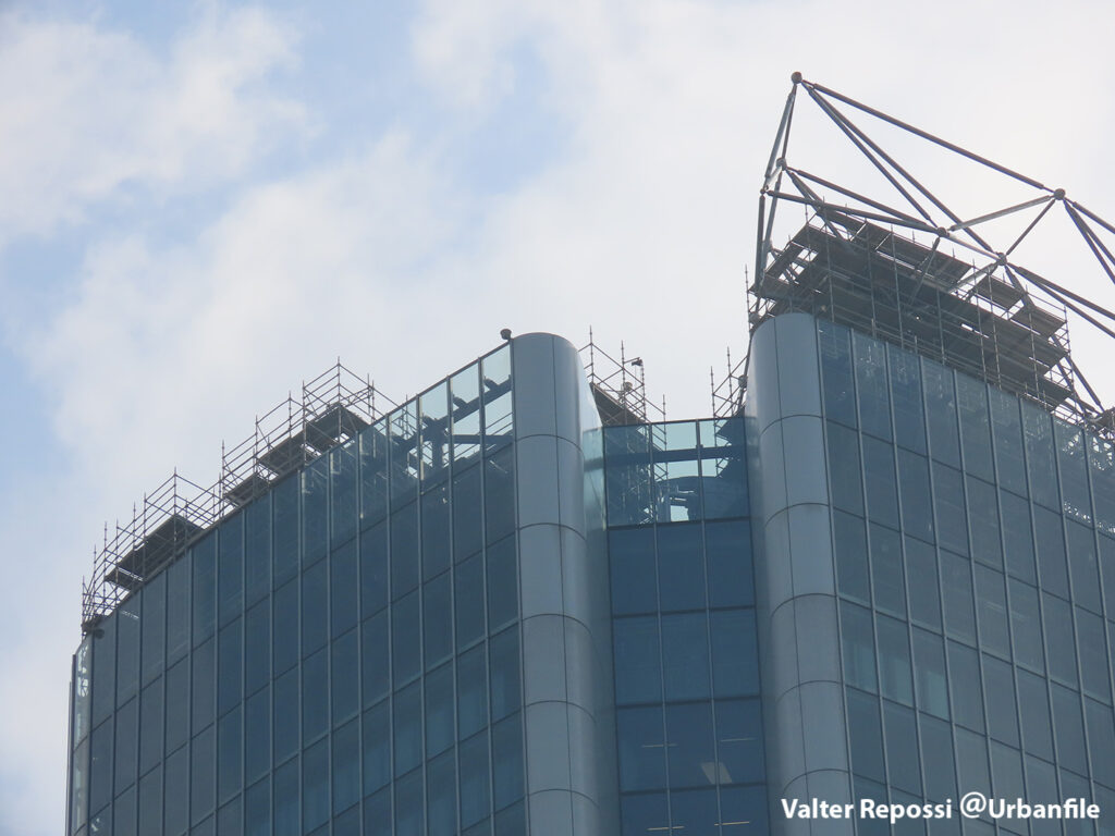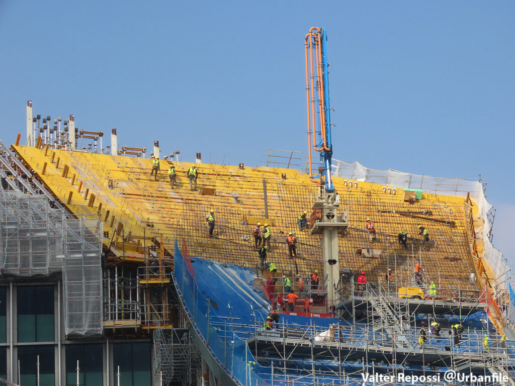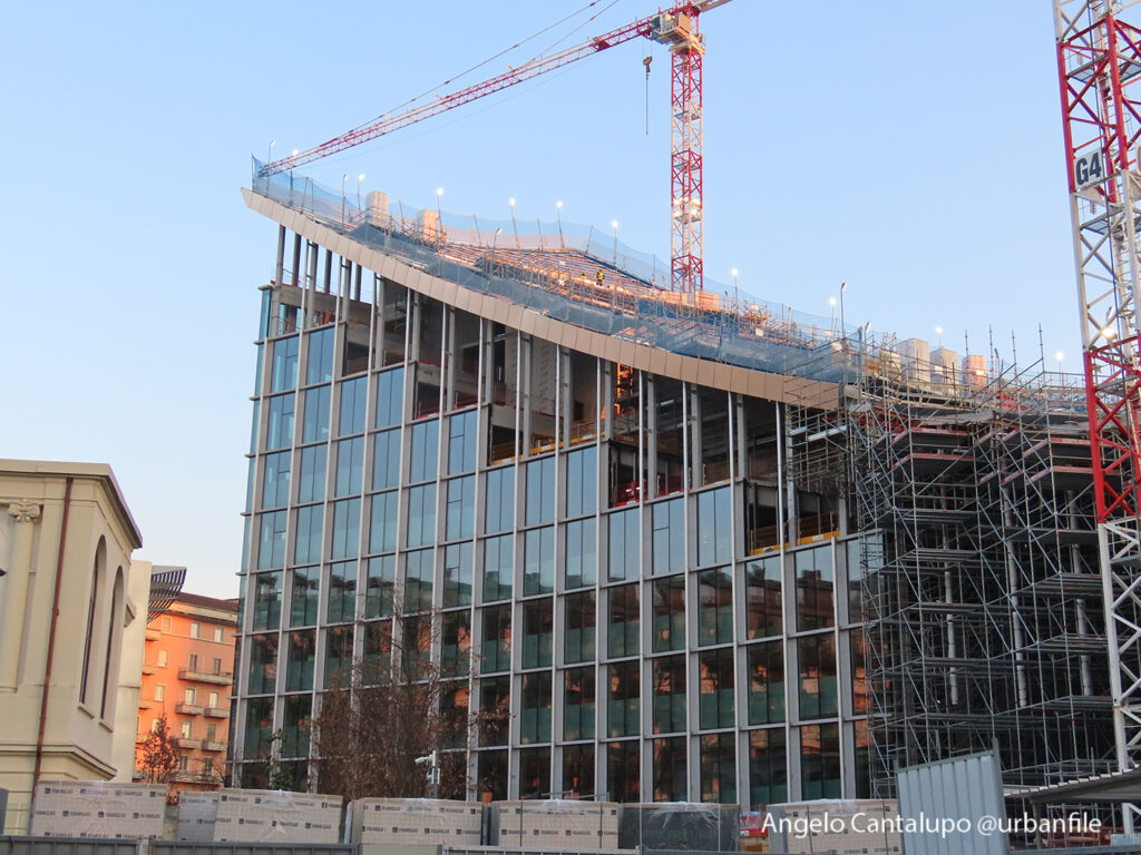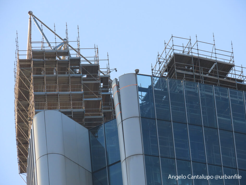 Proseguono i lavori al CityWave, oltre al montaggio delle vetrate delle facciate, anche quelli per completare la copertura del tetto e l’incredibile e complessa tettoia (canopy) che come un “telo” unirà le due torri del nuovo edificio per uffici in realizzazione nell’area verso largo Domodossola.