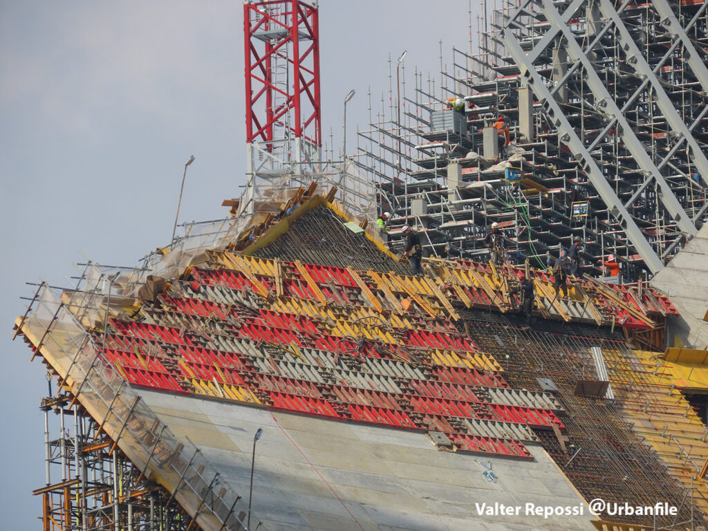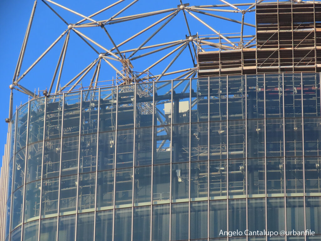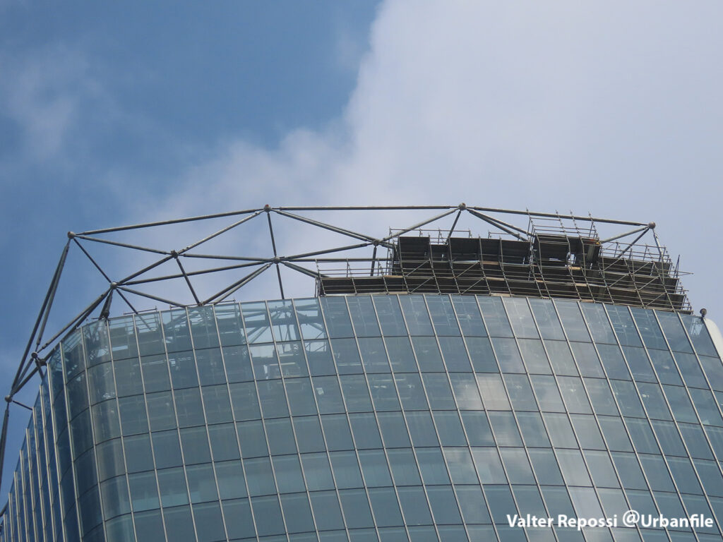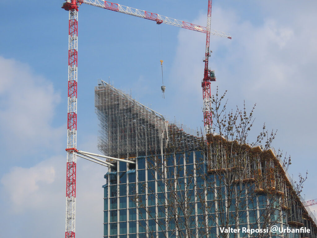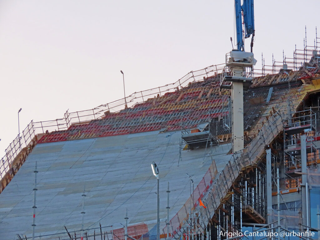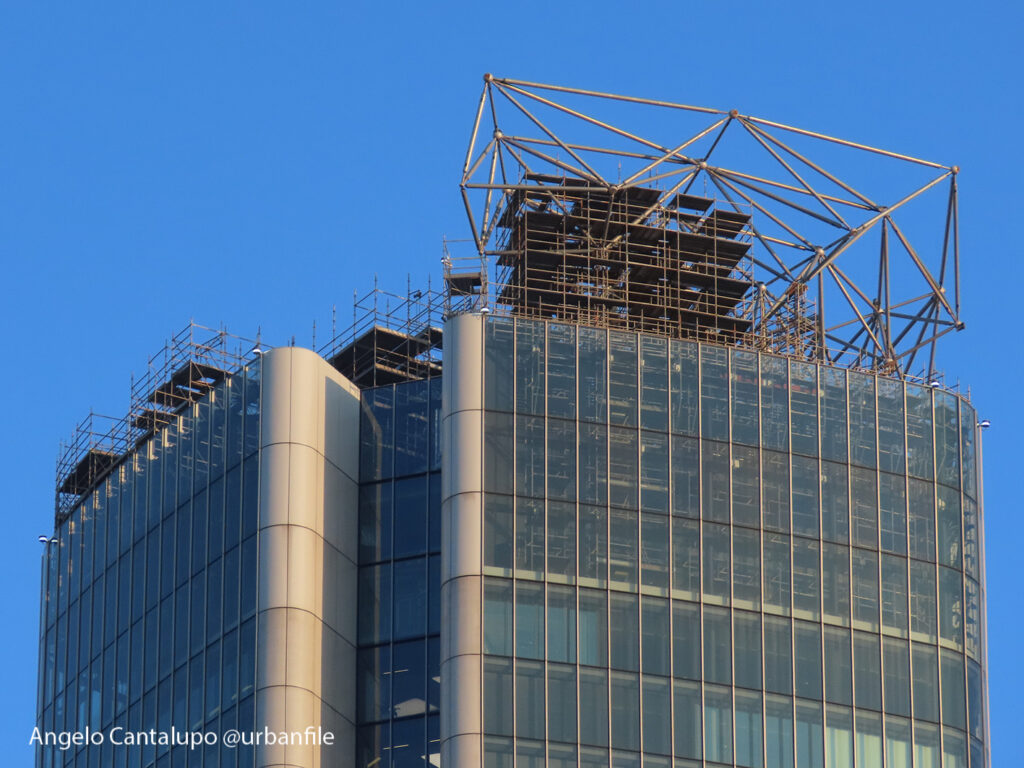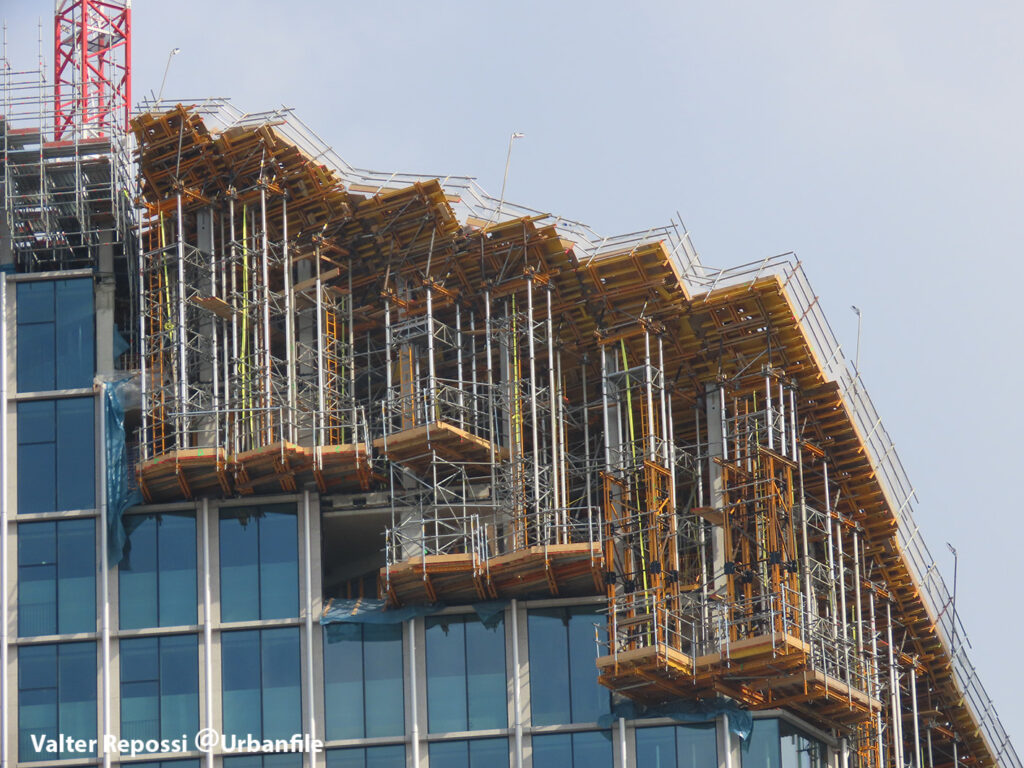 Proseguono i lavori al CityWave, oltre al montaggio delle vetrate delle facciate, anche quelli per completare la copertura del tetto e l’incredibile e complessa tettoia (canopy) che come un “telo” unirà le due torri del nuovo edificio per uffici in realizzazione nell’area verso largo Domodossola.