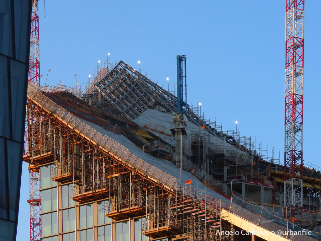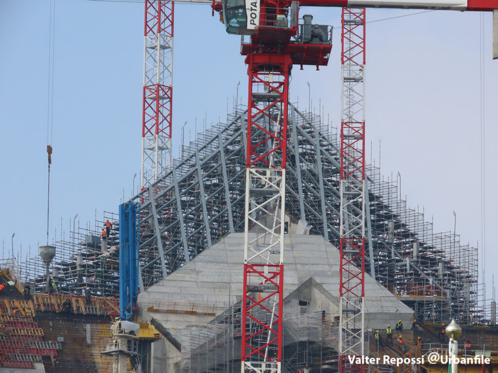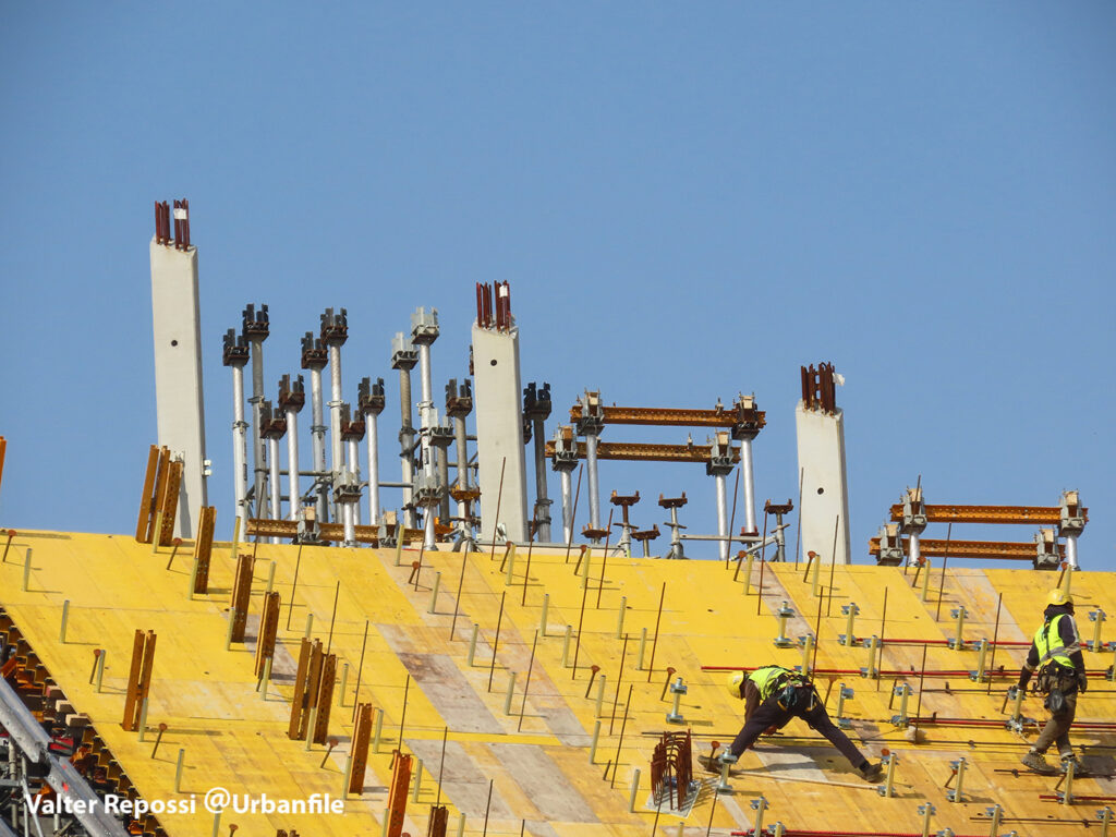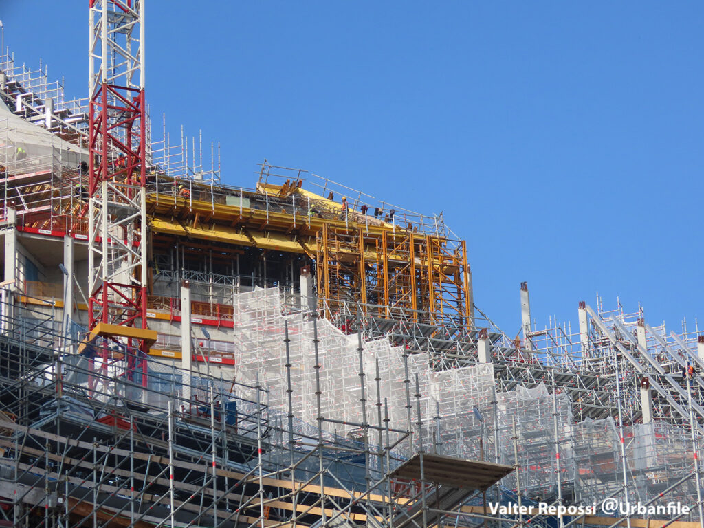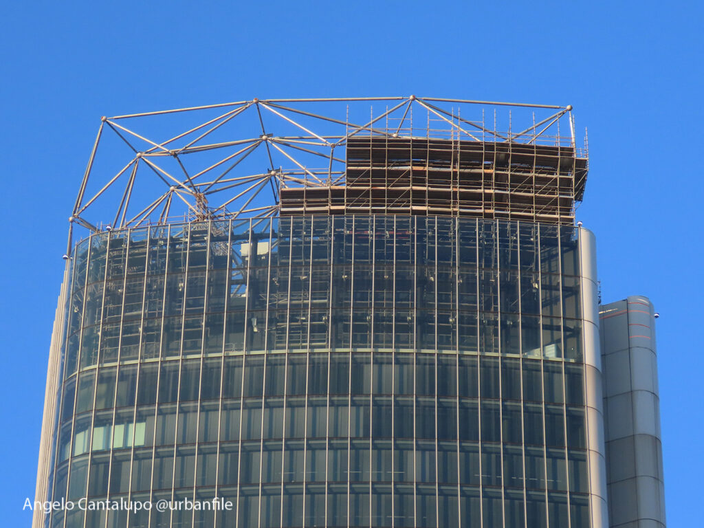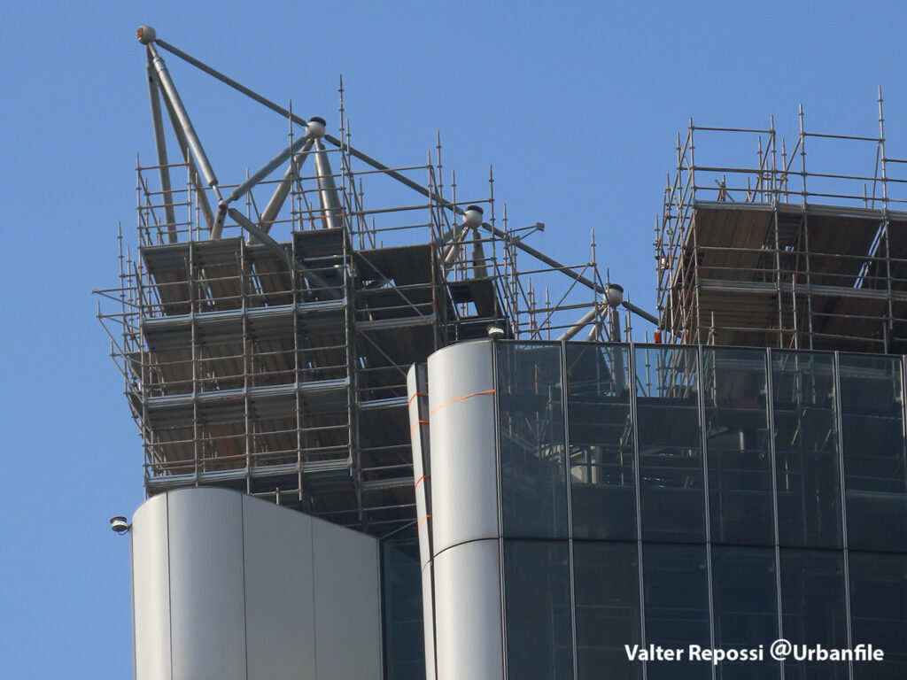 Proseguono i lavori al CityWave, oltre al montaggio delle vetrate delle facciate, anche quelli per completare la copertura del tetto e l’incredibile e complessa tettoia (canopy) che come un “telo” unirà le due torri del nuovo edificio per uffici in realizzazione nell’area verso largo Domodossola.
